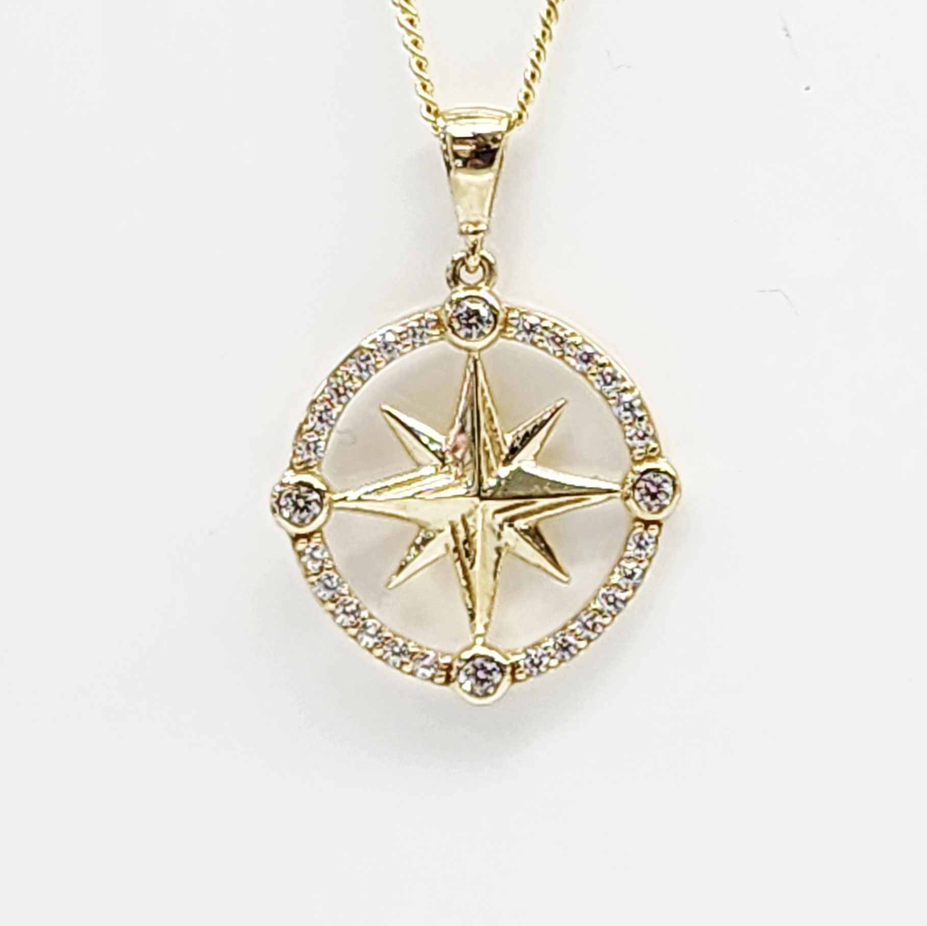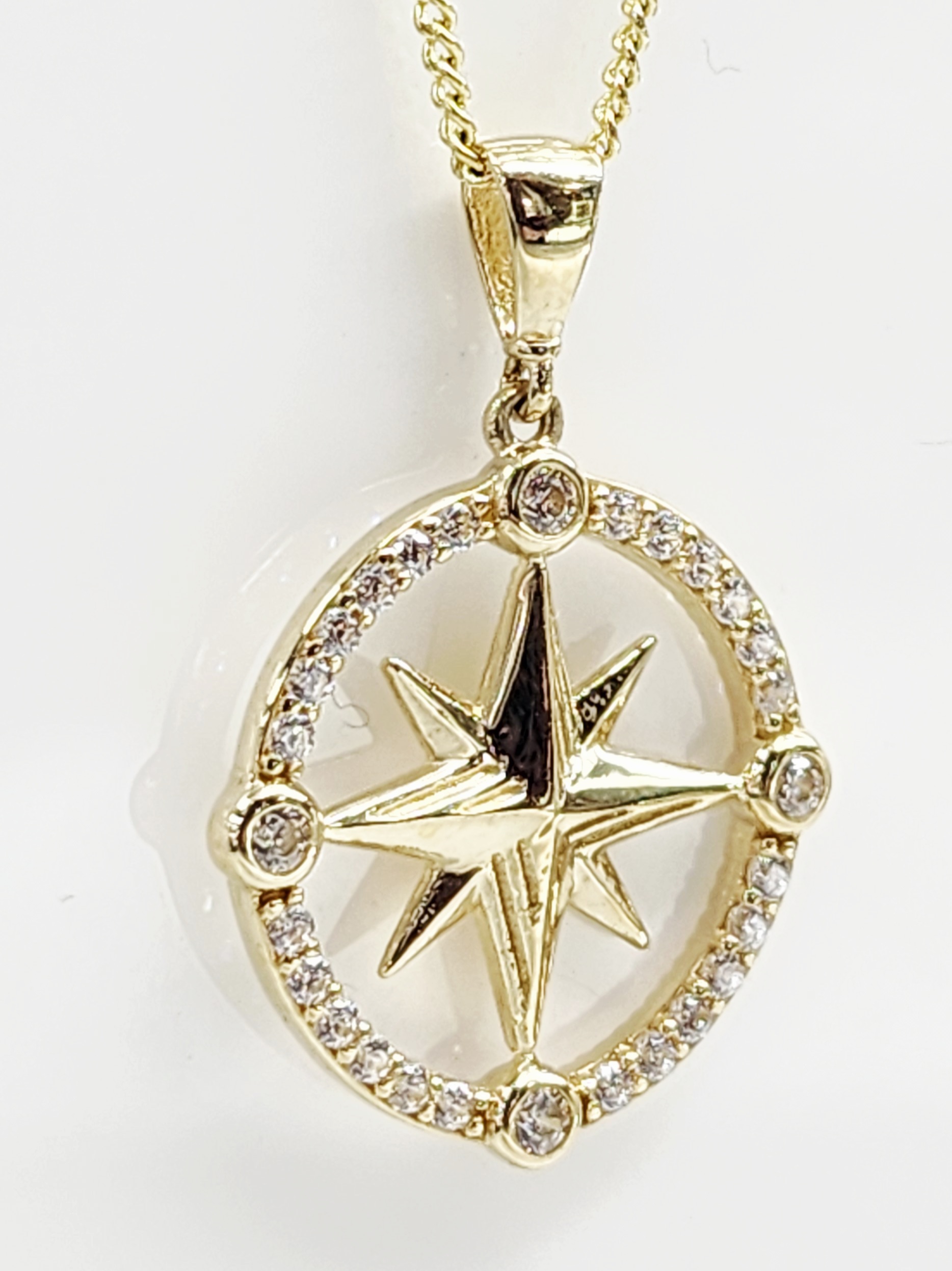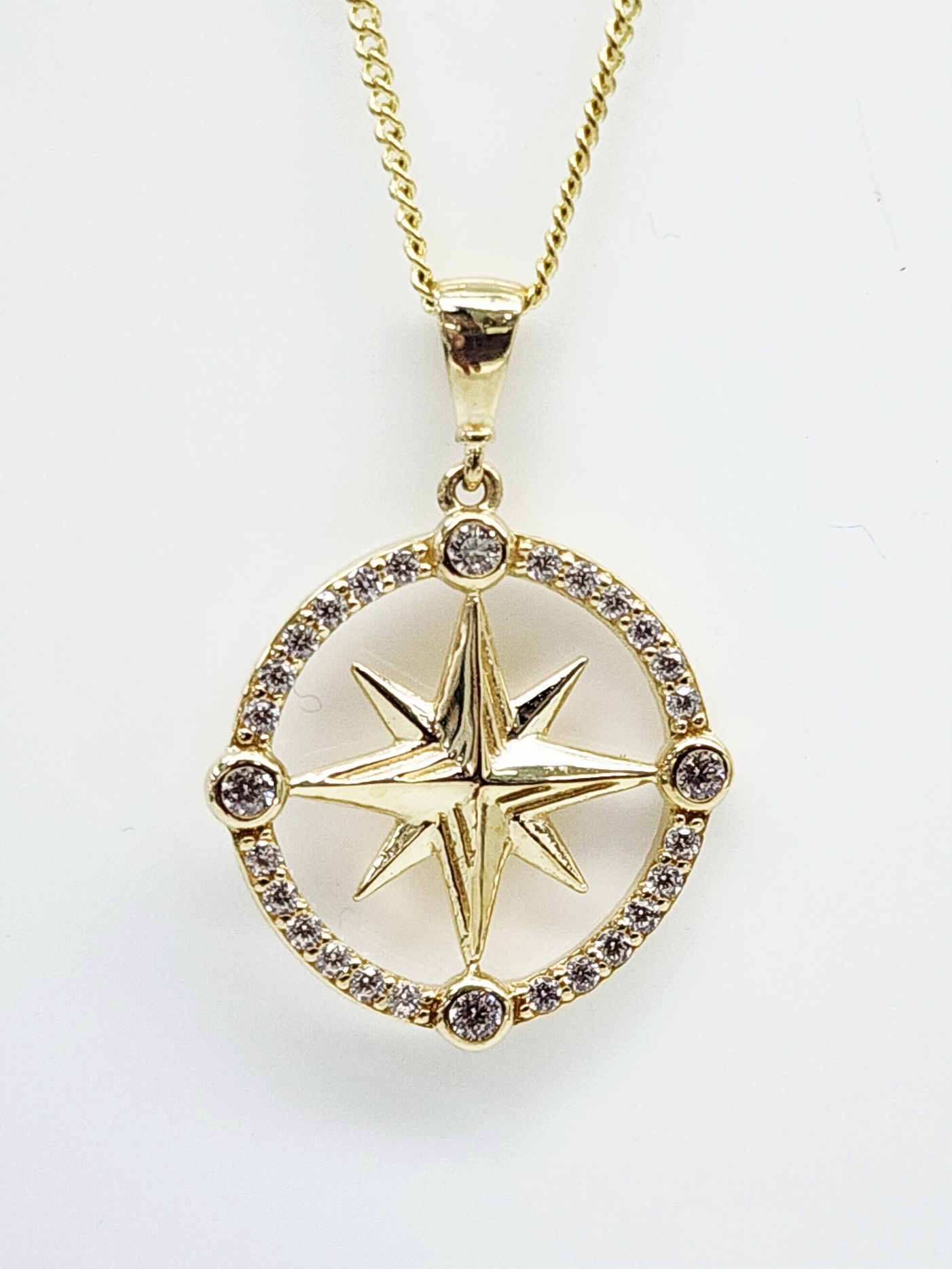 The pendant features a finely detailed eight-point compass star encased within a sparkling cubic zirconia–set circular frame. Measuring 18mm round (including the outer edge), it is further enhanced by four bezel-set CZ stones placed at the cardinal points, adding extra brilliance and balance to the design.