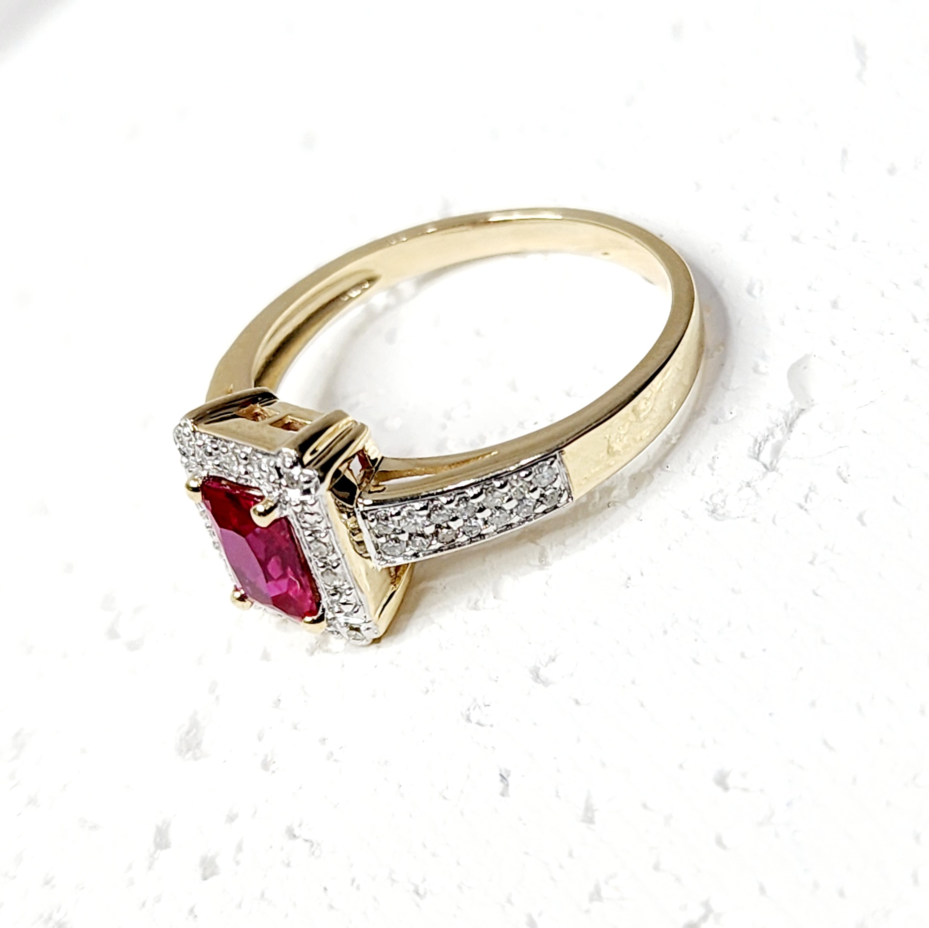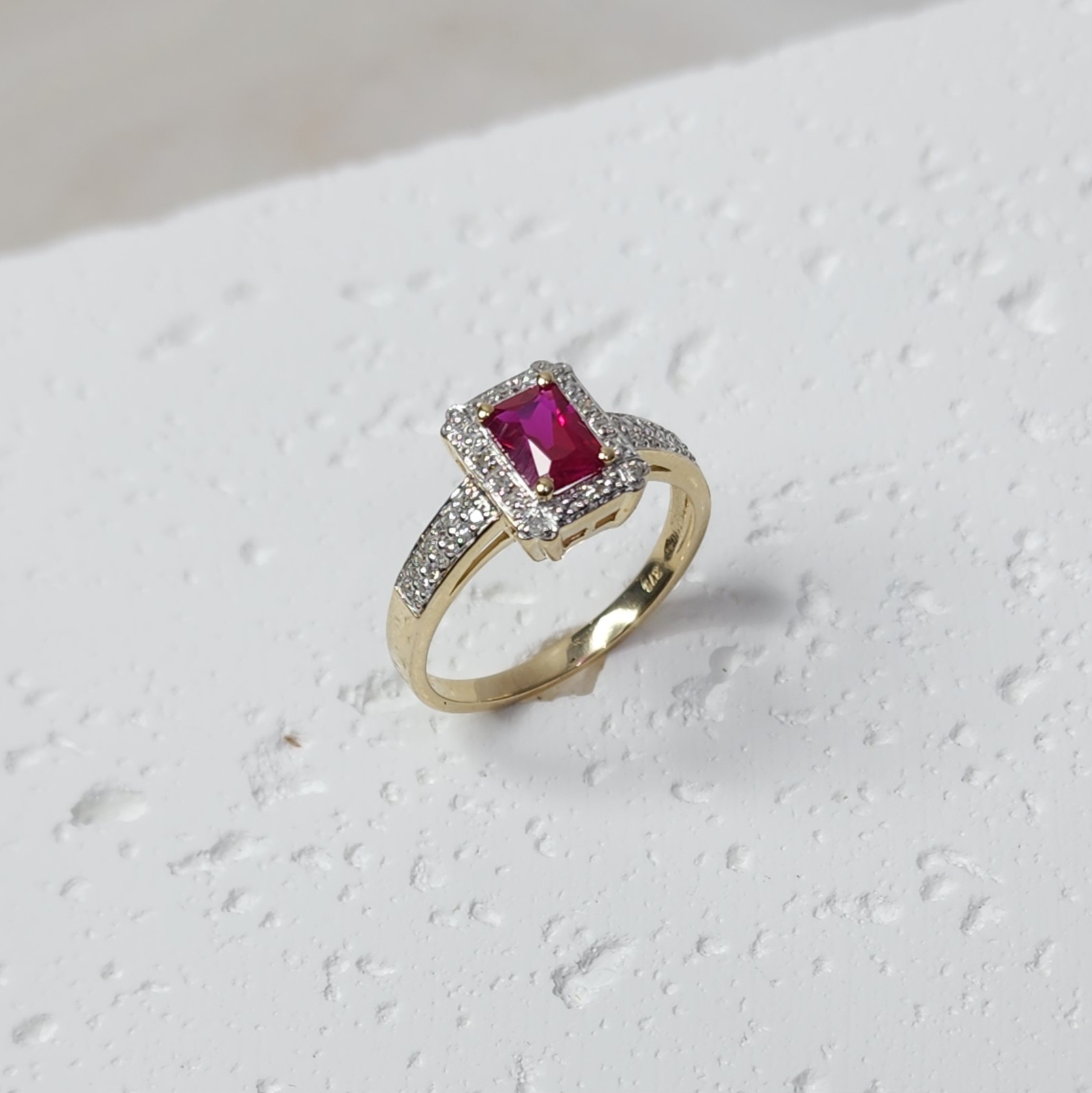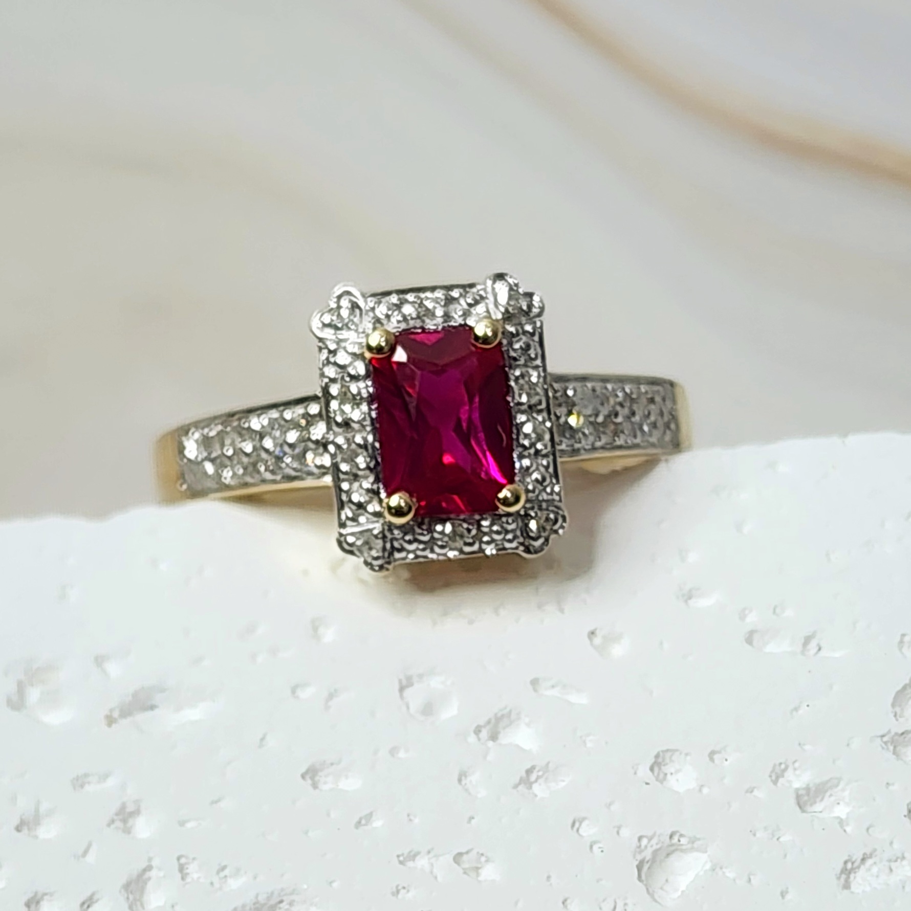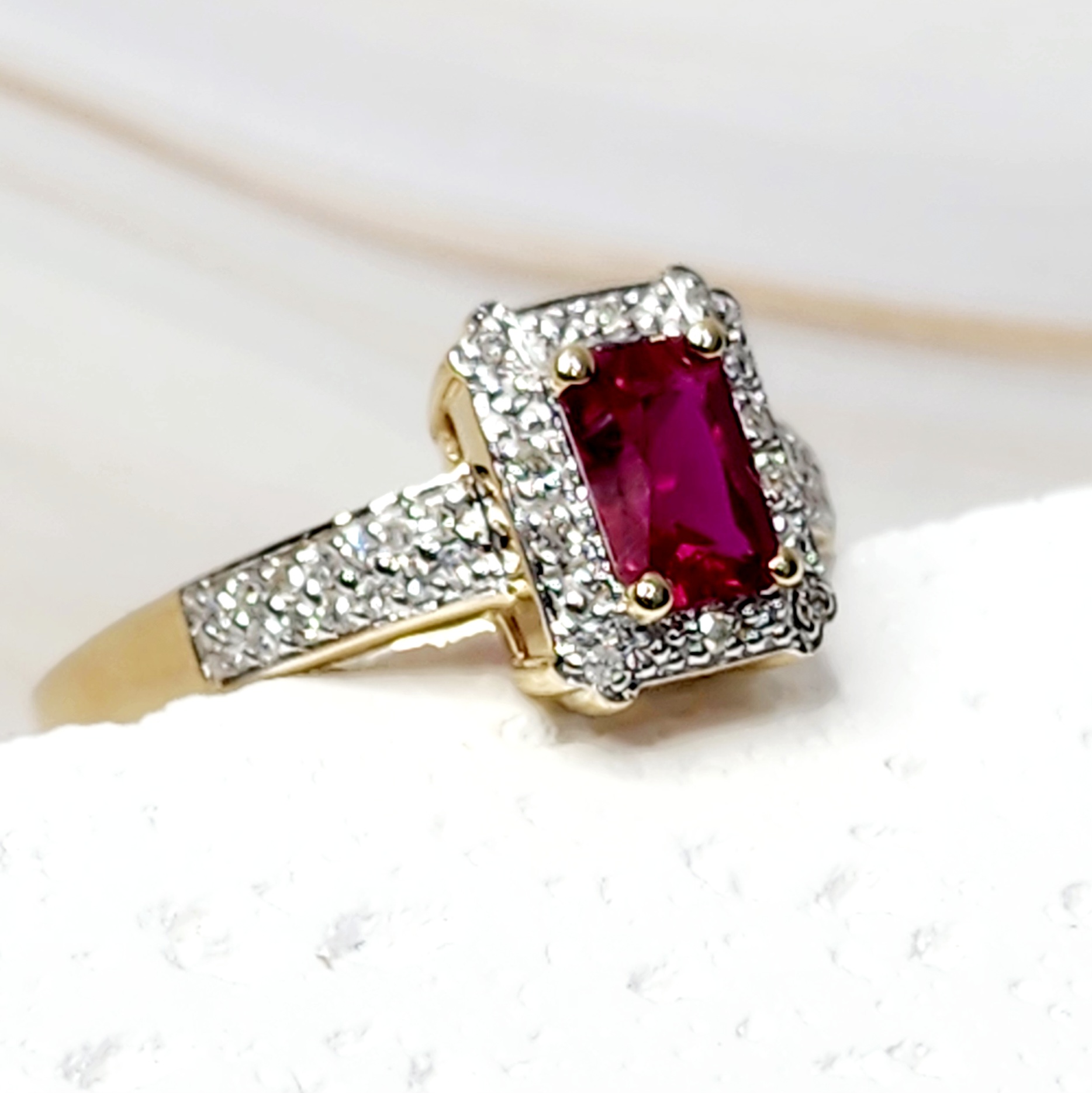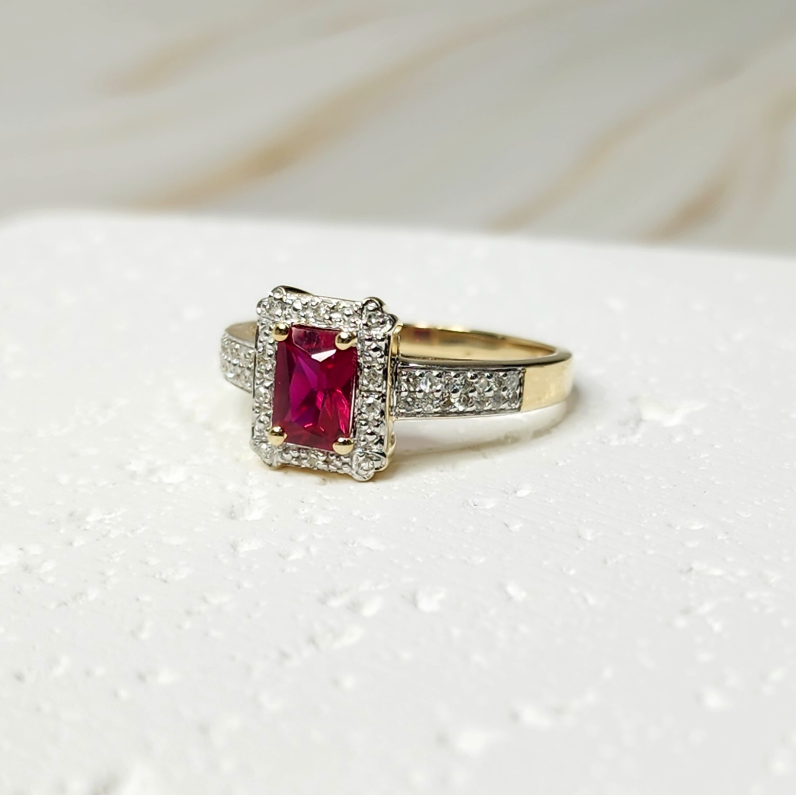 9ct Yellow Gold Dress Ring with Emerald Cut Created Ruby Center Stone and Diamond Halo Setting