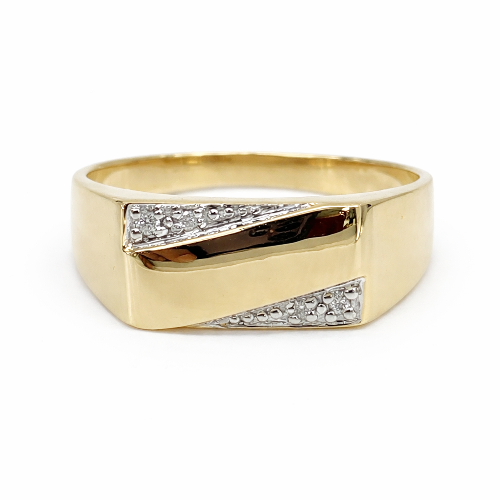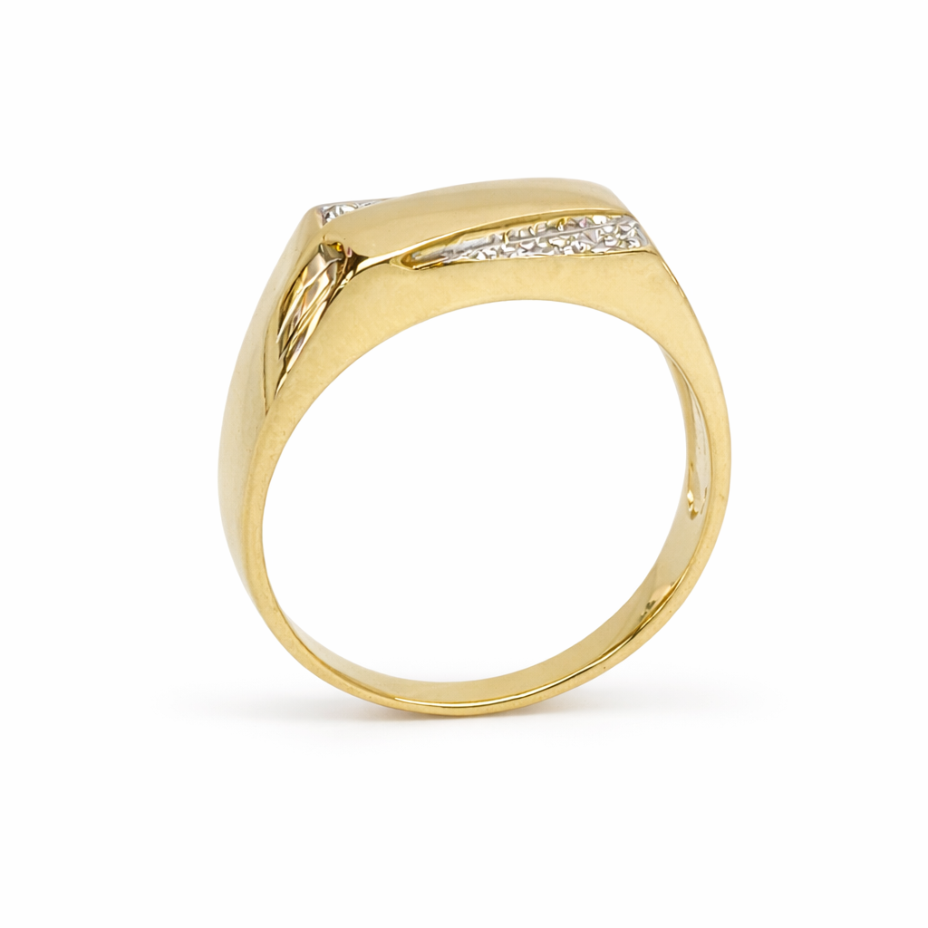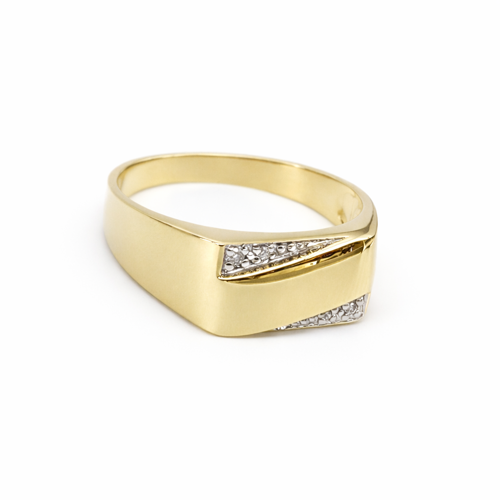 Make a strong, refined statement with this modern 9ct yellow gold gents signet ring, finished in a high-polish shine and highlighted with natural diamond sparkle. Designed with a bold rectangular top, this piece features a sleek angled panel detail that gives the ring a contemporary, masculine edge.