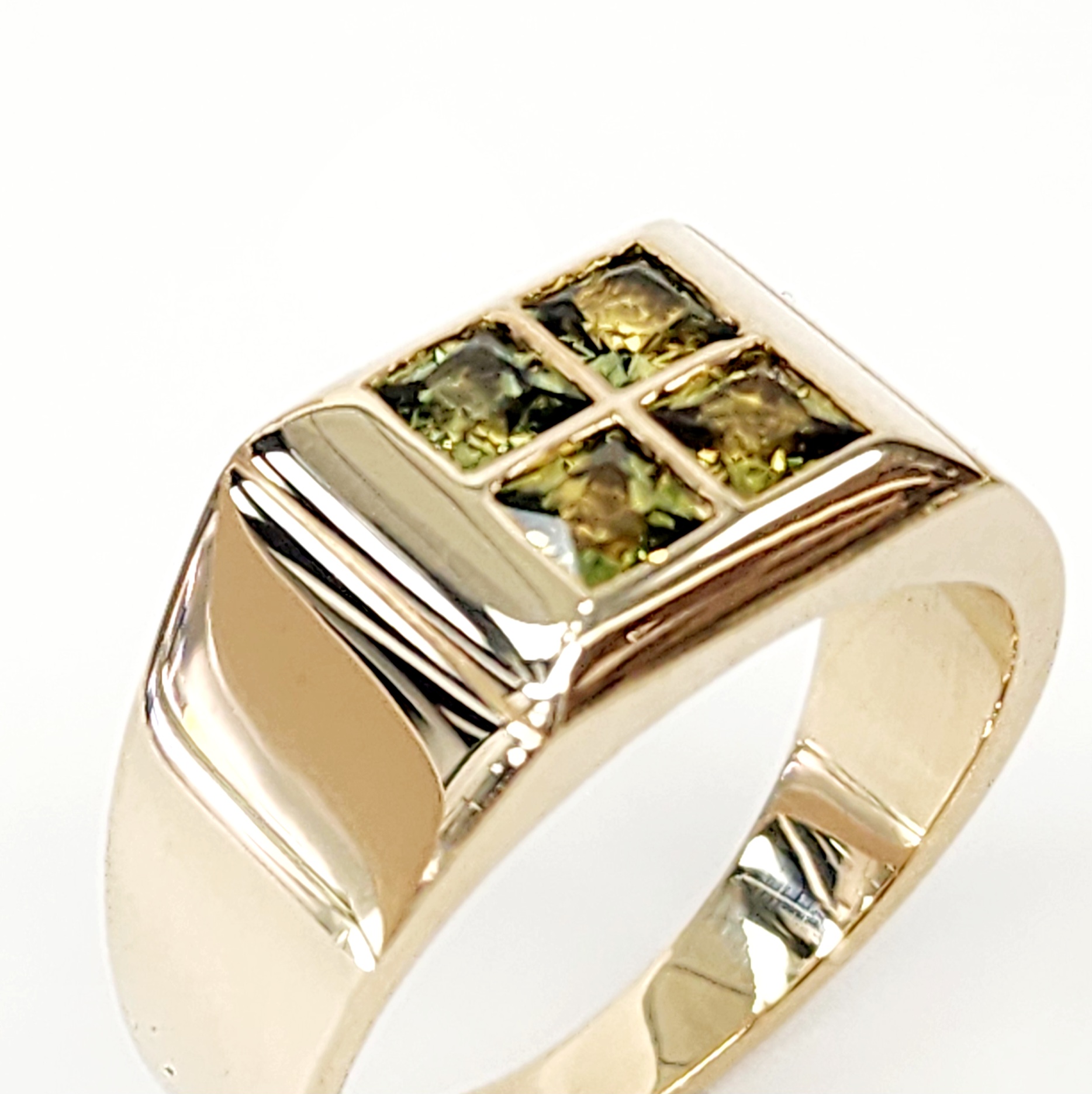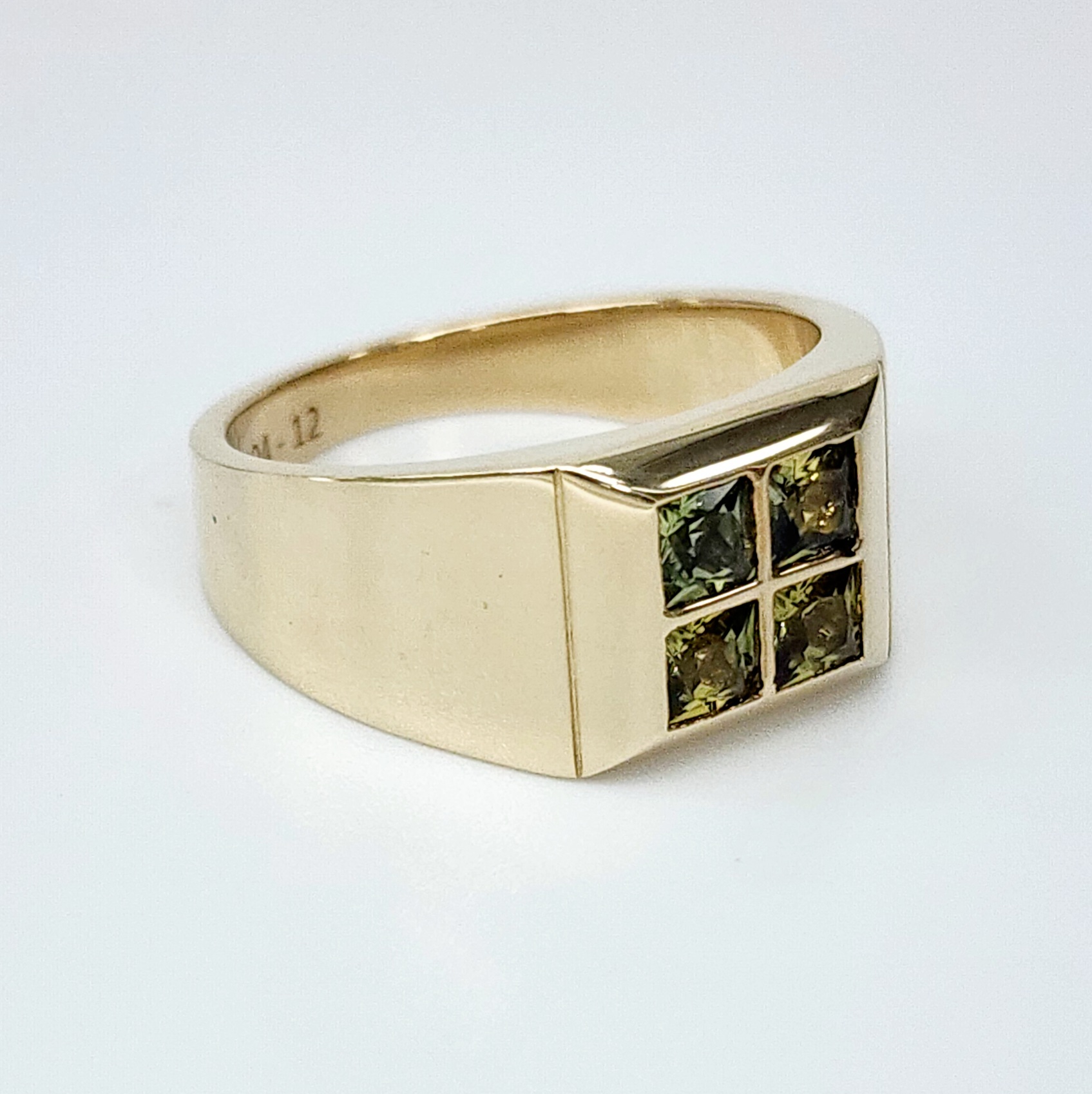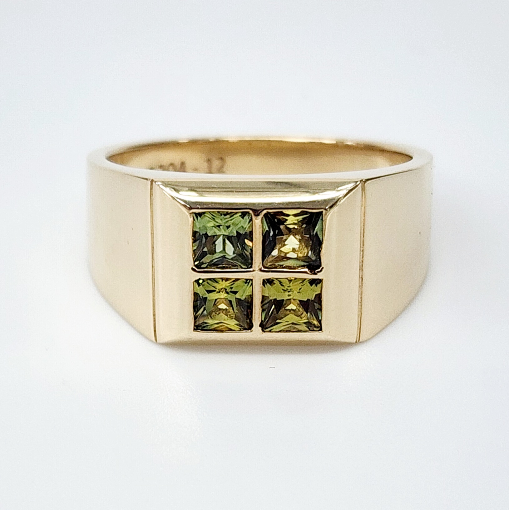 A true masterpiece of fine jewellery, this distinguished men’s signet ring is meticulously crafted in rich 9ct yellow gold, embodying timeless elegance and refined masculinity. The ring showcases four exceptional, natural Australian yellow sapphires, each 4mm x 4mm princess cut, precision-set in a sleek rubover setting that frames and protects the stones while enhancing their radiant golden hue.