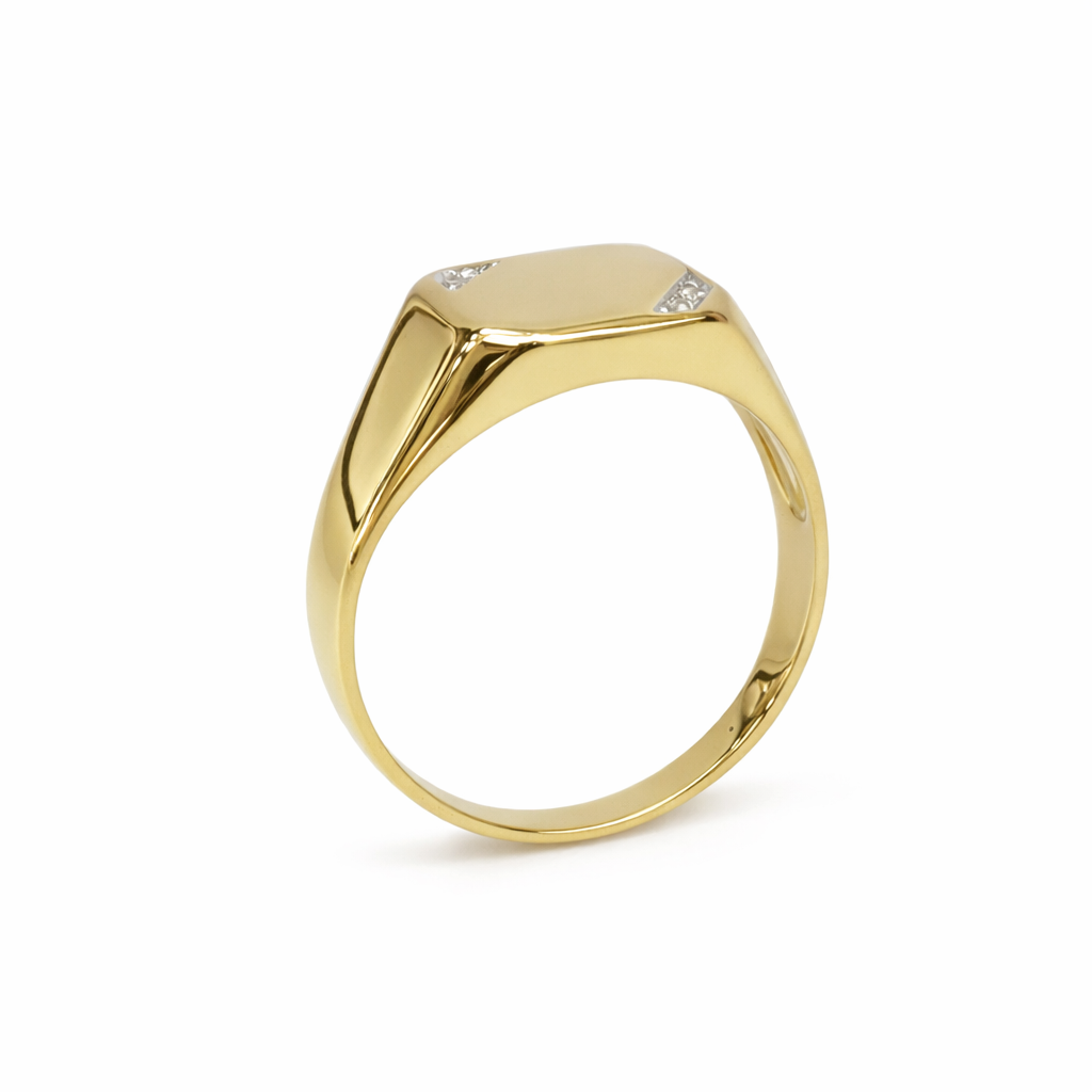 Make a confident statement with this classic gents signet-style ring, crafted in rich 9ct yellow gold and finished with a subtle touch of sparkle. Designed to suit both wedding wear and everyday dress styling, this ring delivers a clean, masculine profile with timeless appeal.