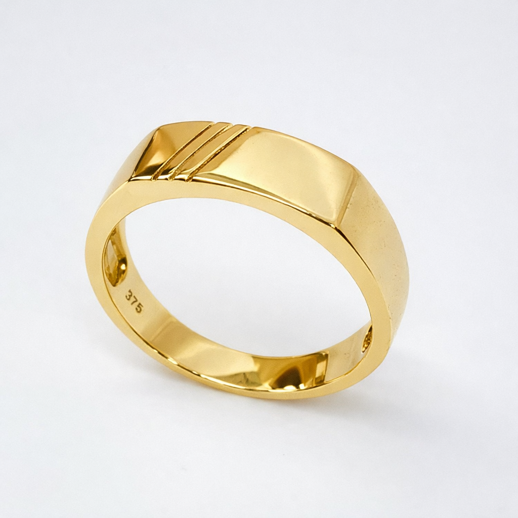 This sophisticated men’s signet ring is crafted in premium 9ct yellow gold, combining sleek geometry with refined detailing. The rectangular signet face measures 6.5mm wide x 16mm long, offering a slim yet commanding profile.