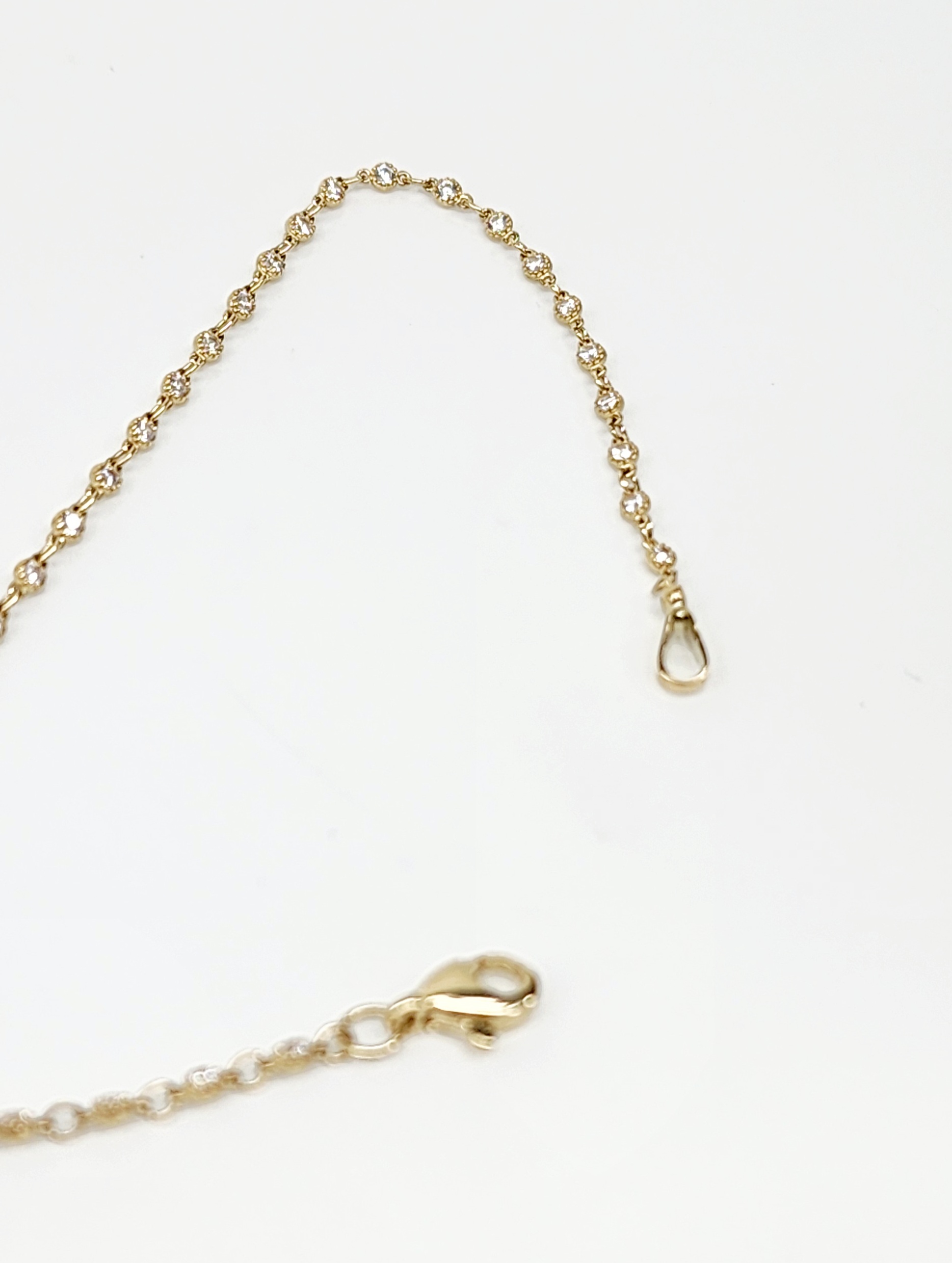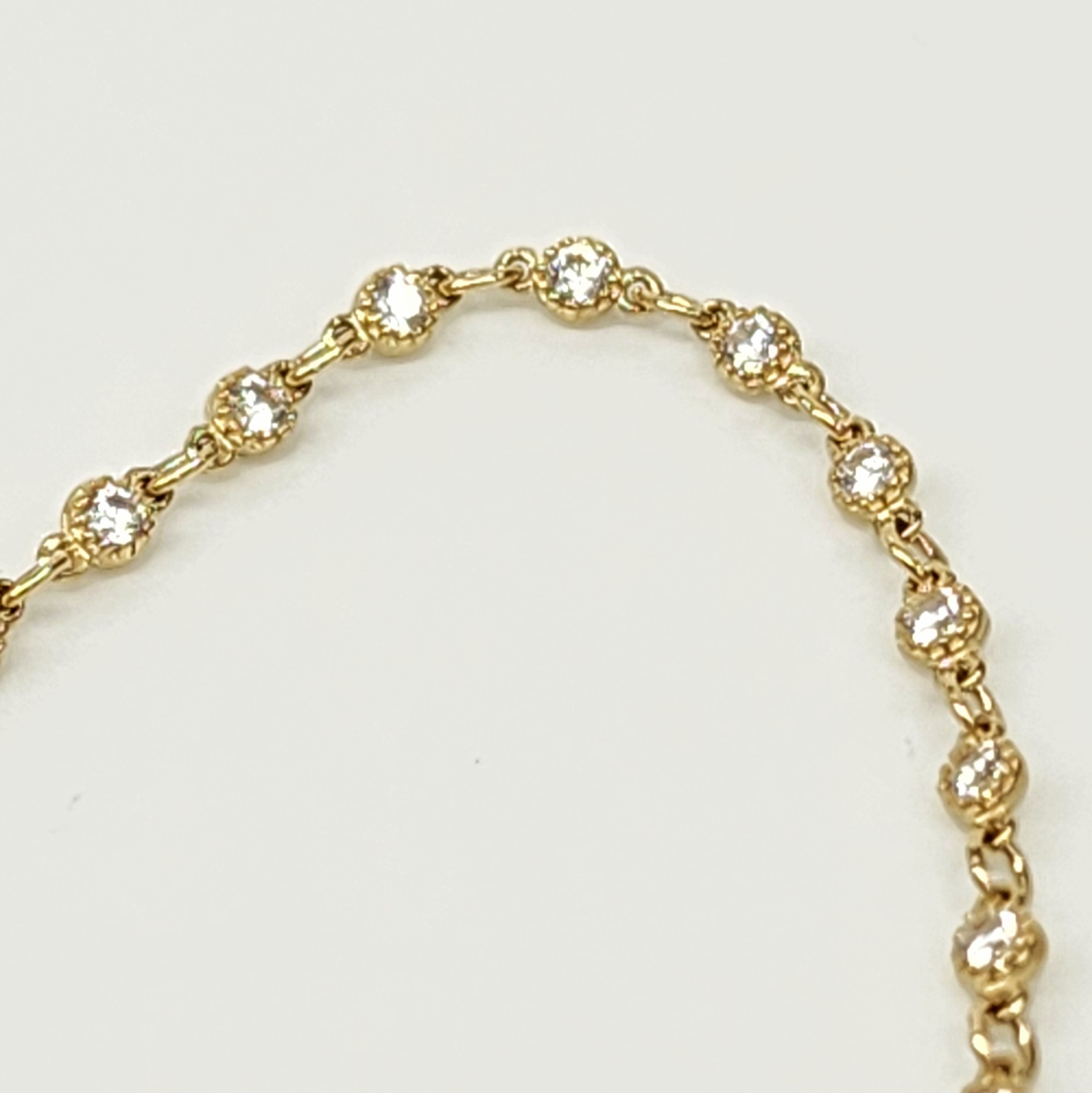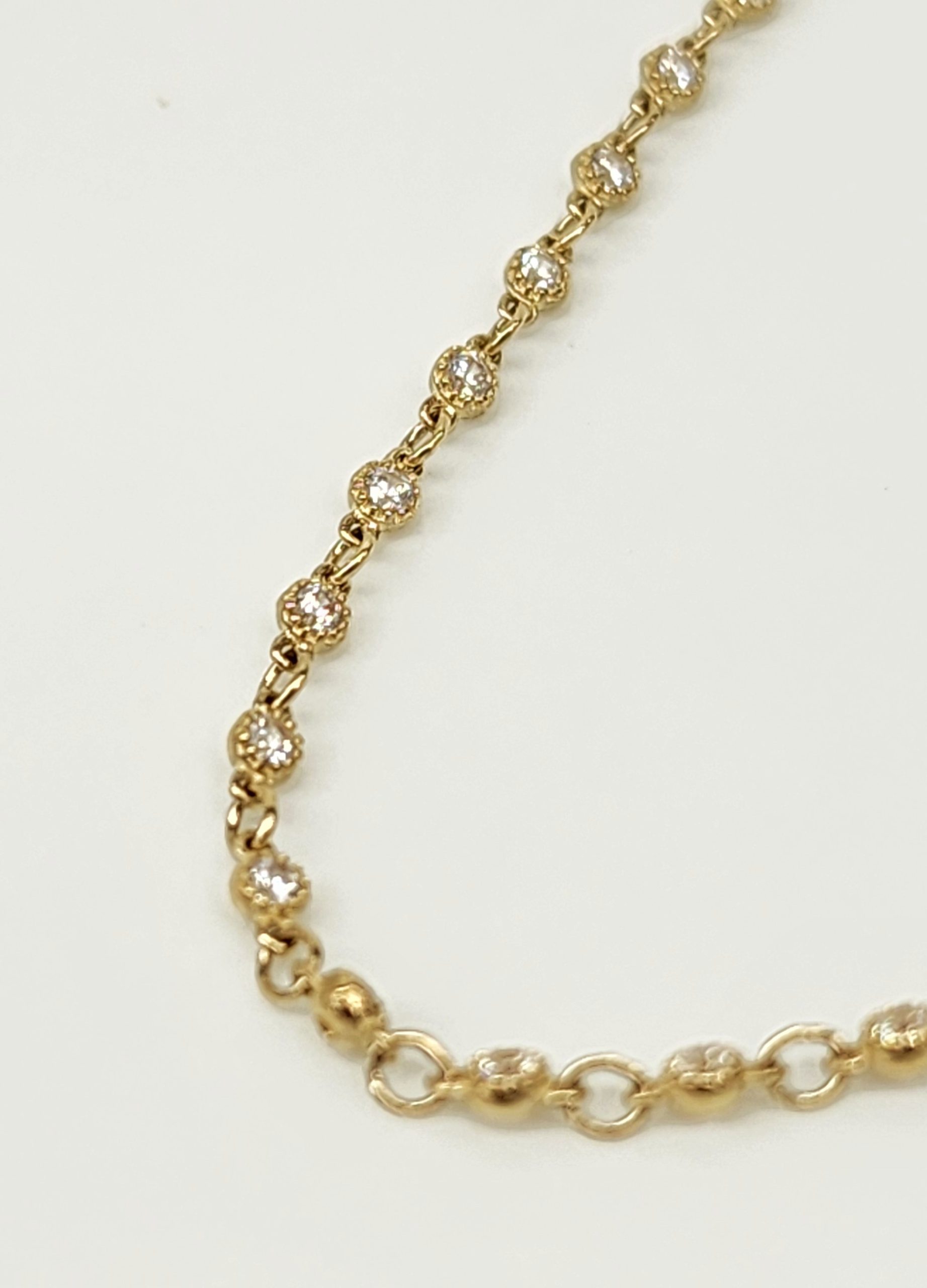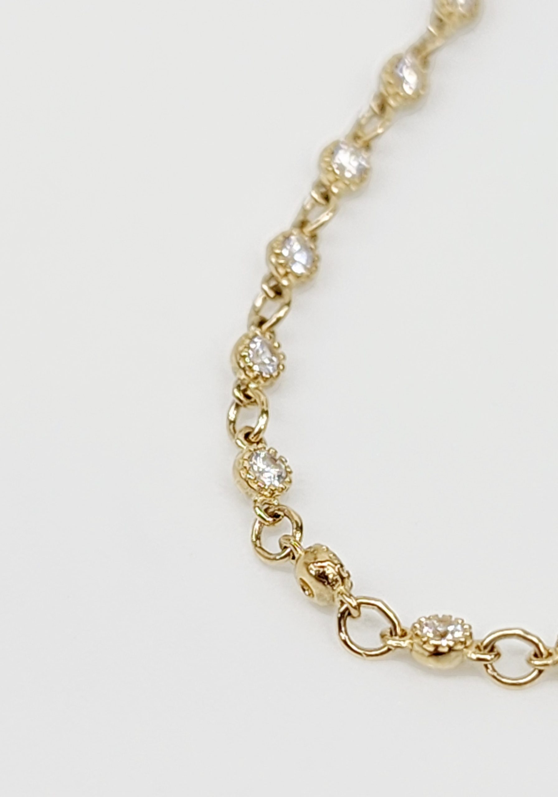 Repeating CZ set links along whole bracelet. CZ’s are with a beaded miligrain edge. 2mm wide.