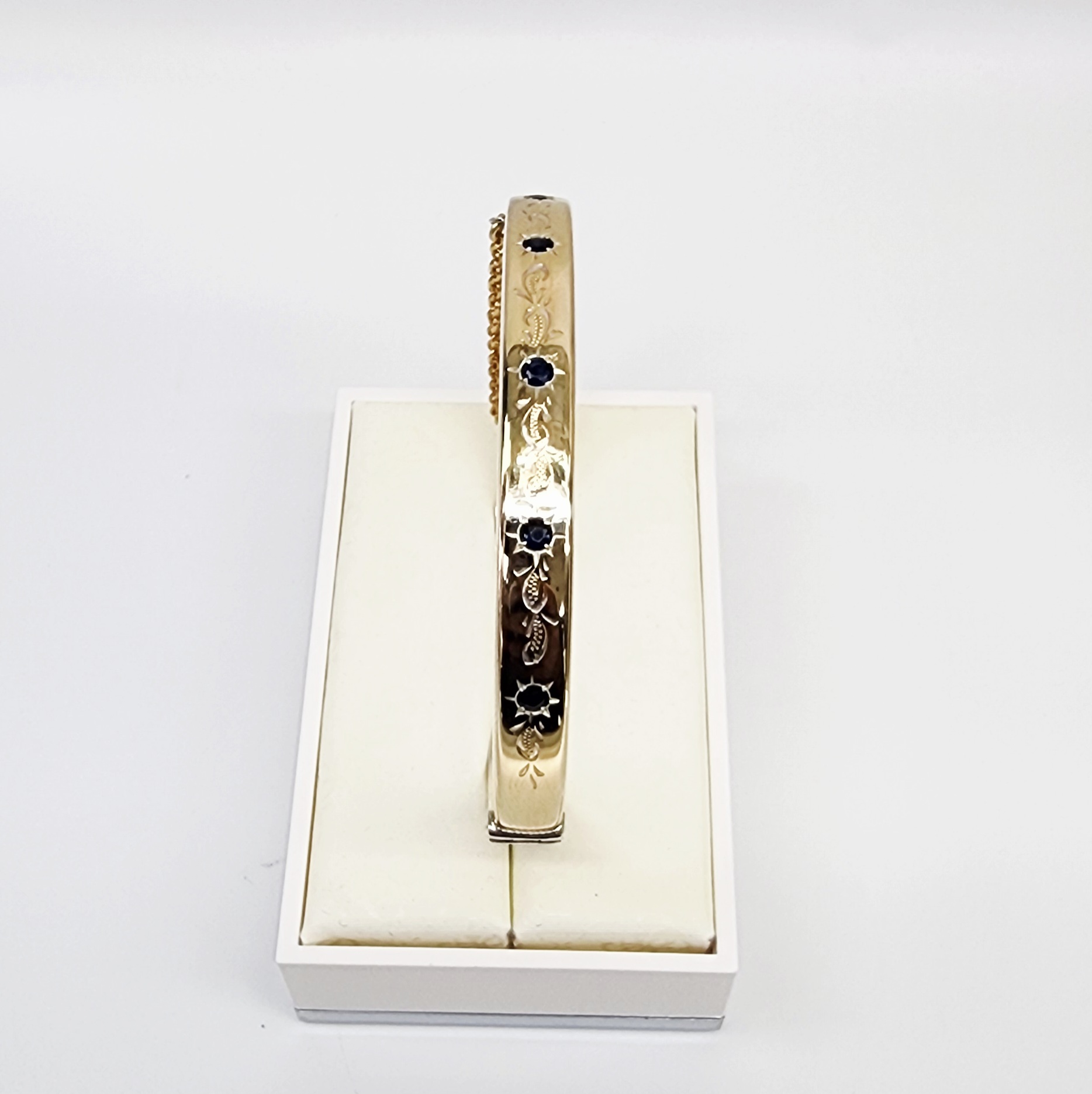 The gold overlay is enhanced with intricate hand-engraved detailing, showcasing classic artisan techniques and fine attention to detail. Set seamlessly within the engraved design are five round blue sapphire, each securely claw-set to maximise brilliance and protect the stones. The blue sapphire are elegantly spaced along the top half of the bangle, with flowing engraved patterns weaving gracefully between them, creating a harmonious rhythm of sparkle, texture, and depth.