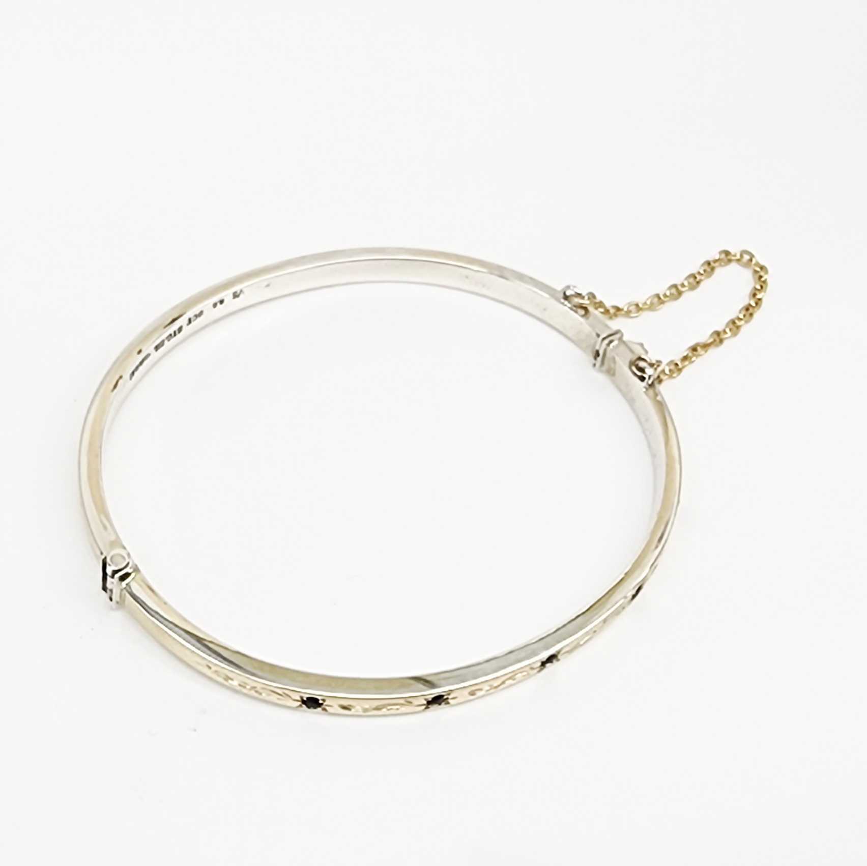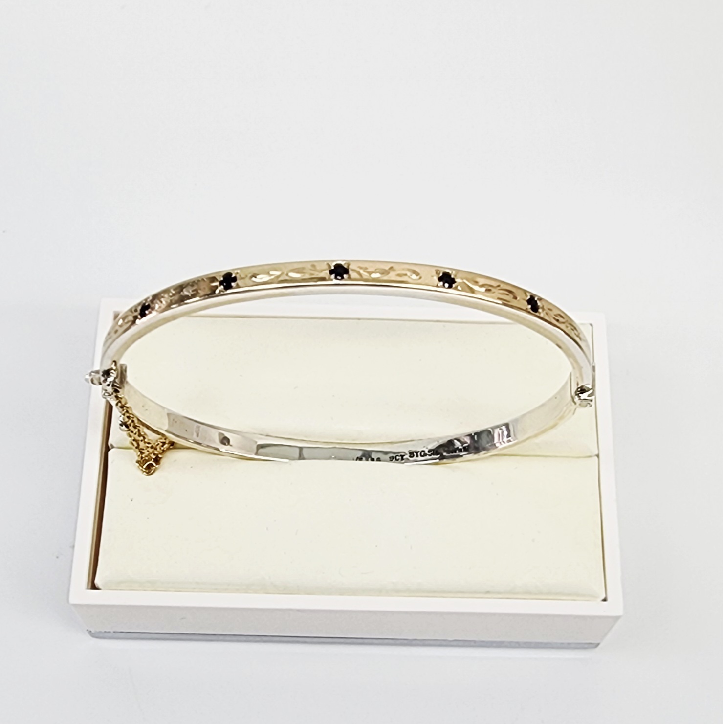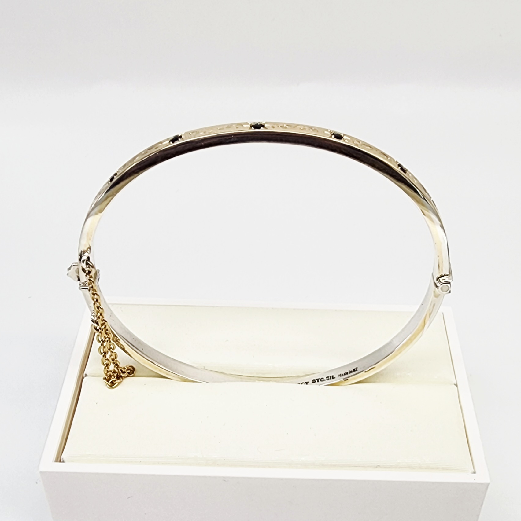 Designed for both beauty and practicality, the bangle is fitted with a snap/hinged clasp for effortless wear and includes a sterling silver safety chain for added security. Measuring 53mm x 61mm internally and 4mm wide, it offers a comfortable fit while maintaining a refined, elegant profile.