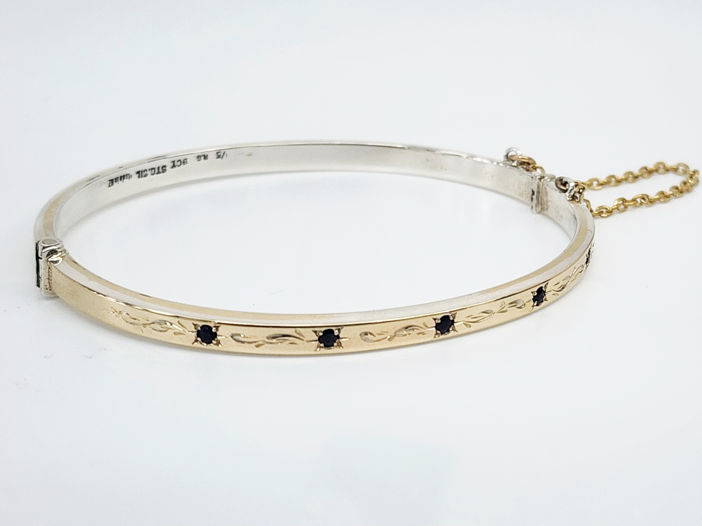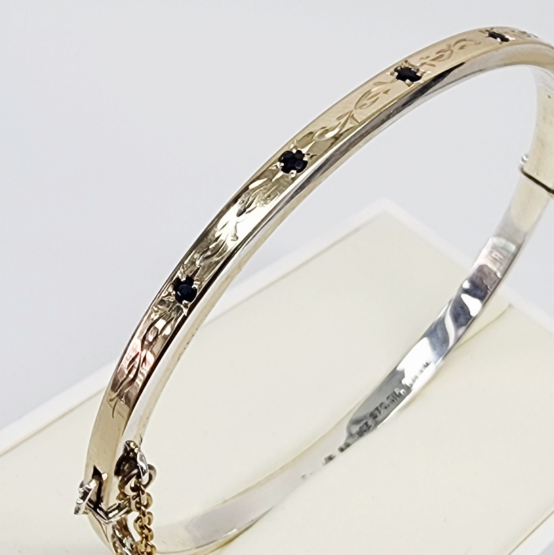 9ct Yellow Gold on Sterling Silver Hand Engraved Blue Sapphire Bangle – GS1EN5SAP