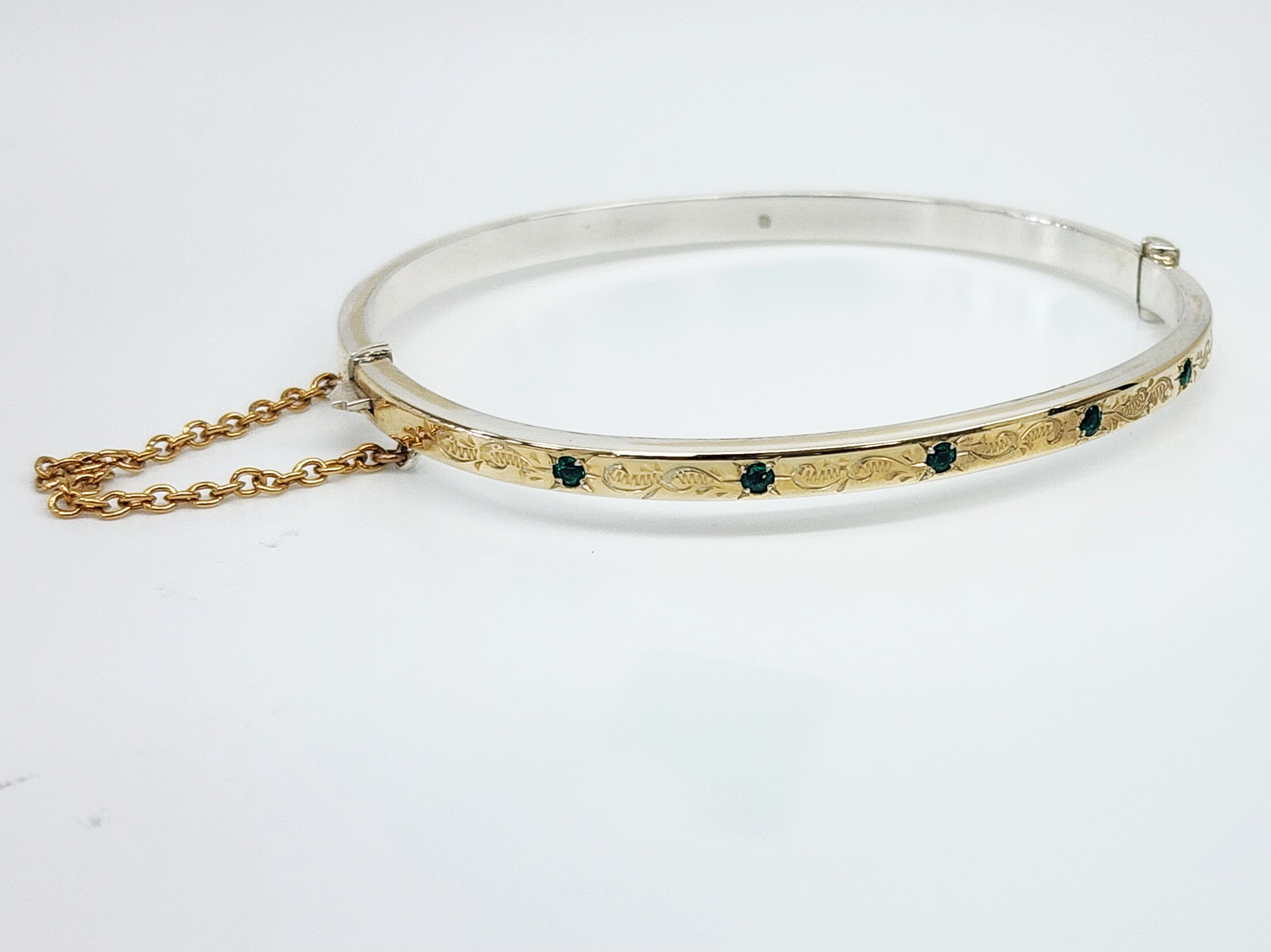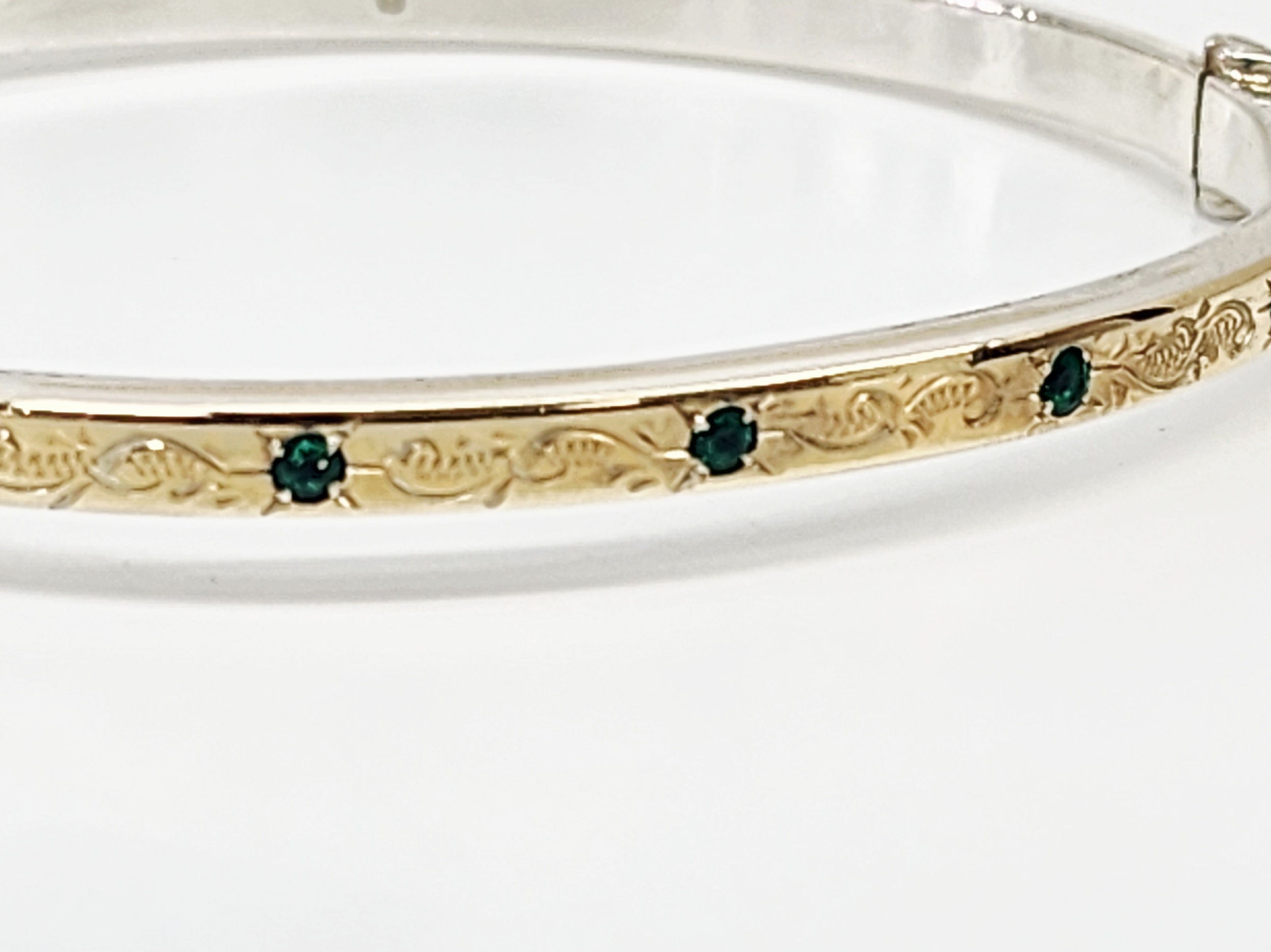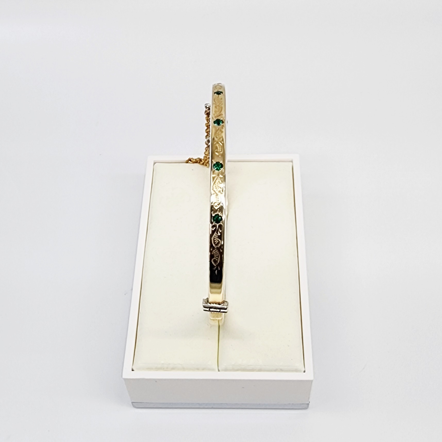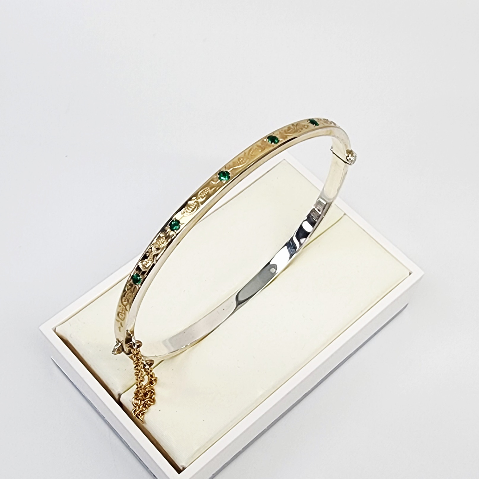 9ct Yellow Gold on Sterling Silver Hand Engraved Emerald Bangle – GS1EN5EM