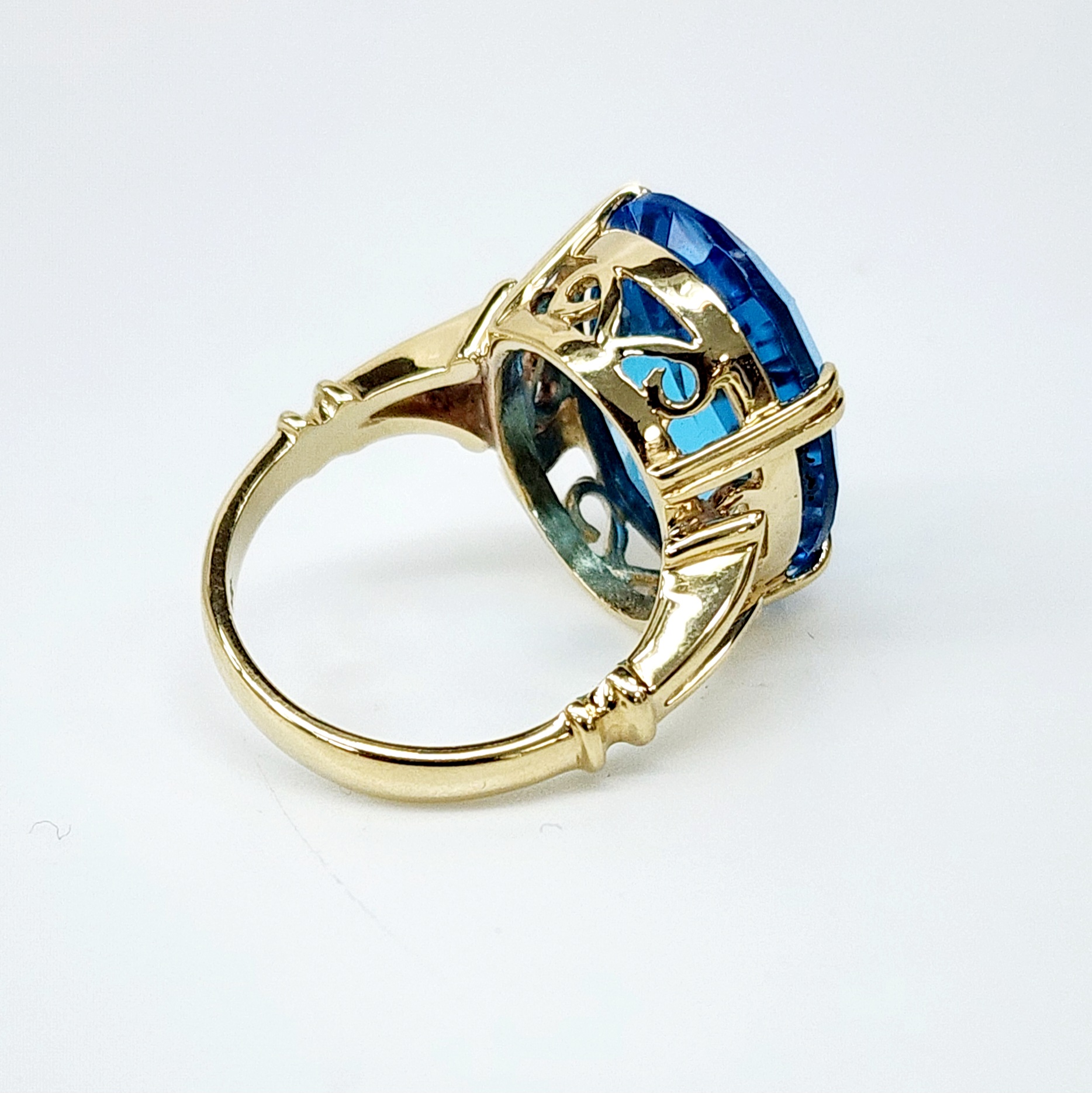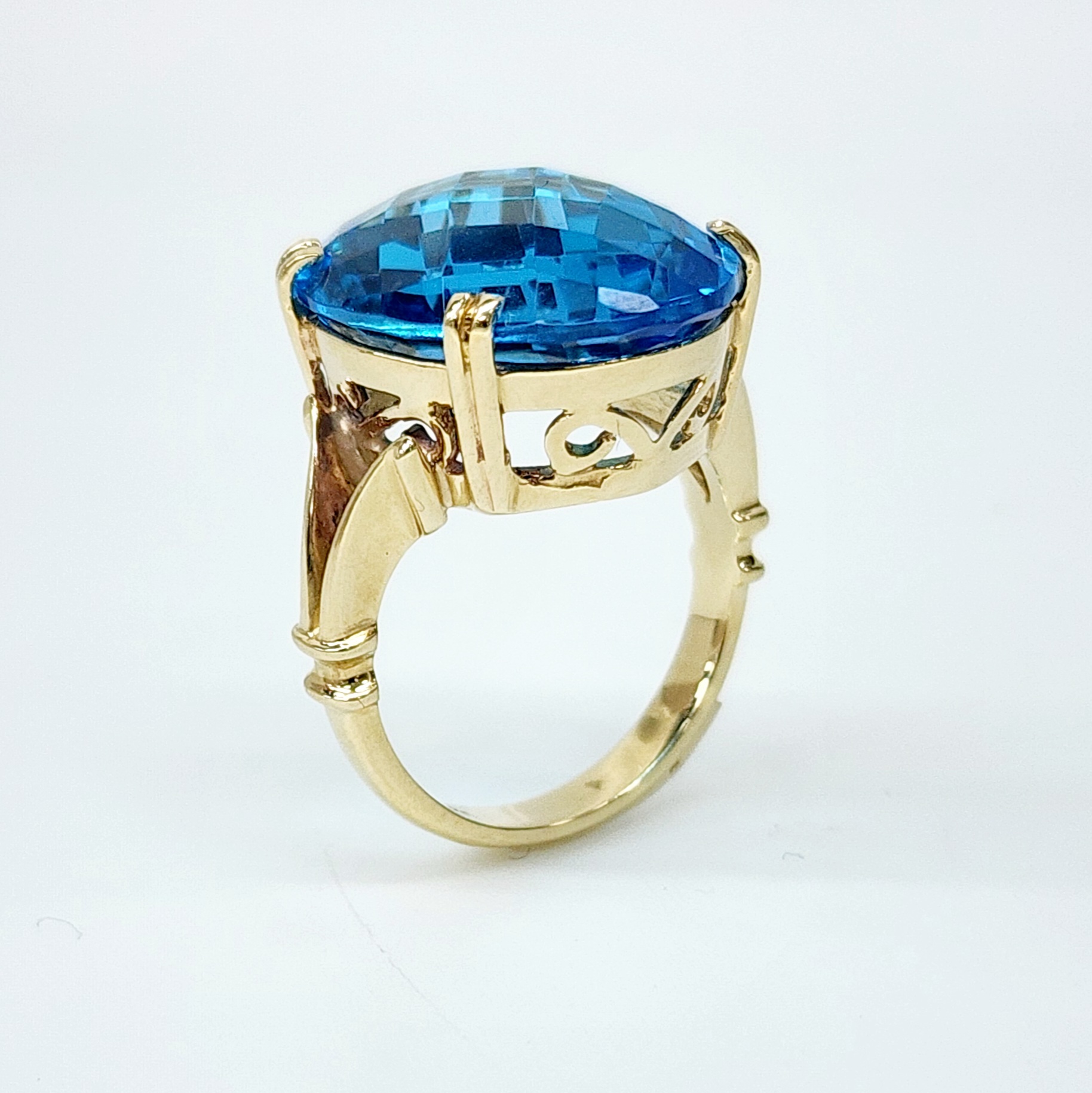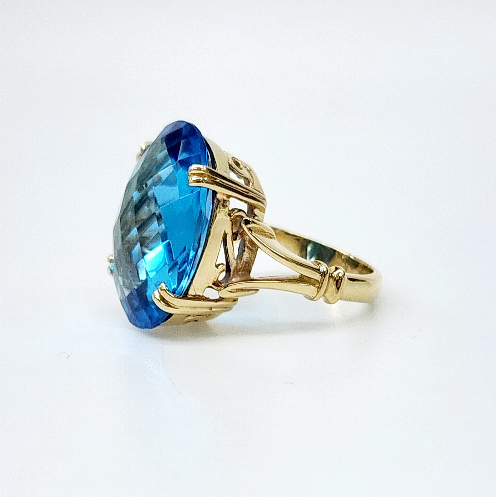 This exquisite 9ct yellow gold dress ring showcases a breathtaking 20ct natural blue topaz gemstone, expertly cut in an oval checkerboard style and measuring 20mm x 15mm. The vibrant blue topaz is securely held in place by a classic 4-claw setting, ensuring both elegance and stability. Designed for durability and style, the ring features a robust split shank that provides added strength to the overall setting, making it a perfect statement piece for any occasion.