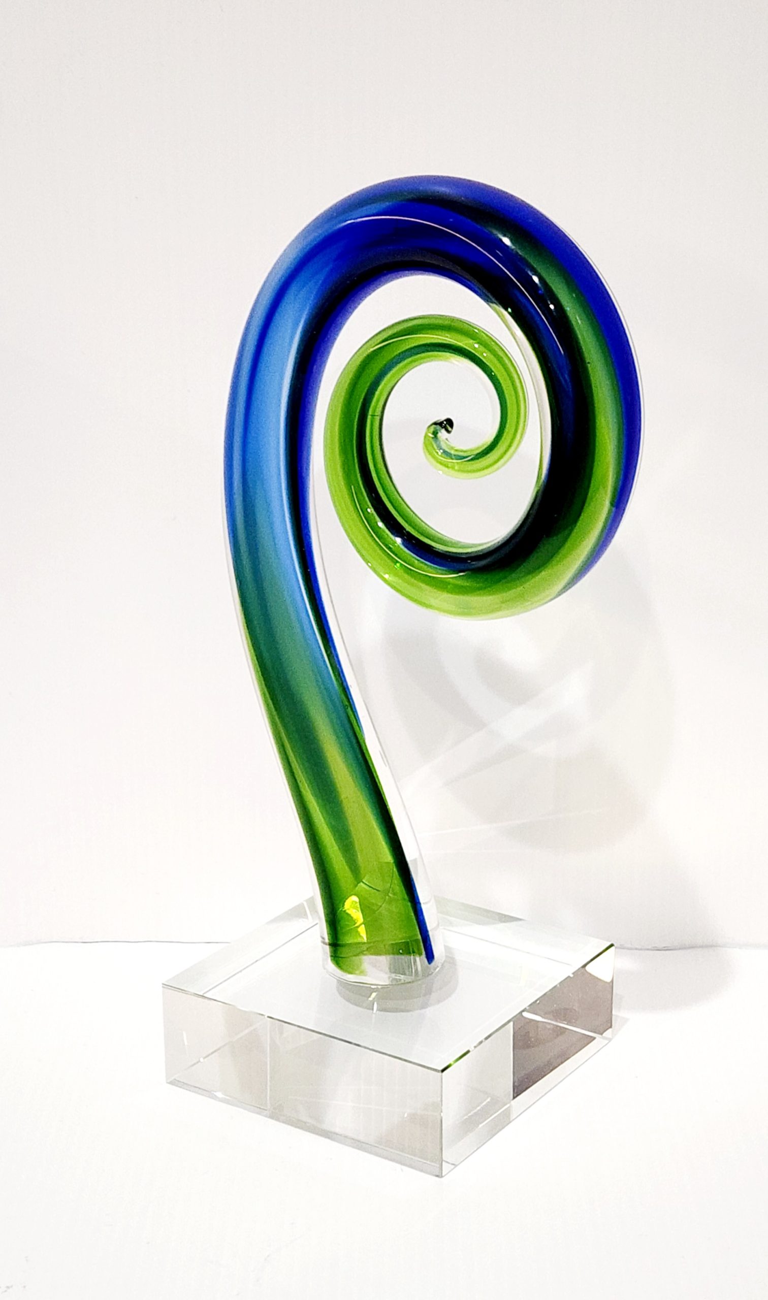Beautiful Maori Design Koru – Punga Green & Blue Glass Award / Trophy – 230mm High