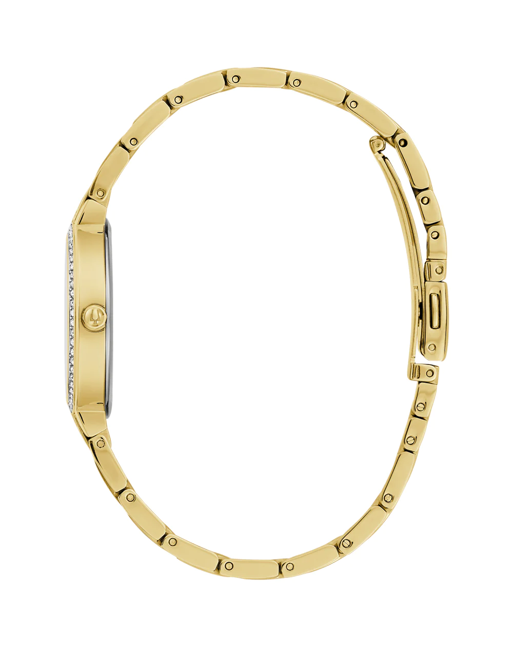 Contemporary design meets upscale refinement with this Bulova ladies? box set from the crystal collection. The polished gold-tone stainless steel case is carefully set with 68 crystals, creating a graceful outline that traces the matching bracelet with a further 48 striking crystals.