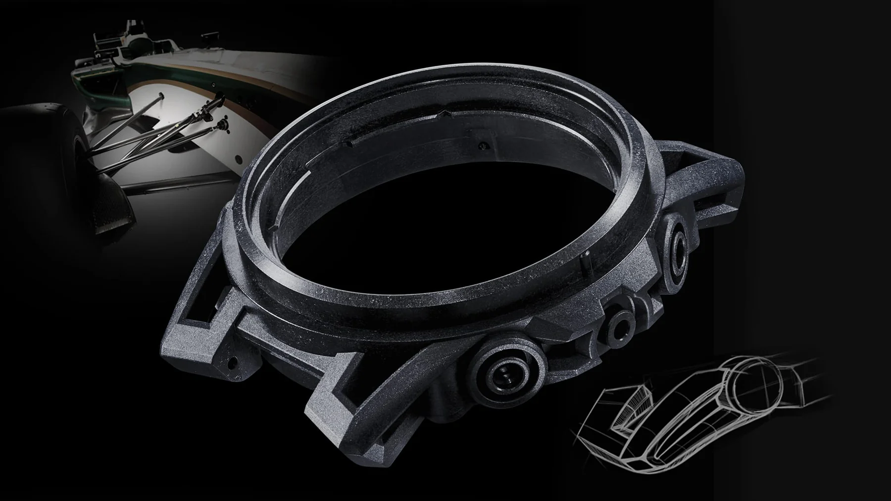 The case in carbon fiber-reinforced resin is lightweight, yet strong, and employs a lug design inspired by the four-arm, double-wishbone suspension of formula cars. The smaller diameter of the case makes for an easy, comfortable fit.
