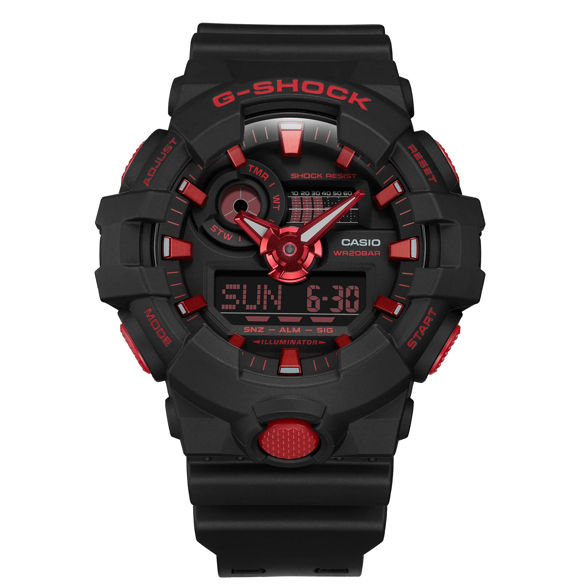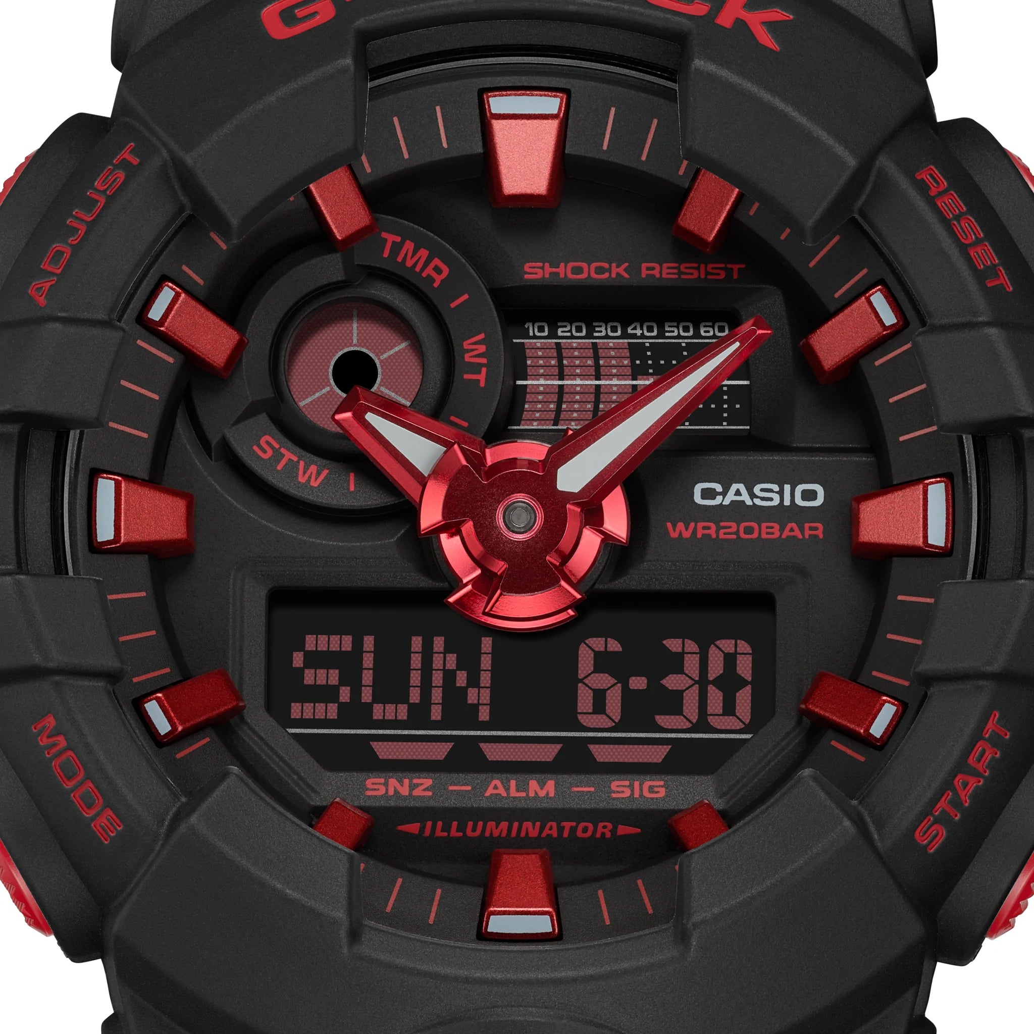 We have injected a few of our flagship models ? the octagonal GA-B2100 with Bluetooth and solar power; the oversized, solar-powered GAS-100; the GA-100, GA-2200 and GA-700 with signature oversized case ? with the strength and passion of the black and red G-SHOCK brand colors.