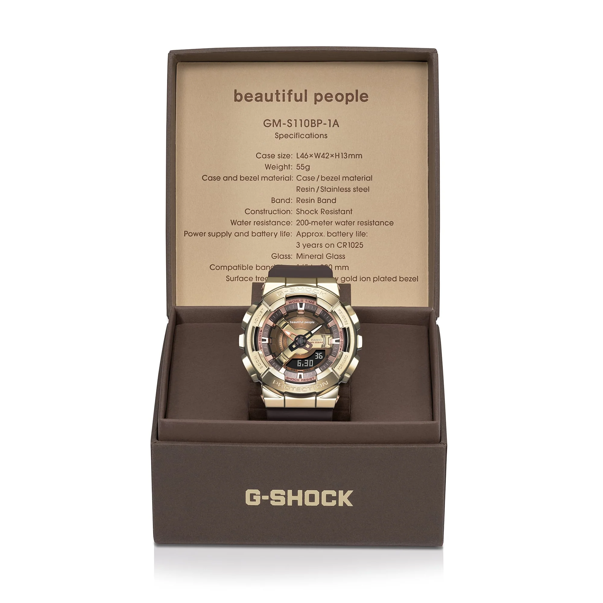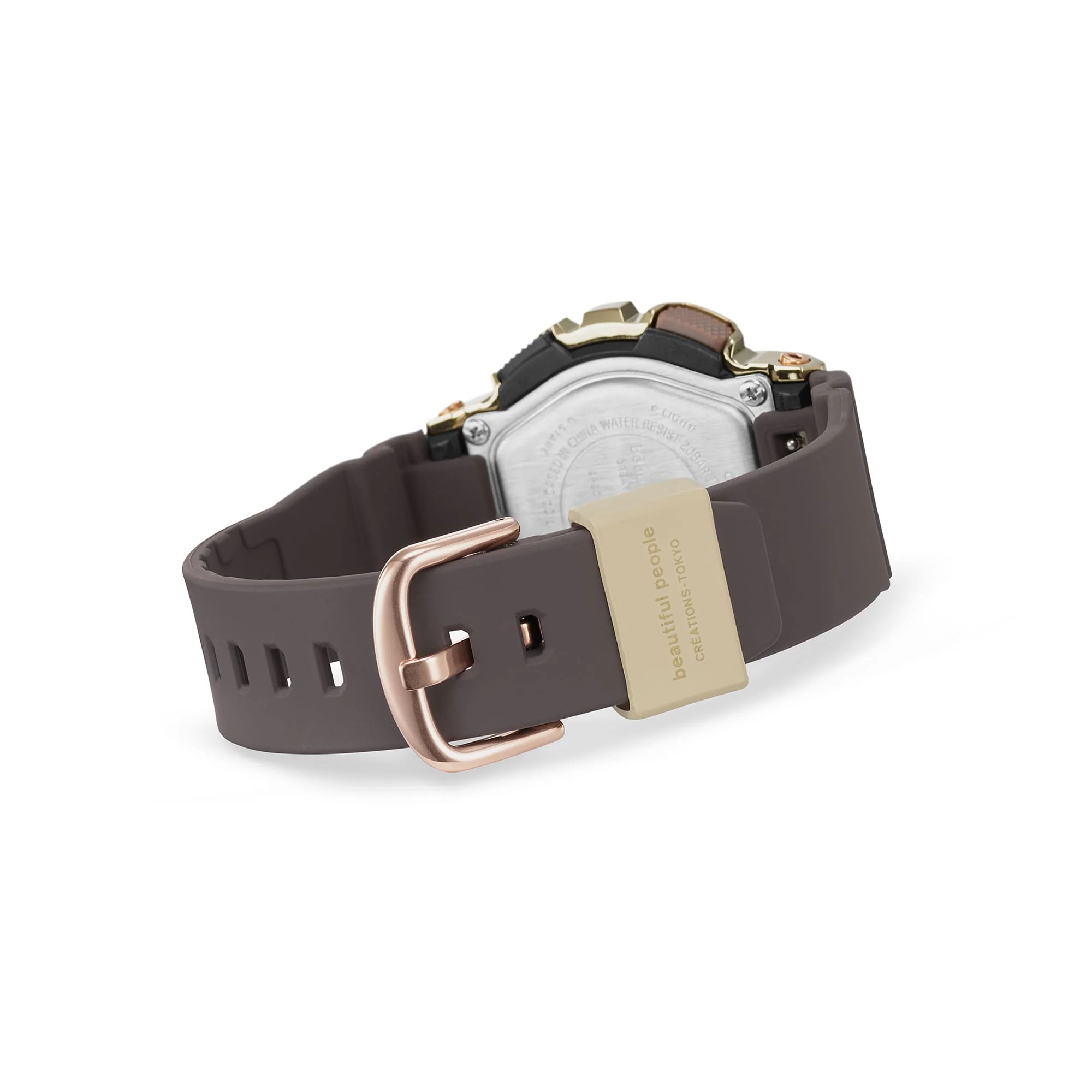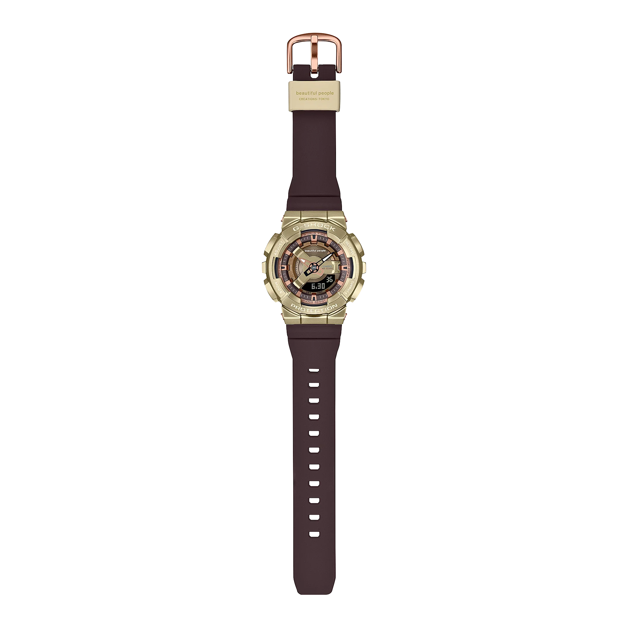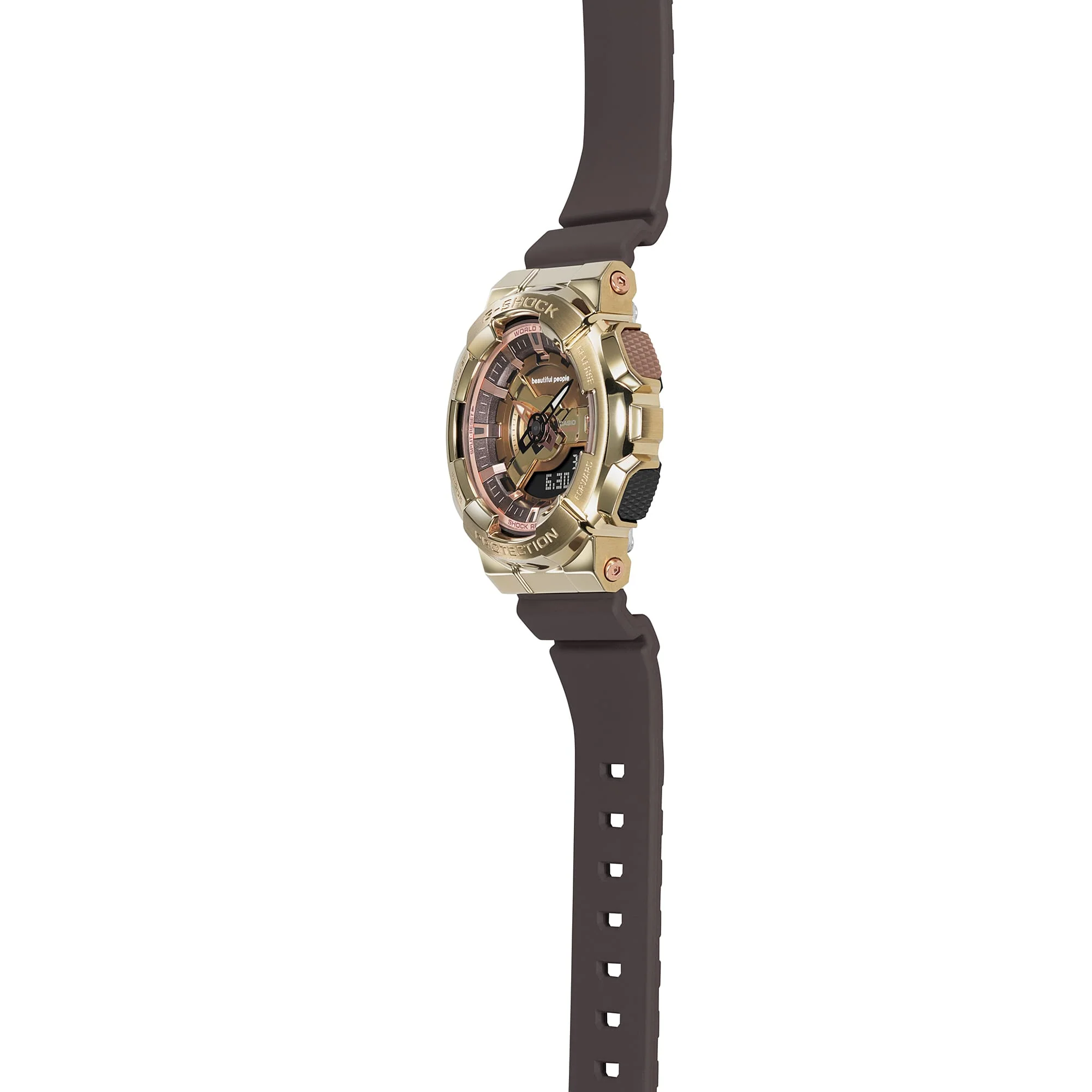 This collaboration timepiece starts with the GM-S110, a compact metal-clad take on the ever-popular GA-110, and incorporates the design concept of the beautiful people 2019 autumn/winter collection. The striking depth and dimension of the dial is crafted with a multilayered arrangement of finely detailed components, each finished in a different shade of brown. Ion-plated in a light-yellow gold color, the metal bezel says premium elegance all the way. The beautiful people logo is featured on the band loop, case back and dial design.