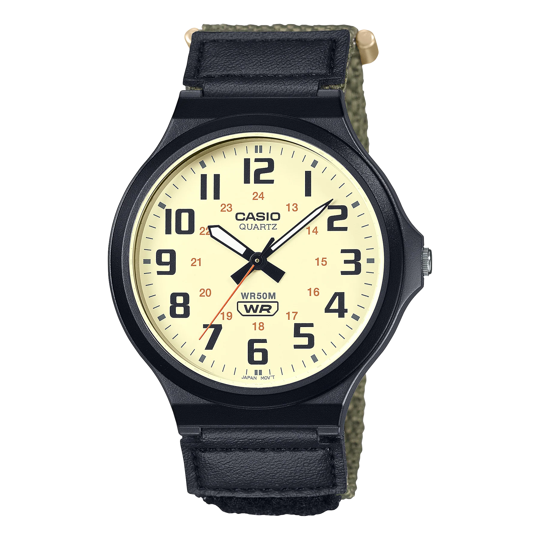 Classic look with an outdoorsy twist ? a streamlined analog watch with large case and Velcro-fastening band.