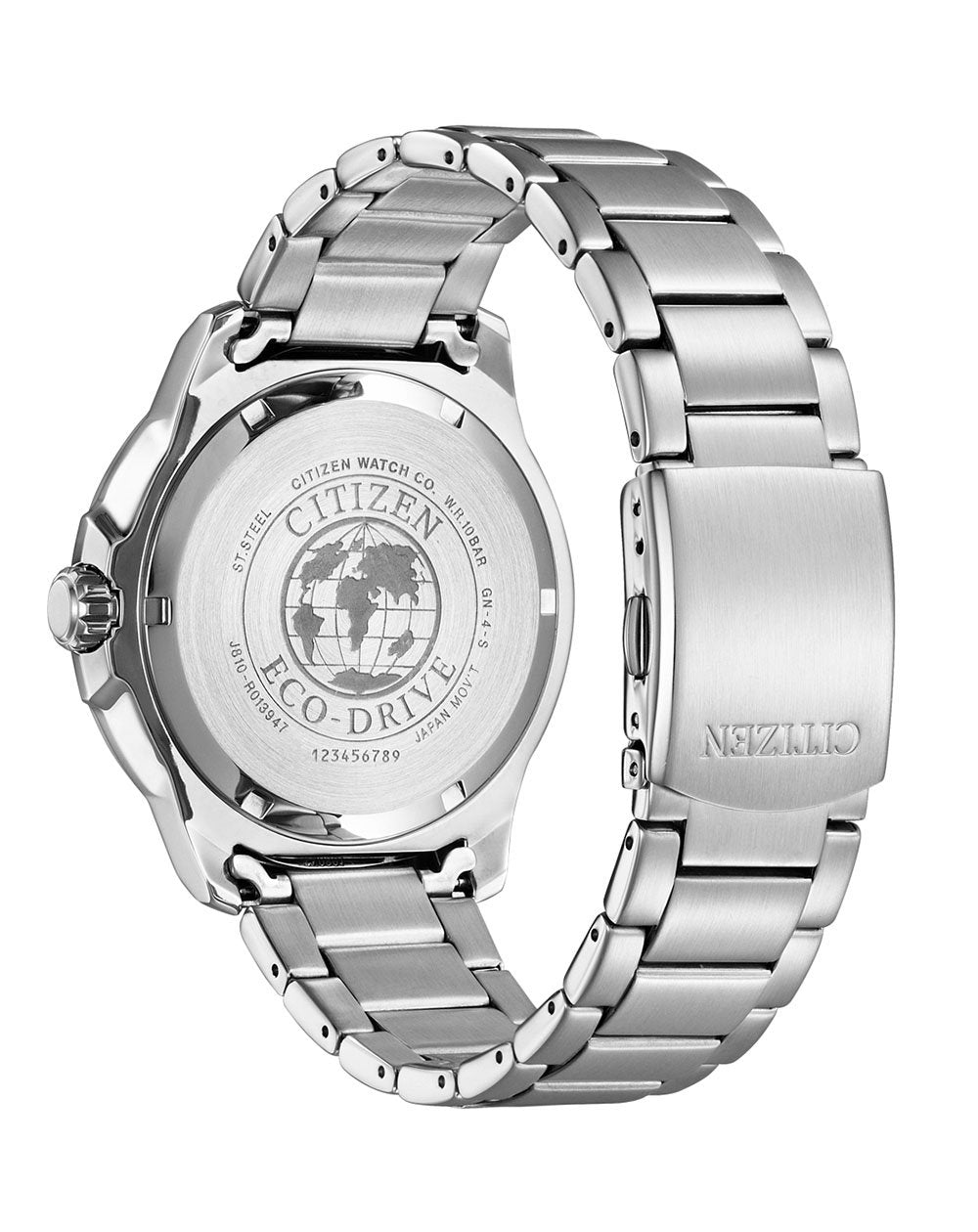 Designed with Eco-Drive technology, this sophisticated watch is engineered to never need batteries, storing up to 8 months power in reserve for next level reliability. Featuring a dark black dial with date display, luminescent markings, black and red toned bezel and silver band and case, it is a benchmark in refined style. Completed by a host of engaging features including WR100/10bar, low charge indicator, push button buckle for comfort and accuracy to within 15 seconds per month, it steps up when dependability counts.