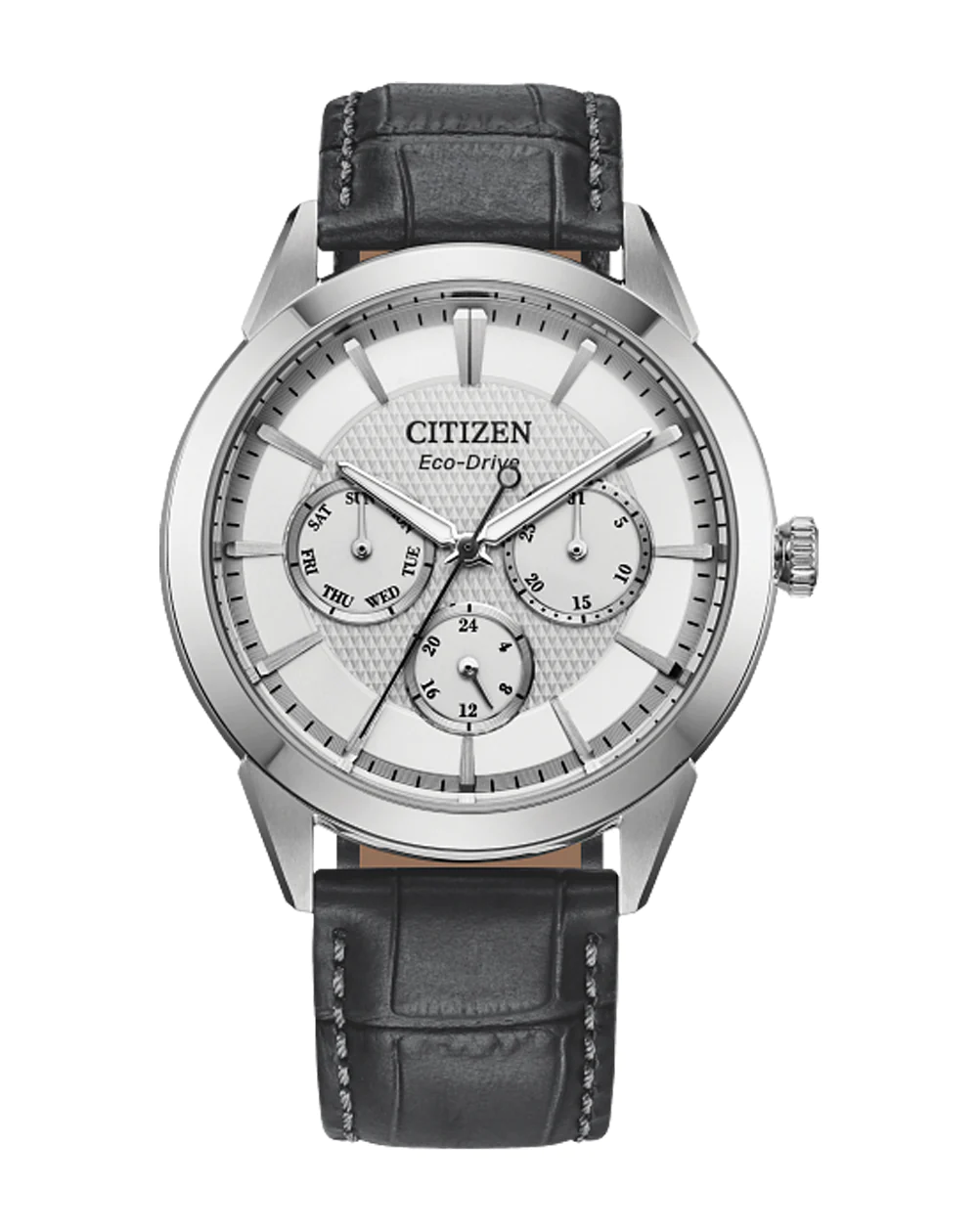 With vintage-inspired style that will never go out-of-date, this latest multi-function Rolan from Citizen takes the classic collection to the next level. The 40mm stainless steel case is the perfect base for the watch’s matching silver-tone dial, with three sub-dials upon a textured inner sector adding to its unique appeal. Applied accents and a gray leather strap round out the look, with features including running and 24h time joining day and date indicators to balance the chic aesthetics with the functionality of this sophisticated timepiece. Sustainably powered by any light with our proprietary Eco-Drive technology and never needs a battery. Water resistant up to 100m.