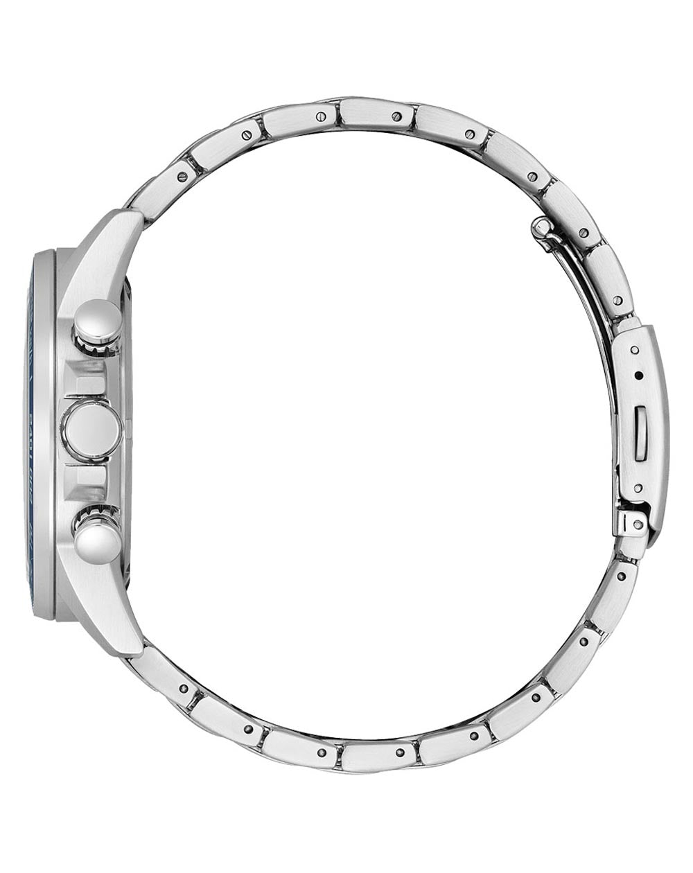Living life in the fast lane? Compliment your style with this sporty addition to the chronograph collection. Featuring a brushed stainless-steel case, blue dial with orange racing elements, silver-tone markers and orange and white hands. Additional features include Eco-Drive technology, 6-hand and calendar movement, stainless-steel bracelet, short fold-over double-push closure, and water resistance of 100 meters.