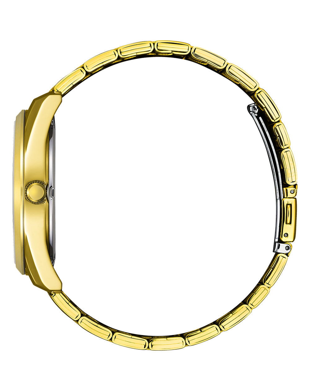 Stylishly designed with sleek gold tones and an eye-catching midnight blue dial, this quartz-powered watch is a blend of ageless aesthetics and sophisticated construction. Crafted from stainless steel and mineral glass, plus featuring 3 year battery life and WR100/10bar, it is dependable when the pressure is on. Additionally, with push button buckle and date display, it factors comfort and convenience into a superbly balanced timepiece.