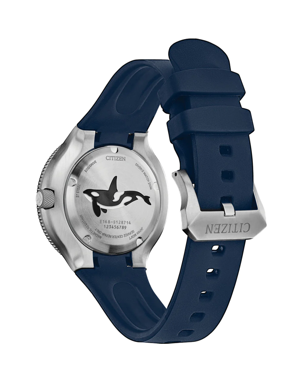 Command the sea in style with the new Promaster Marine. This iconic Citizen men?s dive watch is the latest addition to the Promaster Marine collection, with a strikingly original design inspired by the majestic Orca whale. The sporty and functional dive timepiece features a silver-tone stainless steel case accented by a blue three-hand dial and date with elliptical white hour indices and bezel indentations that evoke the shapes of the orca, plus pops of color at the 12 o?clock marker and minute hand. This ISO-compliant dive watch also features anti-magnetic and anti-shock resistance, a one-way rotating elapsed-time bezel, and luminous hands and markers filled with a superior lume for legibility. The blue polyurethane strap mimics the form of the orca?s fin and fastens with a buckle, and the watch is water resistant up to 200 meters with a screw-down crown, making it a perfect companion on your next dive. Sustainably powered by any light with Eco-Drive technology that never needs a battery, this is the ultimate dive watch to own and comes in a unique scuba tank-inspired box for the serious diver and collector