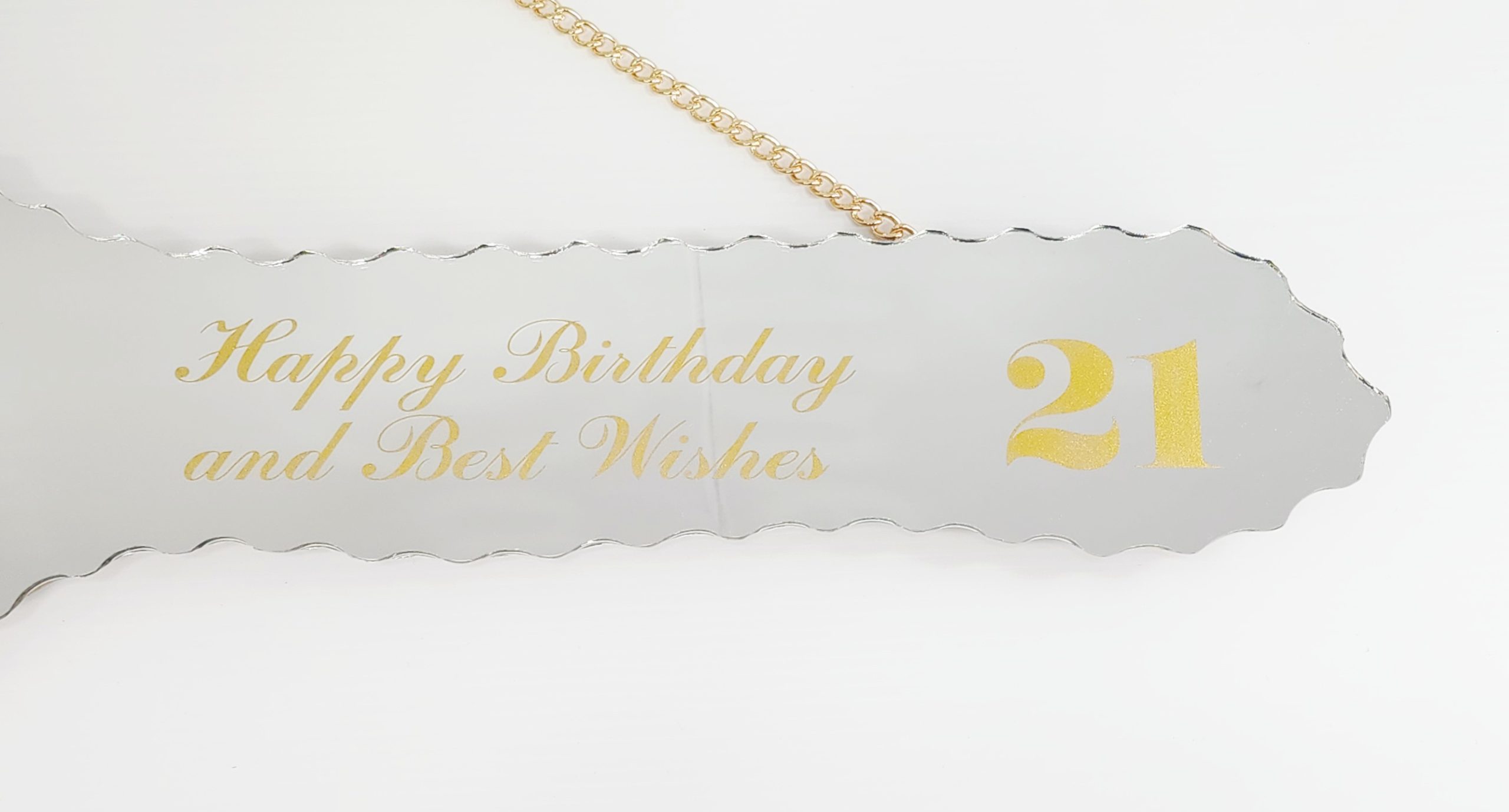 Our Mirrored 21st keys come with a 13mm MDF backing so your key can be signed by guests and loved ones. They also feature scalloped edges and a gold look chain to hang from. Dimensions: 524 x 205mm.