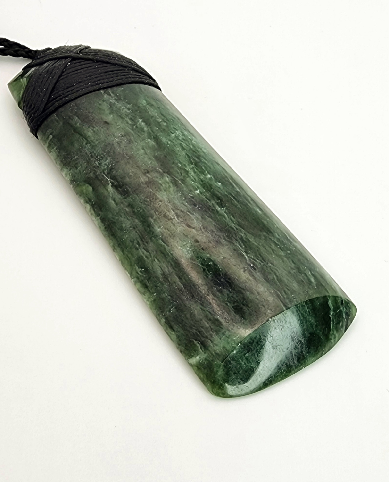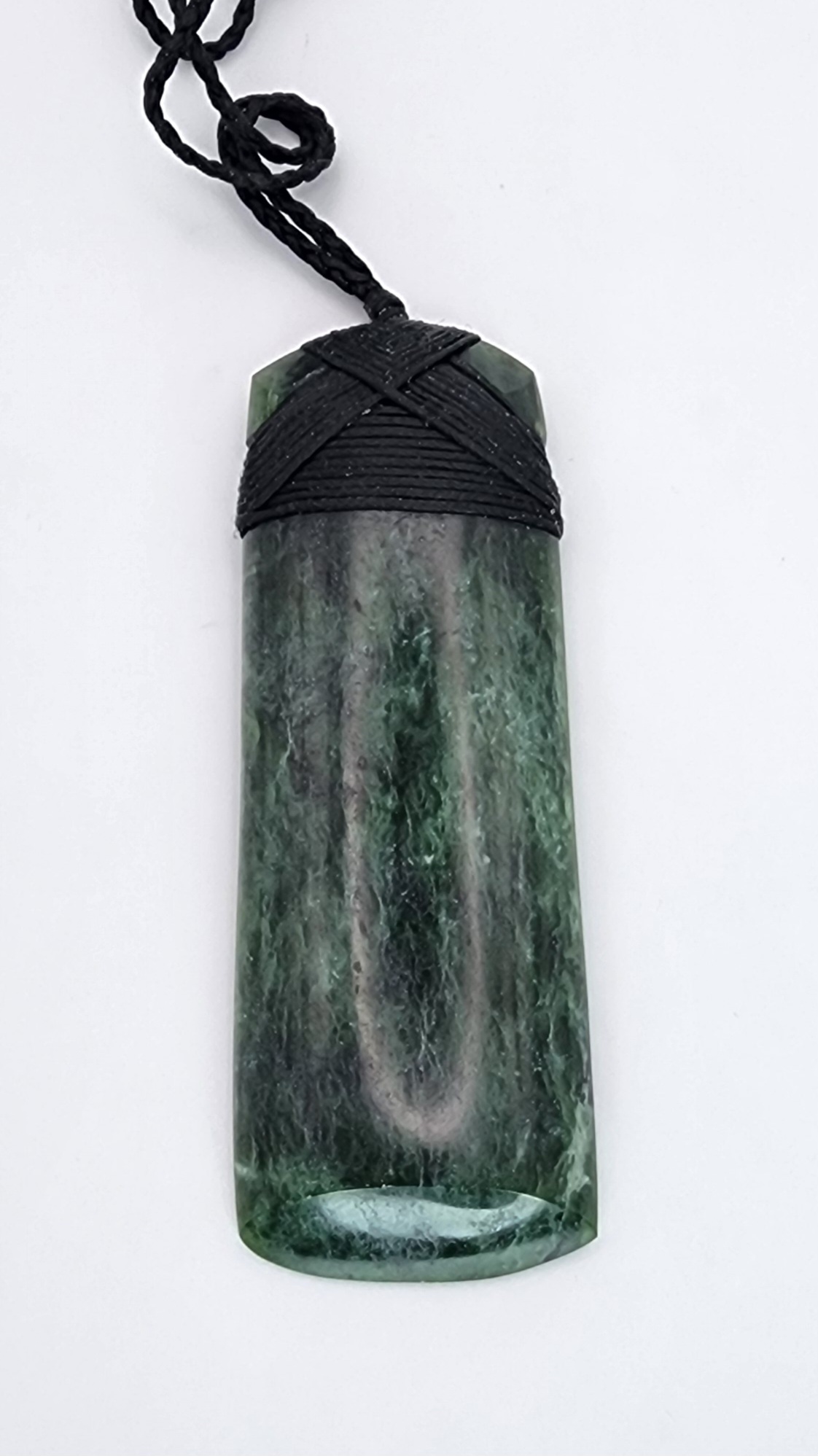 Genuine New Zealand Pounamu (Greenstone), sourced and hand carved in Aotearoa (New Zealand). Pounamu is of great cultural significance for M?ori and is believed to enhance mana (prestige) of its possessor. The toki comes with traditional binding and adjustable cord.