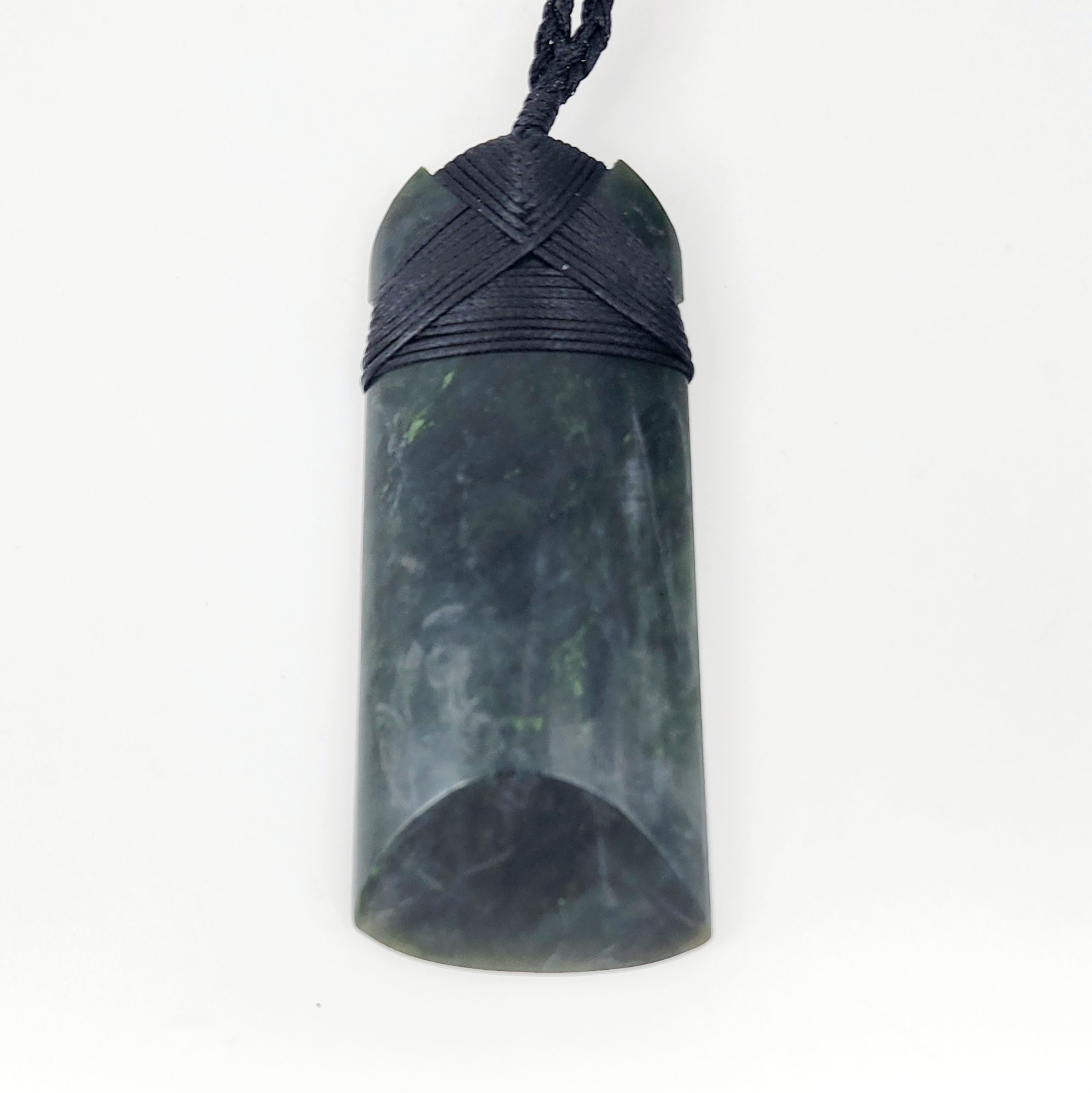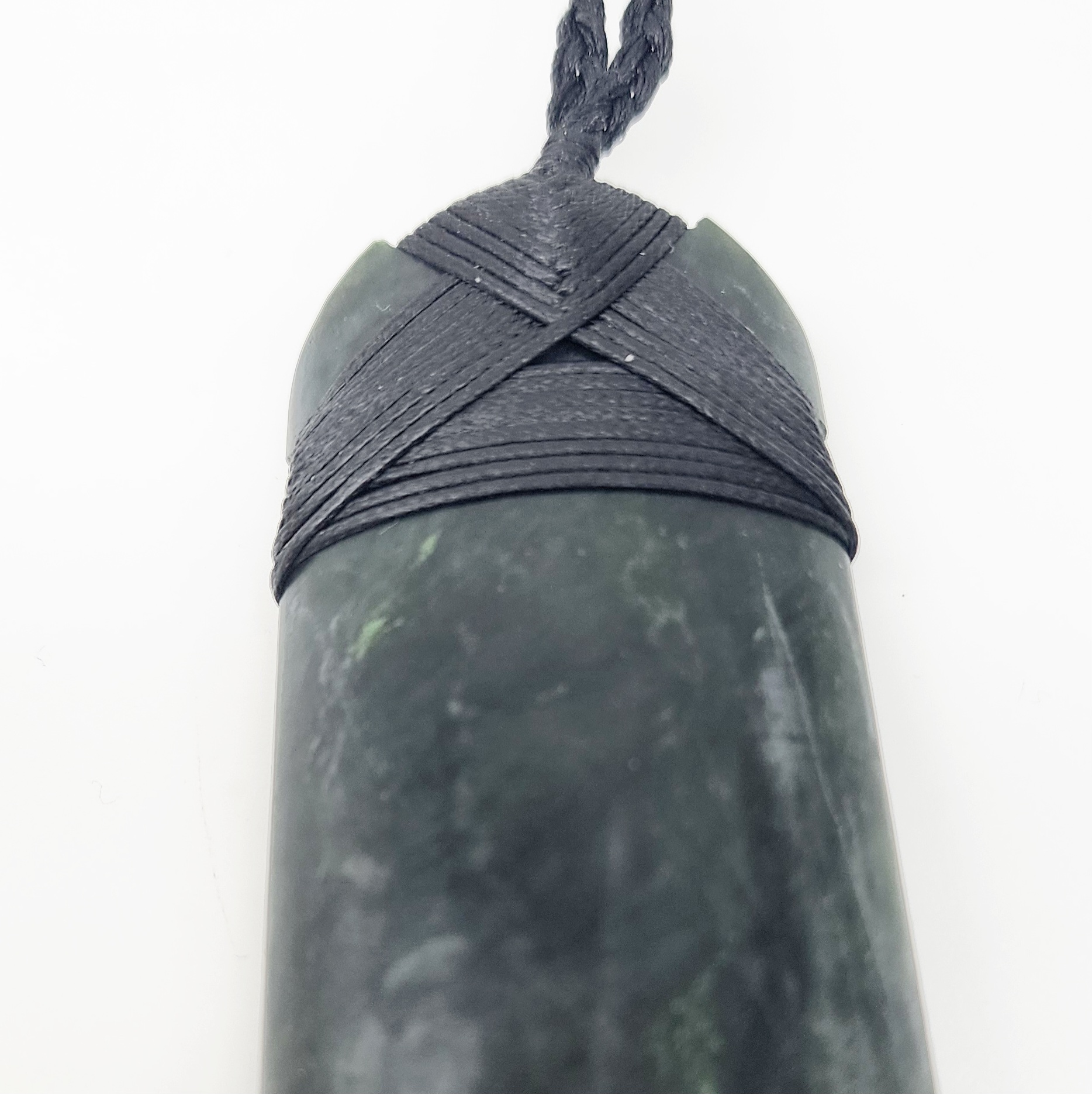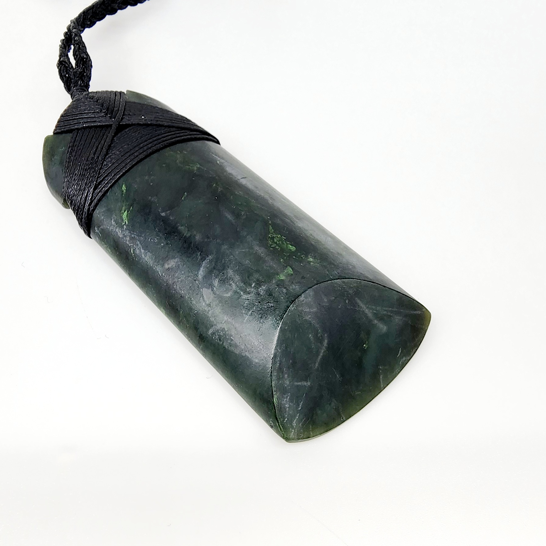 Genuine New Zealand Pounamu (Greenstone), sourced and hand carved in Aotearoa (New Zealand). Pounamu is of great cultural significance for M?ori and is believed to enhance mana (prestige) of its possessor. The toki comes with traditional binding and adjustable cord.