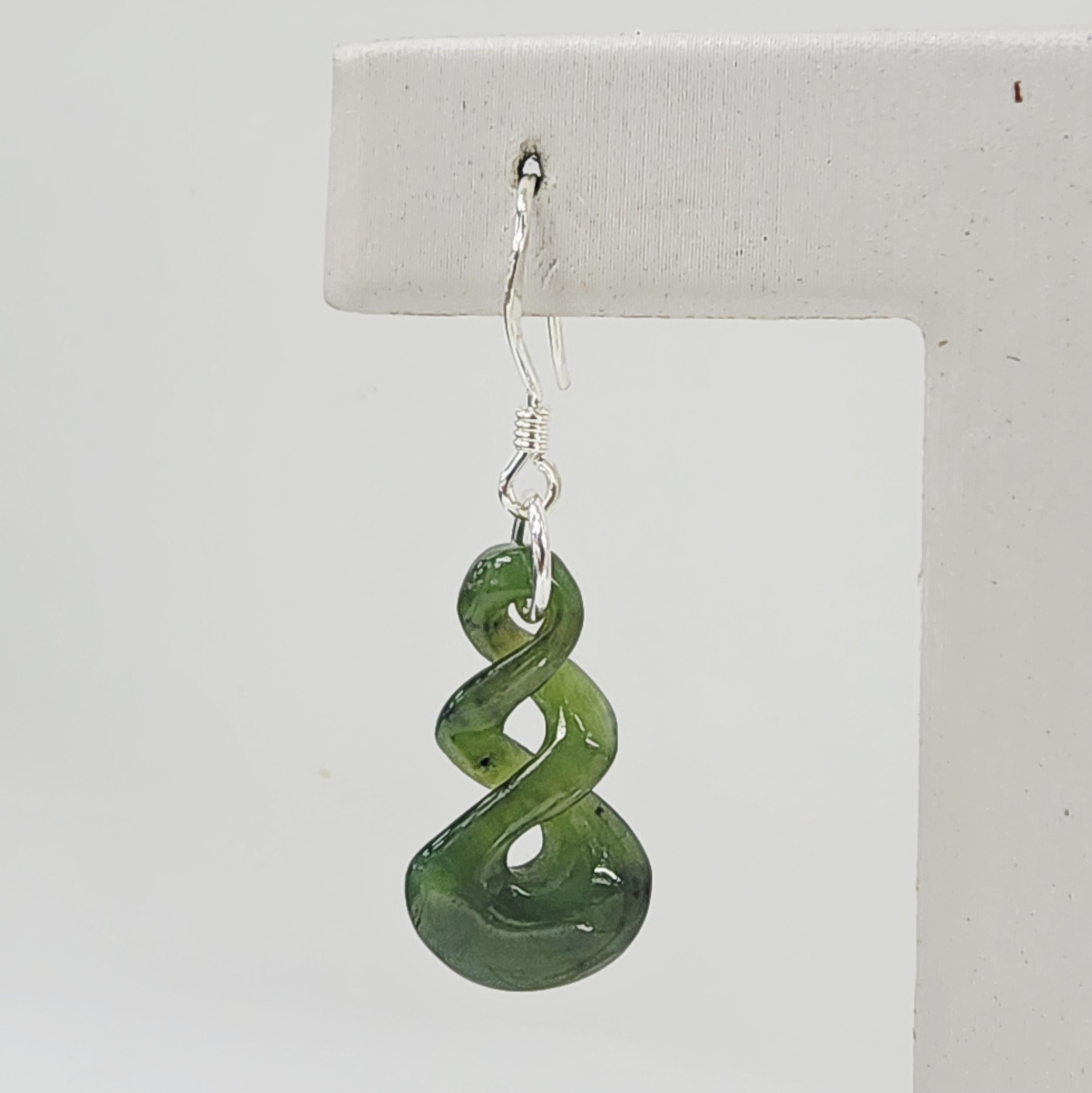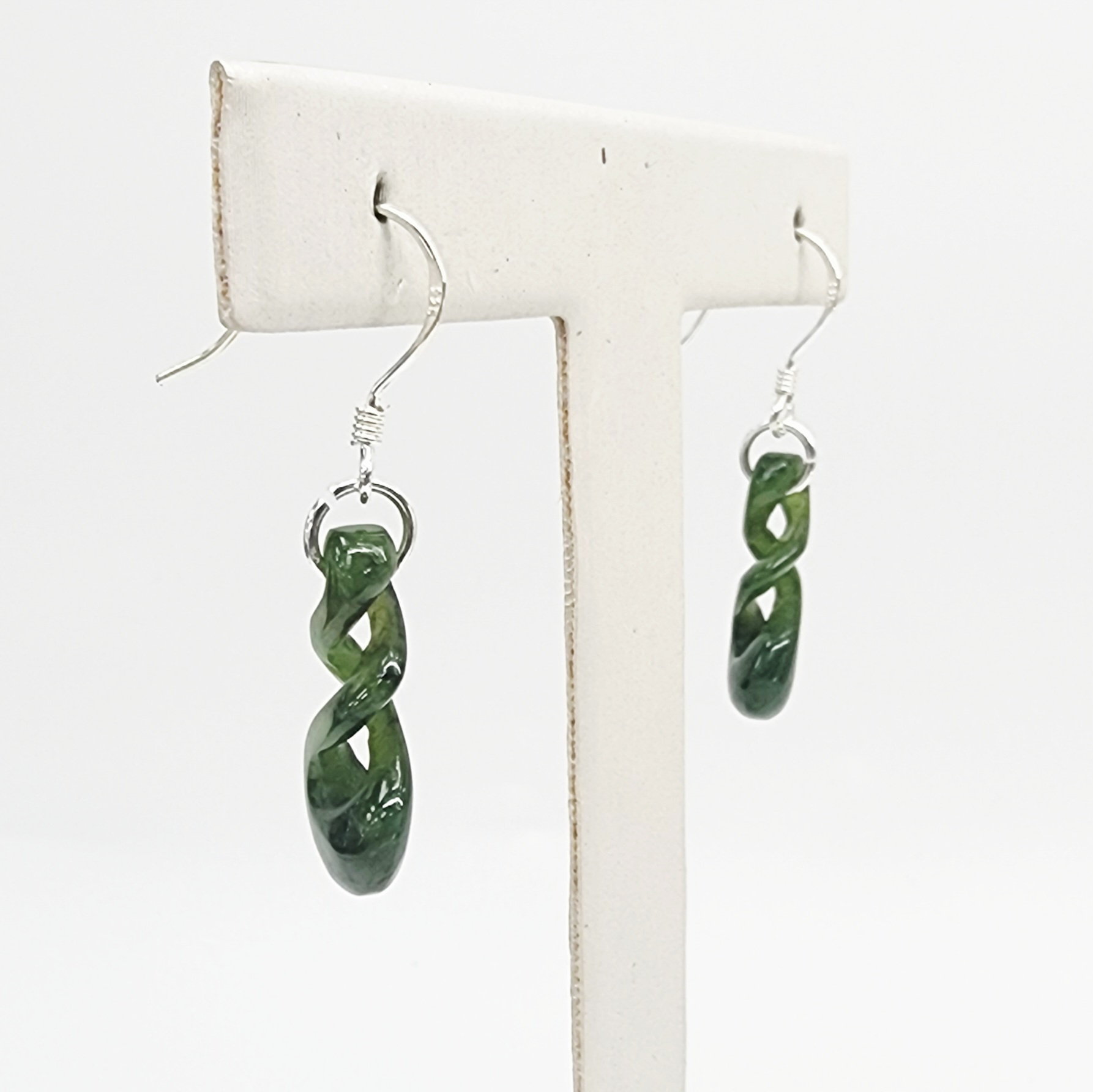 Each earring features a 20mm x 11mm greenstone drop, showcasing natural variations of deep and light nephrite tones. The double twist is smoothly polished to enhance the stone’s natural glow and organic patterns.
