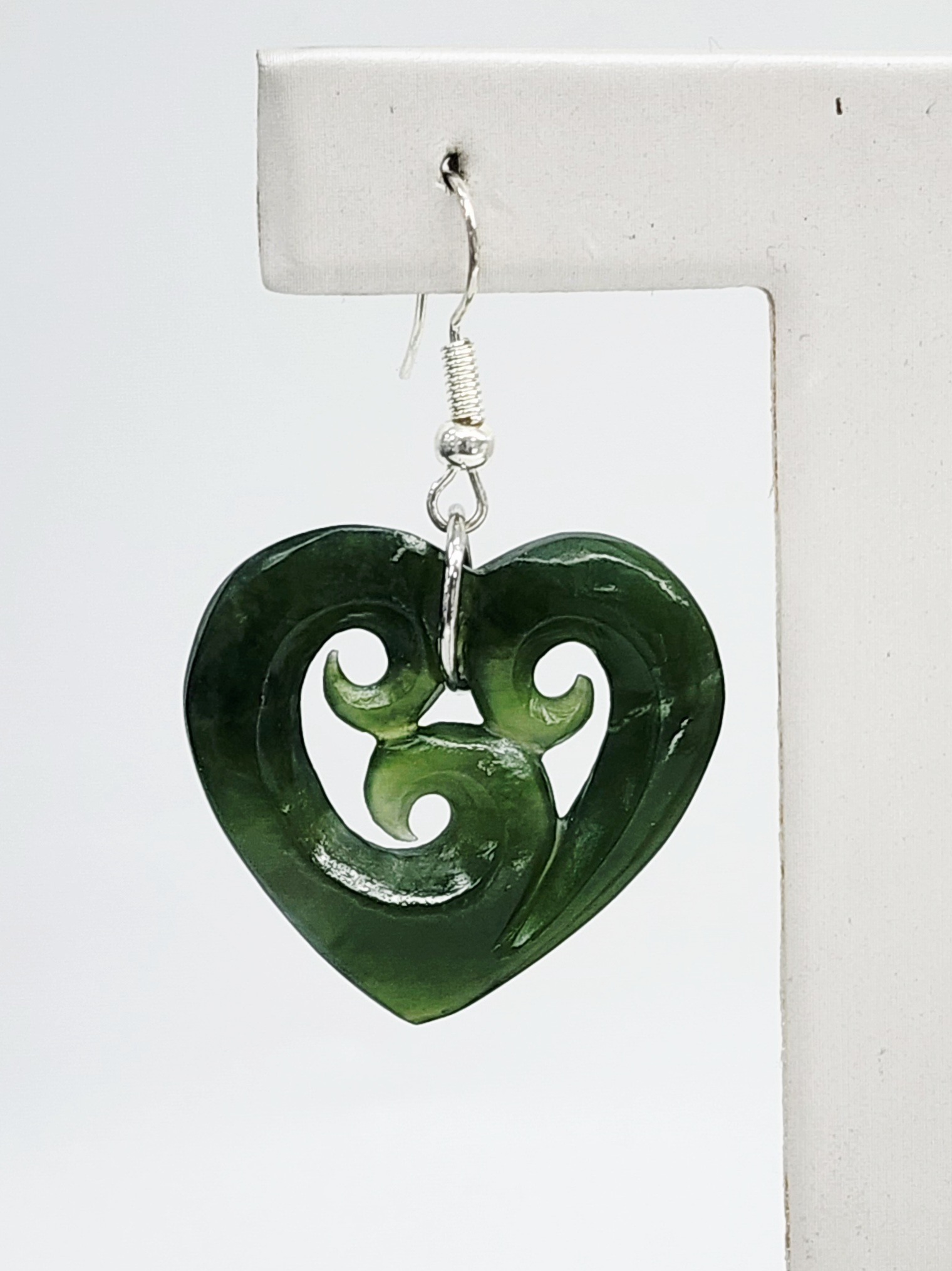 Greenstone Heart Earrings with Triple Koru Carving & Sterling Silver Hooks