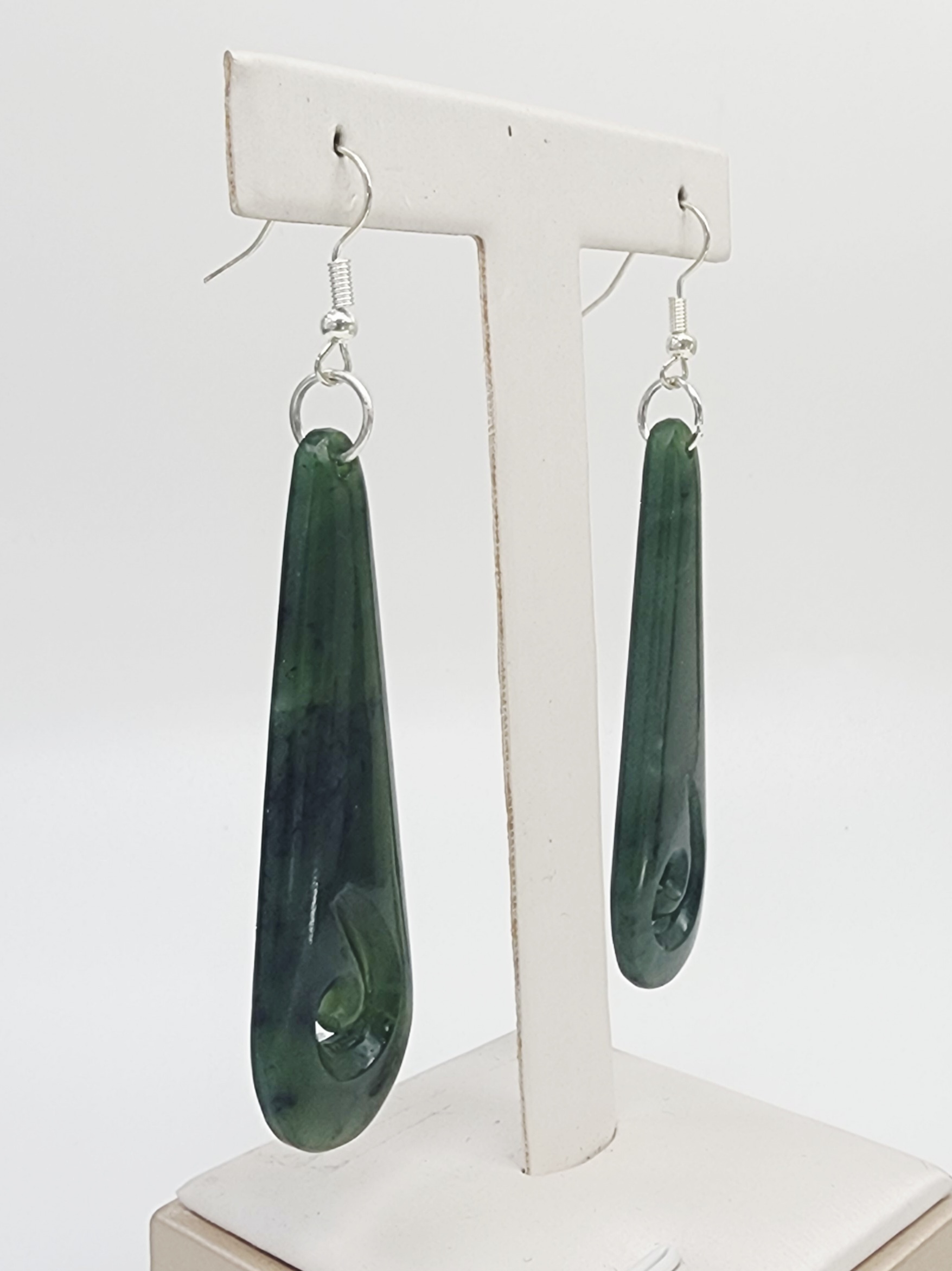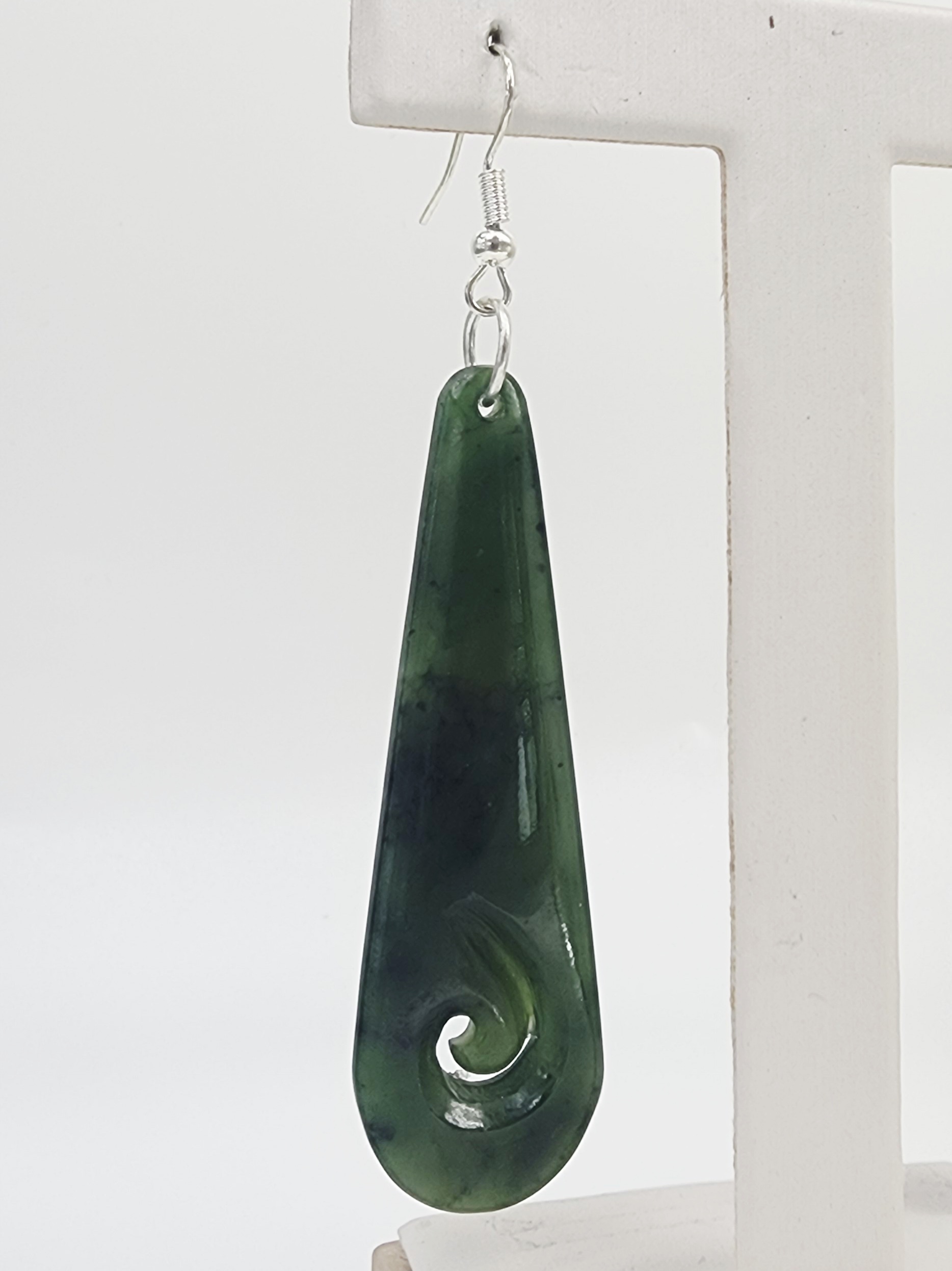 Greenstone Long Hook Earrings with Sterling Silver Hooks – 62mm Drop with Koru Cutout