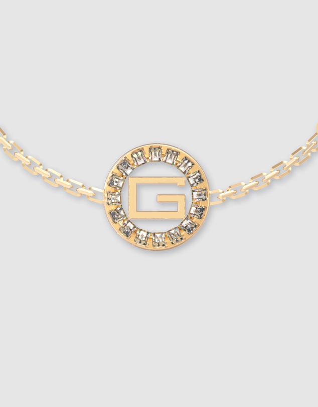 An everyday look that demands attention, this Guess Jewellery bracelet in yellow gold tone features baguette crystals encircling the iconic G Squared logo, a classic symbol of the brand. Pair it with the matching necklace and earrings to complete the look.