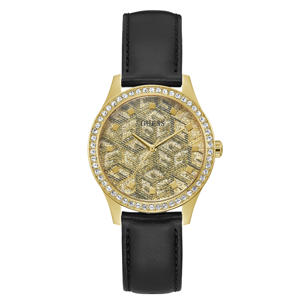 Black and gold combine on this must have spring timepiece. Featuring a fully crystal case paired with our signature Quattro G pattern with a smooth black leather strap.