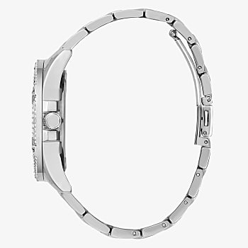 This new take on a classic style has a cutting-edge design with all over cut-thru details from the case to the bracelet, as well as integrated dial design where you can see thru to the movement of this multi-function watch. Bringing bling elements to a new level with case and bracelet adornment and glitz powder on the dial to give an overall look of luxury.