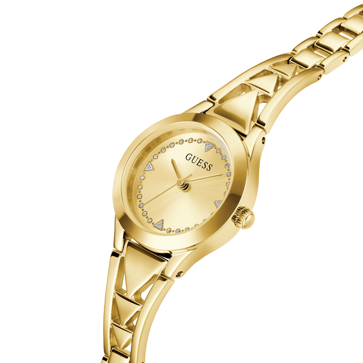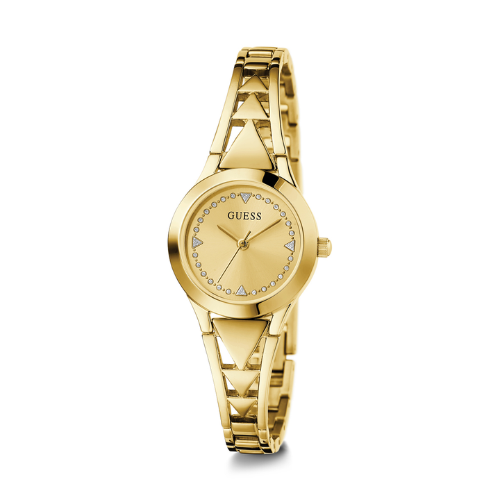 A new take on vintage jewellery styling by GUESS. A petite 26mm gold tone case is paired with a delicately finished self-adjustable gold tone stainless steel bracelet, which features the GUESS triangle motif to elevate your aesthetic.