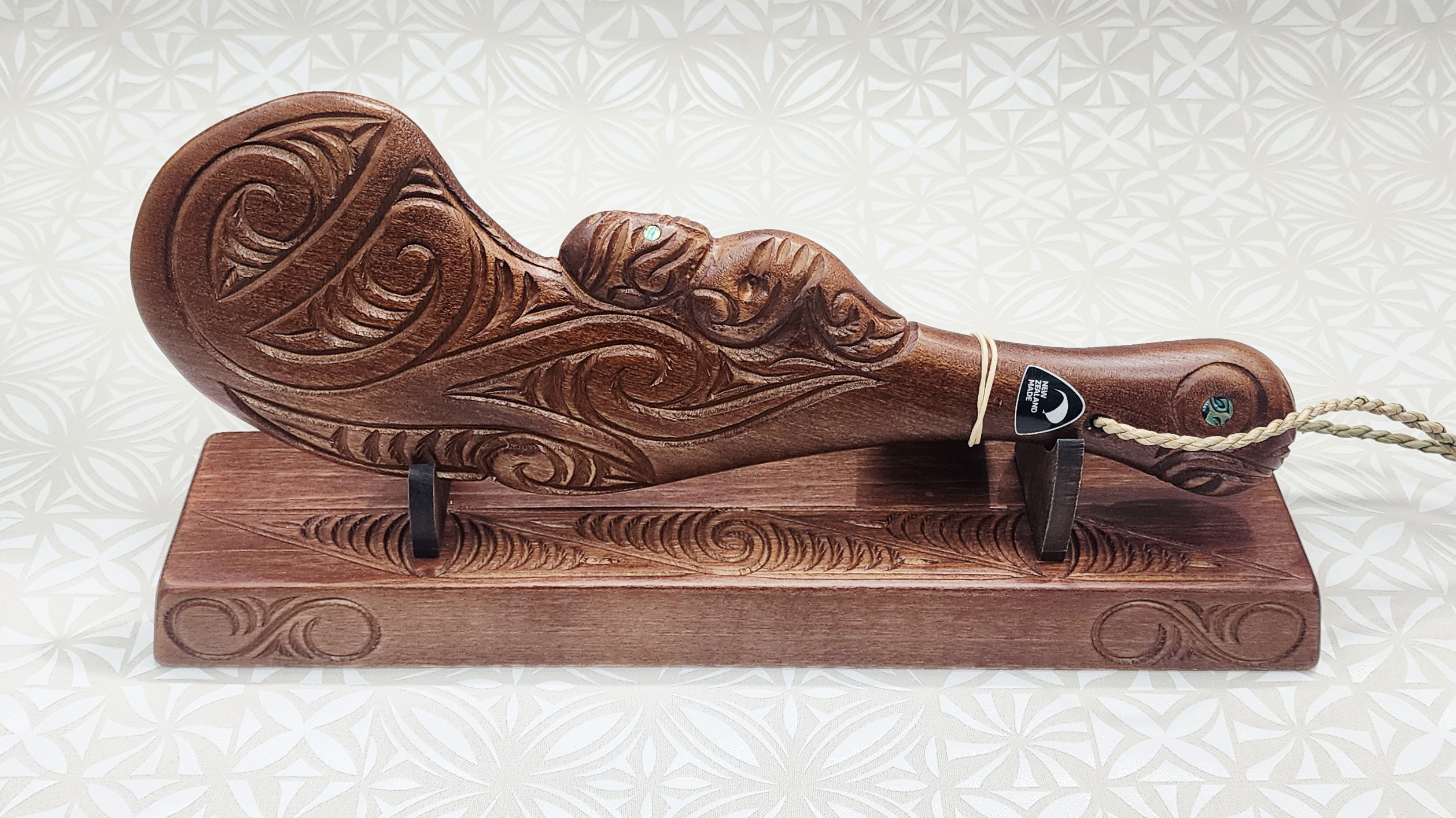 This beautifully crafted Māori Wahaika club on stand is a striking representation of traditional Māori artistry and makes a meaningful corporate gift, 21st birthday present, or collector’s display piece.