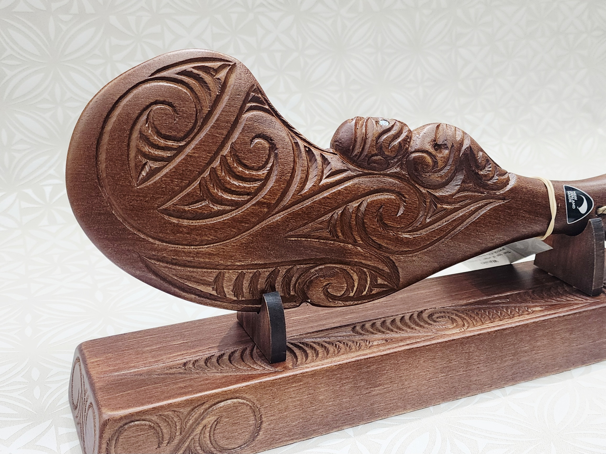 The Wahaika is presented on a matching carved wooden stand, allowing it to be proudly displayed in an office, boardroom, home, or collection space. Each piece is individually hand carved, meaning no two are exactly the same—slight variations in wood grain, colour tones, and carving details are a natural and valued part of its authenticity.
