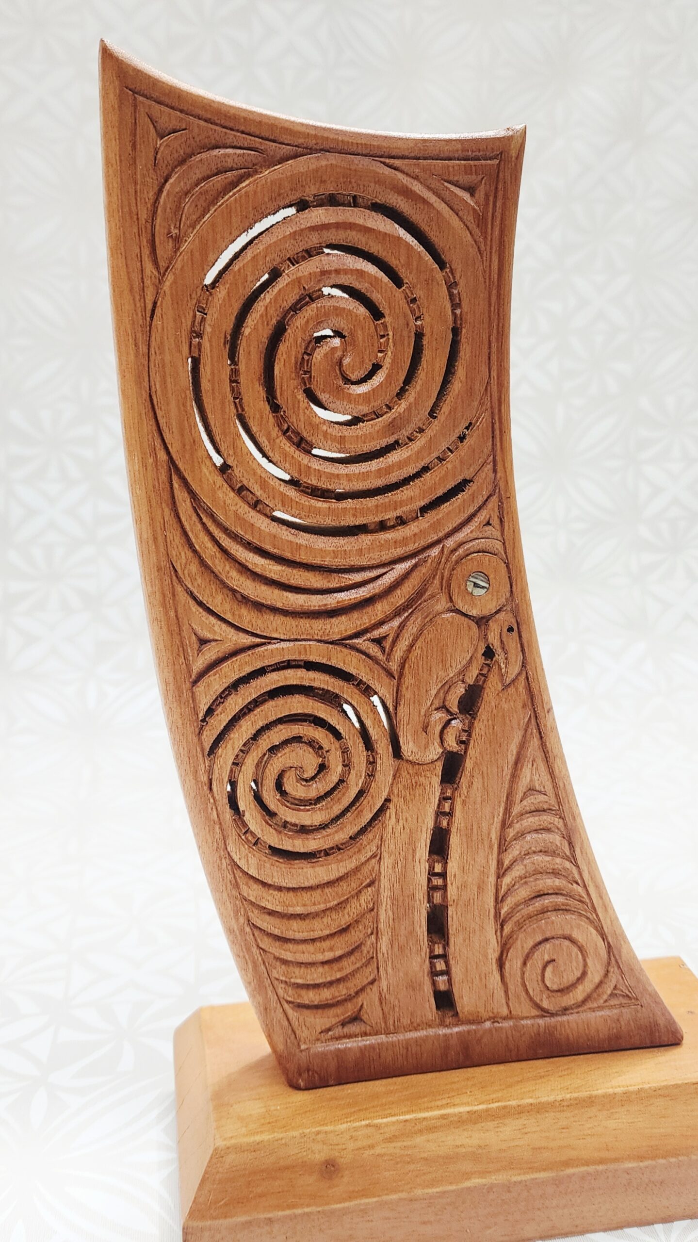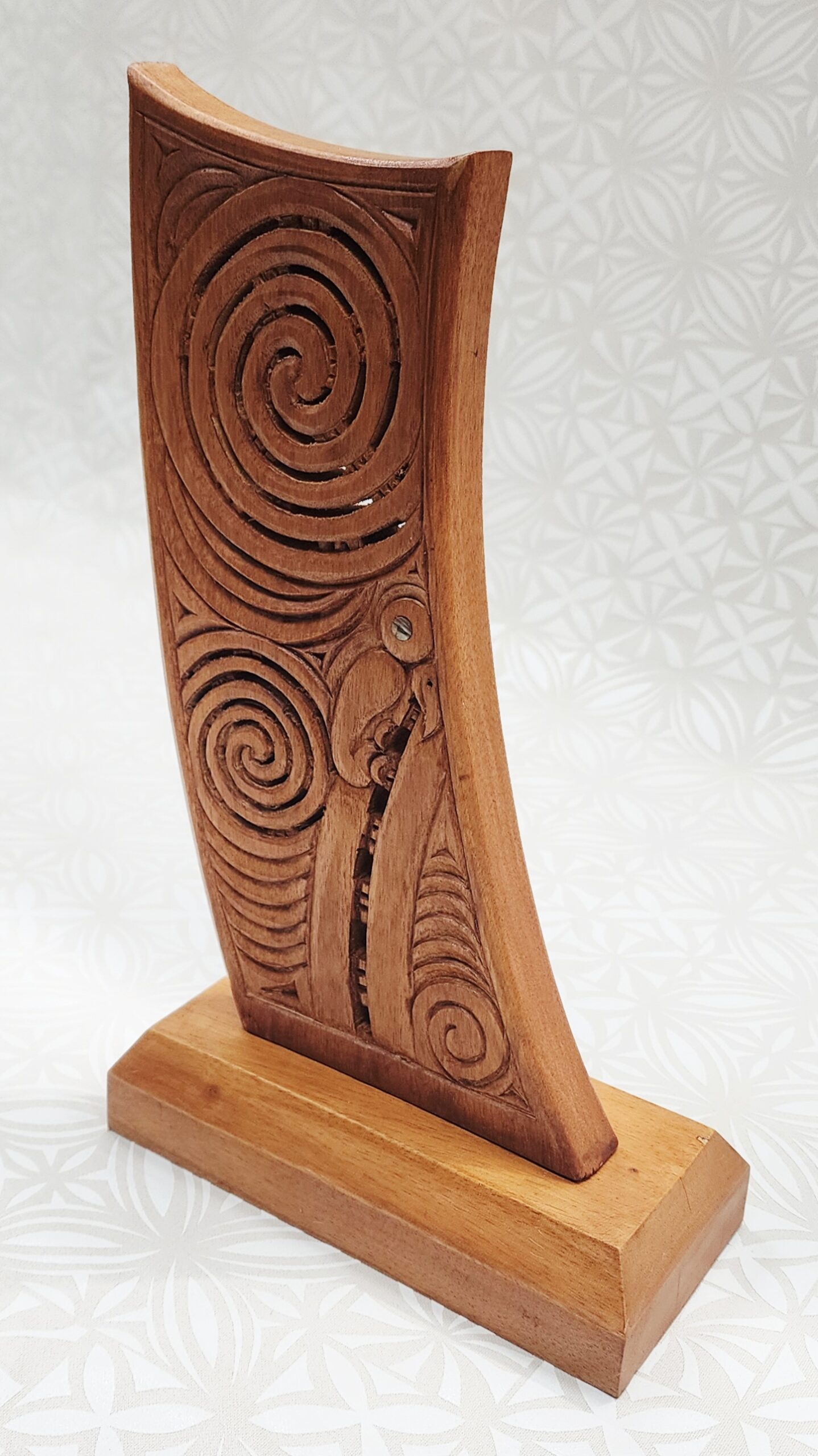 Inspired by the stern (taurapa) of a traditional Māori waka, this piece reflects the importance of waka in Māori culture as symbols of journey, leadership, ancestry, and connection to the sea. The flowing curved form is enhanced by carved spiral and koru motifs, representing growth, continuity, and the ongoing journey of life.