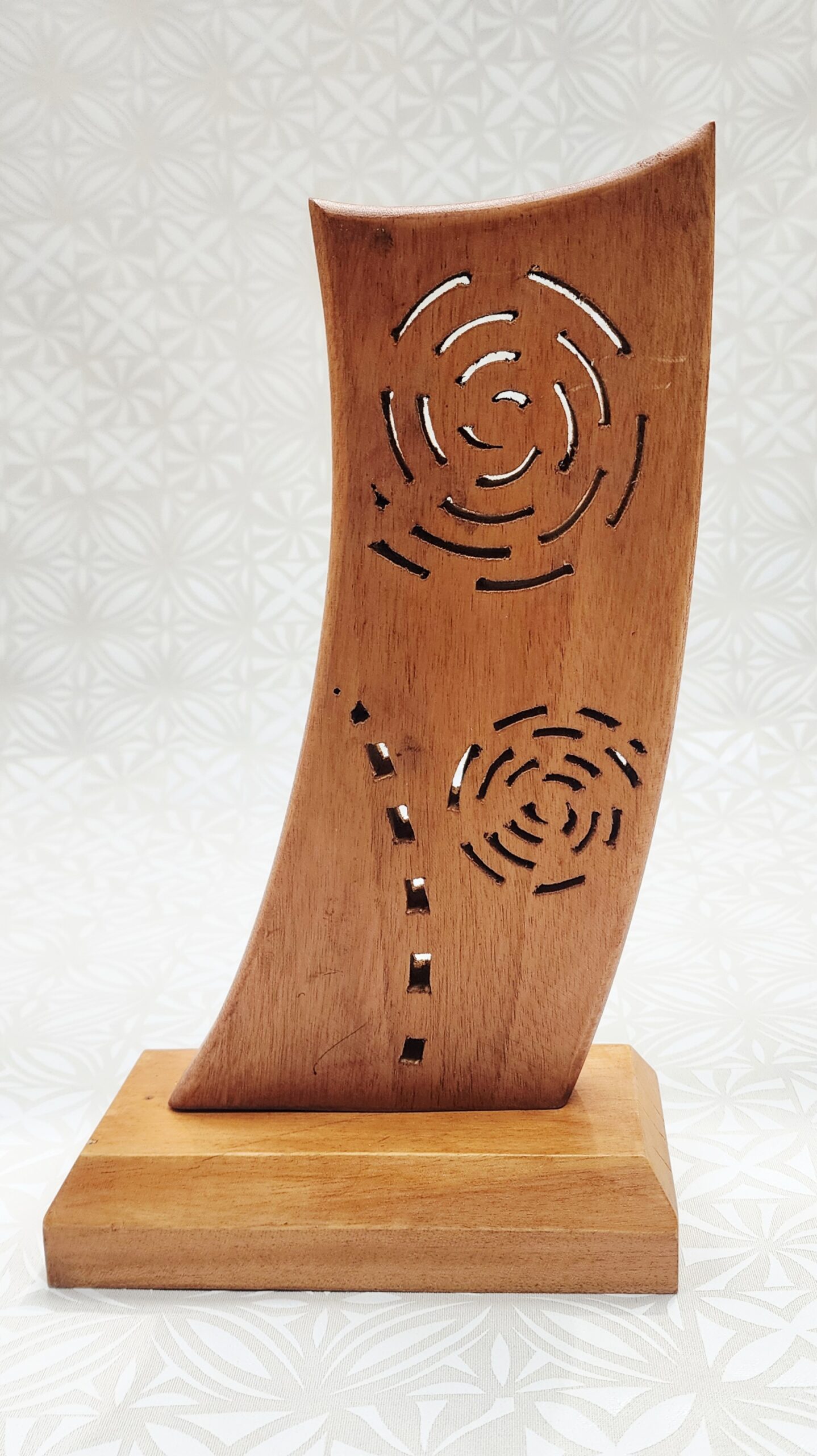 The detailed open-carving allows light to pass through the design, adding depth and visual interest from every angle. The sculpted surface highlights the skill of the carver while showcasing the natural beauty and grain of the timber.