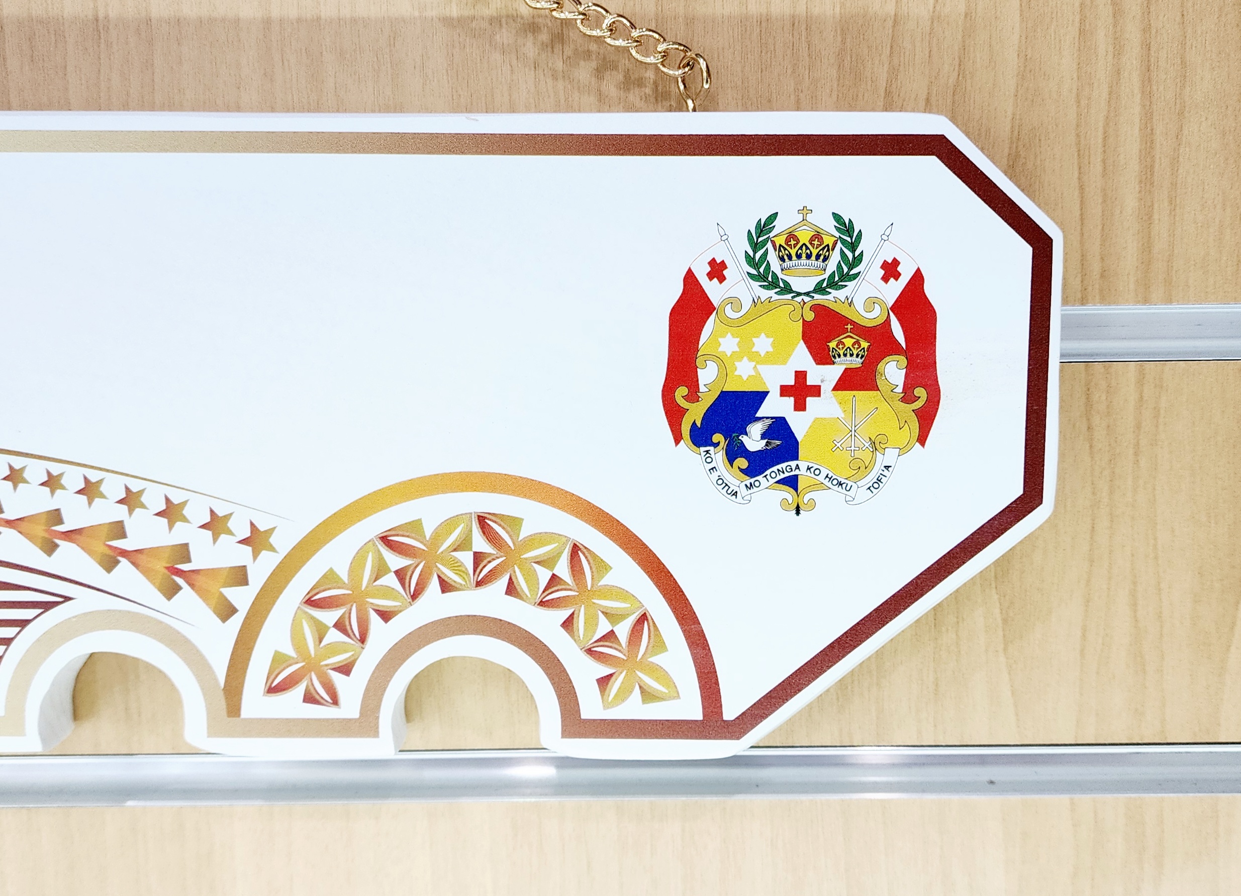 This birthday key is made out of solid timber with white base colour. On top of the white colour there is Golden Red Theme UV printed island patterns with coloured Tongan Sila on the far right hand side.