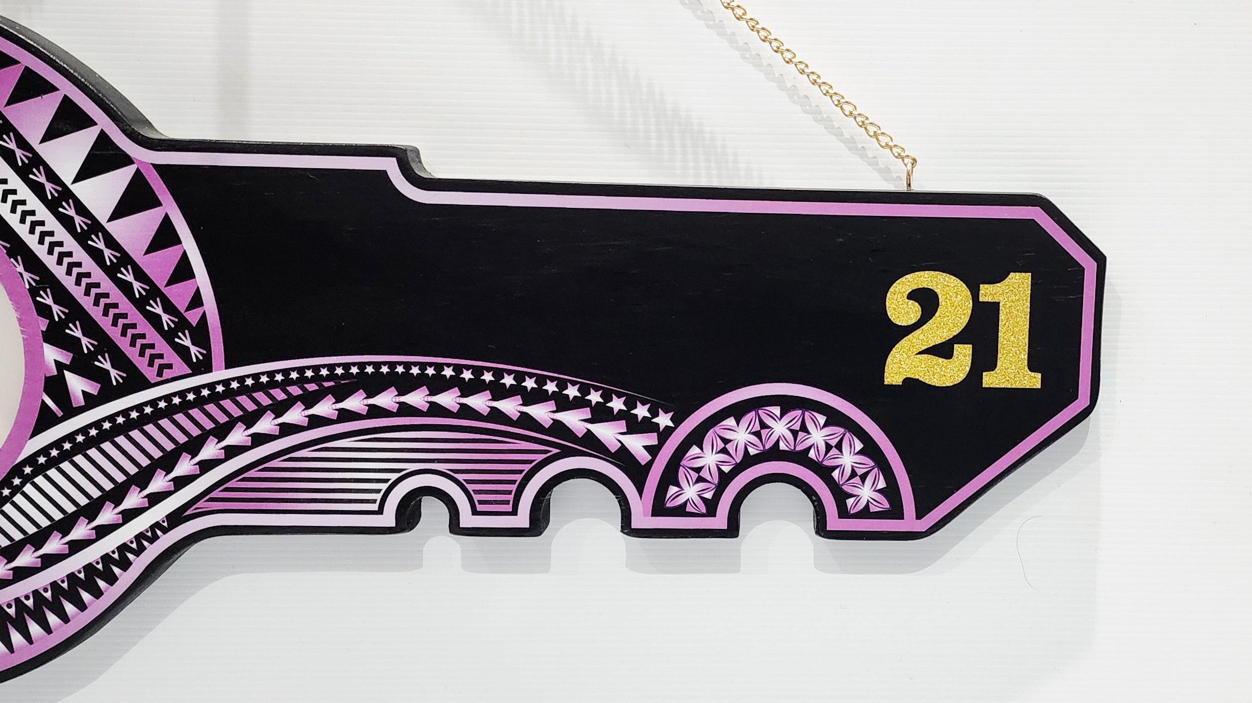 Celebrate a special milestone with this vibrant Island Design 21st Birthday Key, featuring a striking purple, white and black UV-printed colour theme. On the left side, a 12cm round photo space is framed with beautifully printed island motifs, perfect for showcasing a memorable picture. The far right displays a bold UV-printed “21” with a stunning golden glitter-look finish that stands out with style.