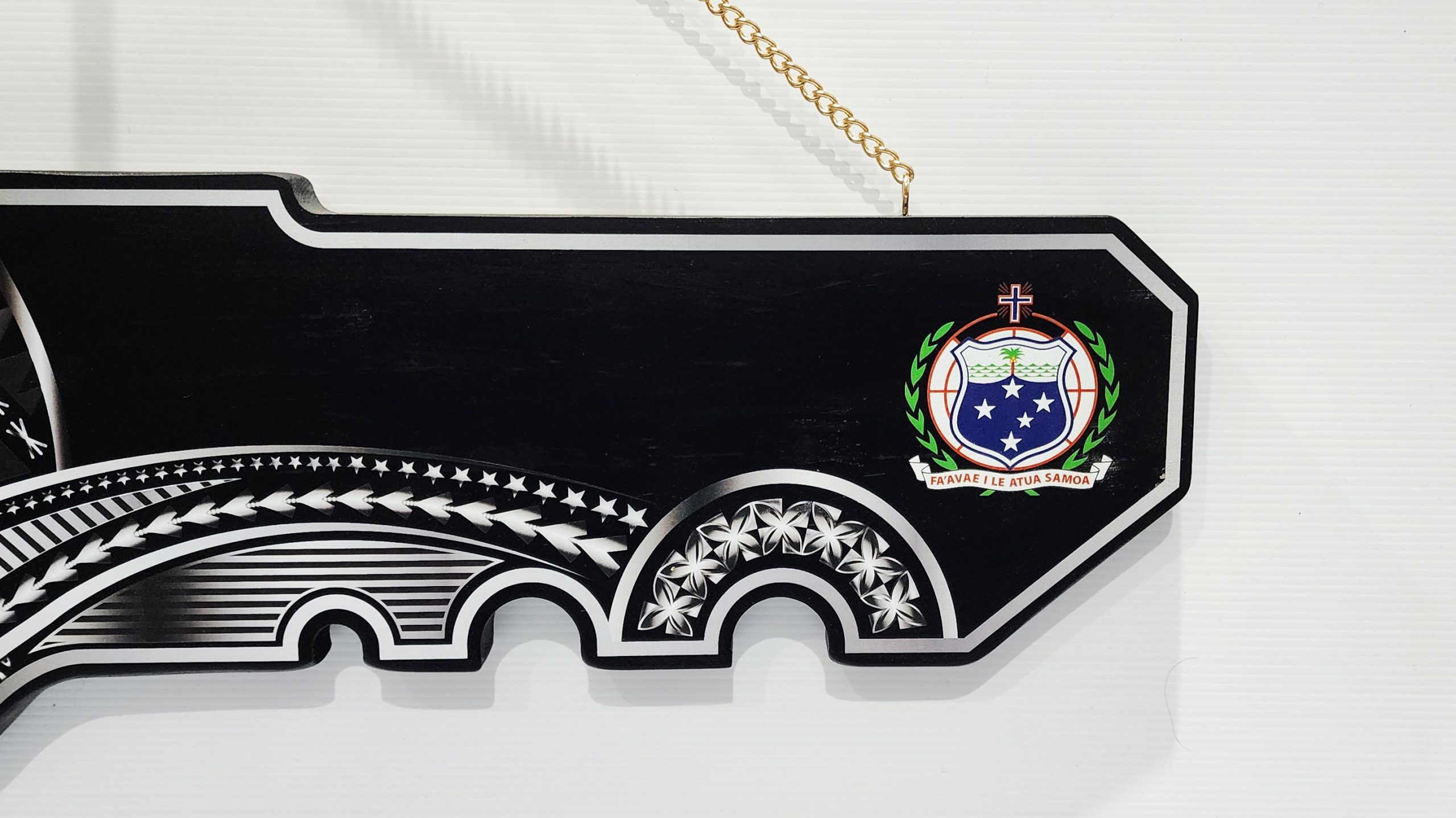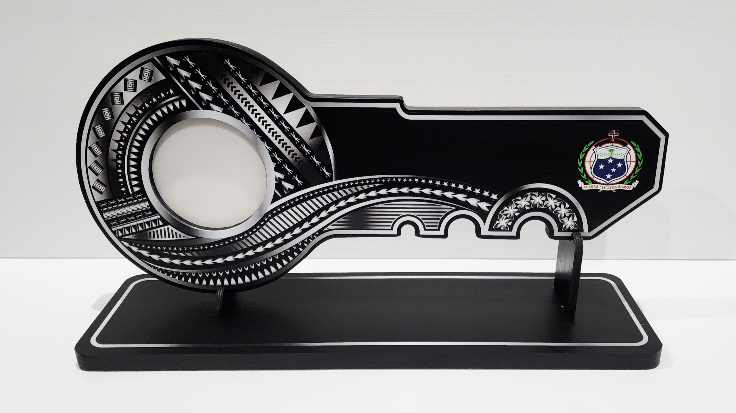 Celebrate a special milestone with our stunning Island Design Birthday Key, featuring a modern black and silver UV-printed finish. On the left side, a 12cm round photo space is beautifully framed with intricate island-style UV printed artwork, perfect for showcasing a memorable picture. On the far right, a striking Samoan Sila design is UV printed to honour cultural heritage. The key also includes a 220mm × 60mm area dedicated for custom engraving — ideal for adding a name, date, or personalised message.