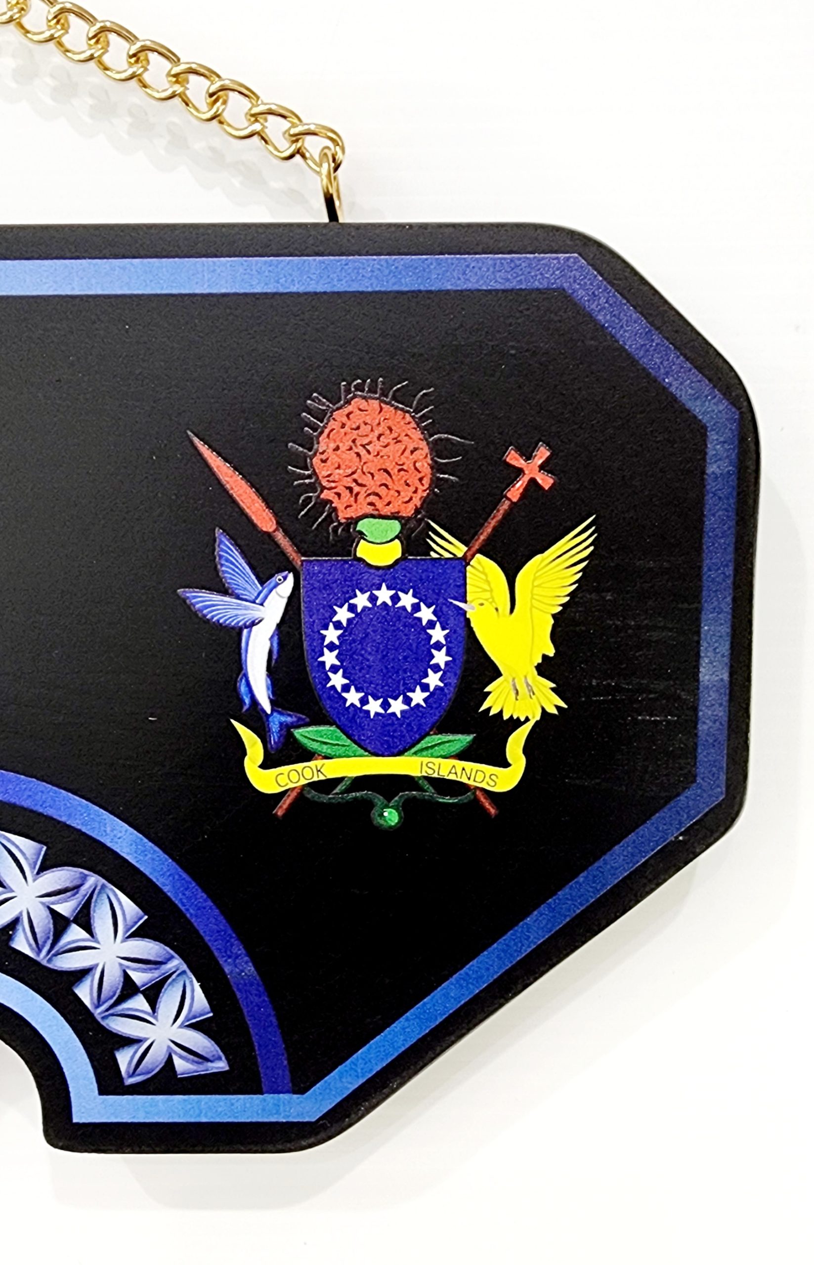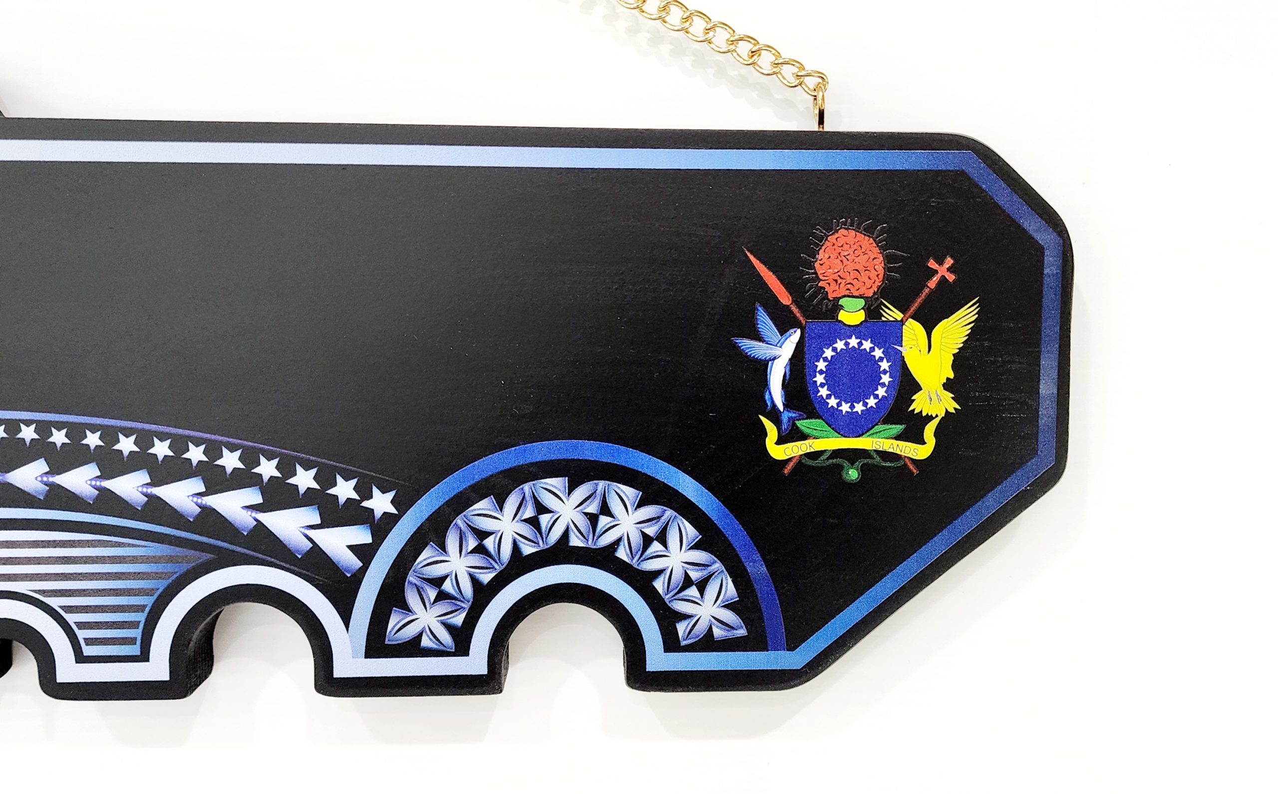 This birthday key is made out of solid timber with black base colour. On top of the black colour there is white & blue Theme UV printed island patterns with coloured Coat of Arms of Cook Island on the far right hand side.