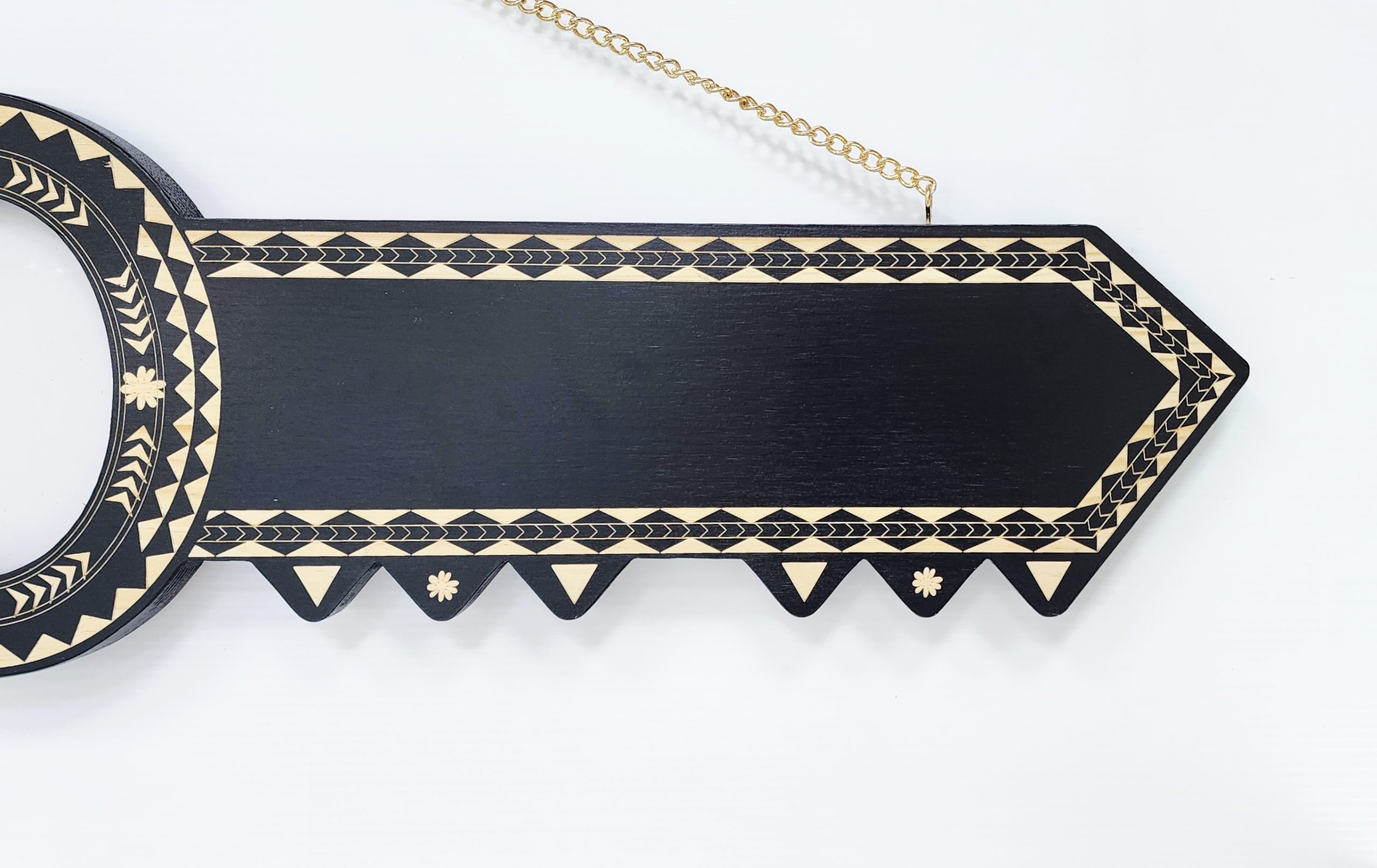 The key comes with a golden colour chain ready to hang on the wall. The black shade may vary due to the natural wood variations.