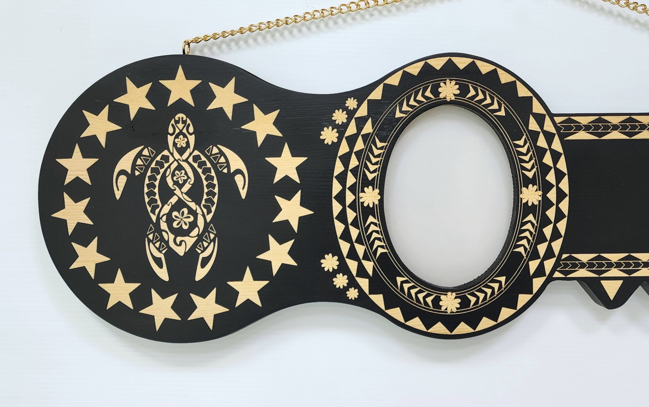 This beautifully crafted 21st birthday key is made from solid timber and adorned with detailed, laser-engraved island-inspired patterns across its entire surface. On the far left, it features 15 laser-engraved stars, while the center displays a striking laser-etched turtle design. A bold number “21” is prominently engraved on the far right. The key also includes an oval cutout measuring 90mm x 125mm—perfect for displaying a photo of the birthday person. Beneath that, a spacious area of 60mm x 220mm is provided for a custom engraved message, making it a truly personal keepsake.