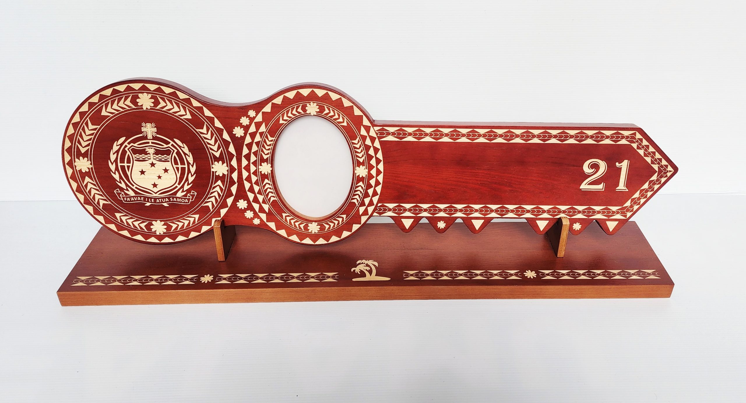 Celebrate a special 21st milestone with this beautifully crafted Island Design 21st Birthday Key. Expertly made from solid timber, it features intricate laser-engraved island patterns inspired by traditional Samoan motifs, including the Samoan Sila in the centre on the far left.