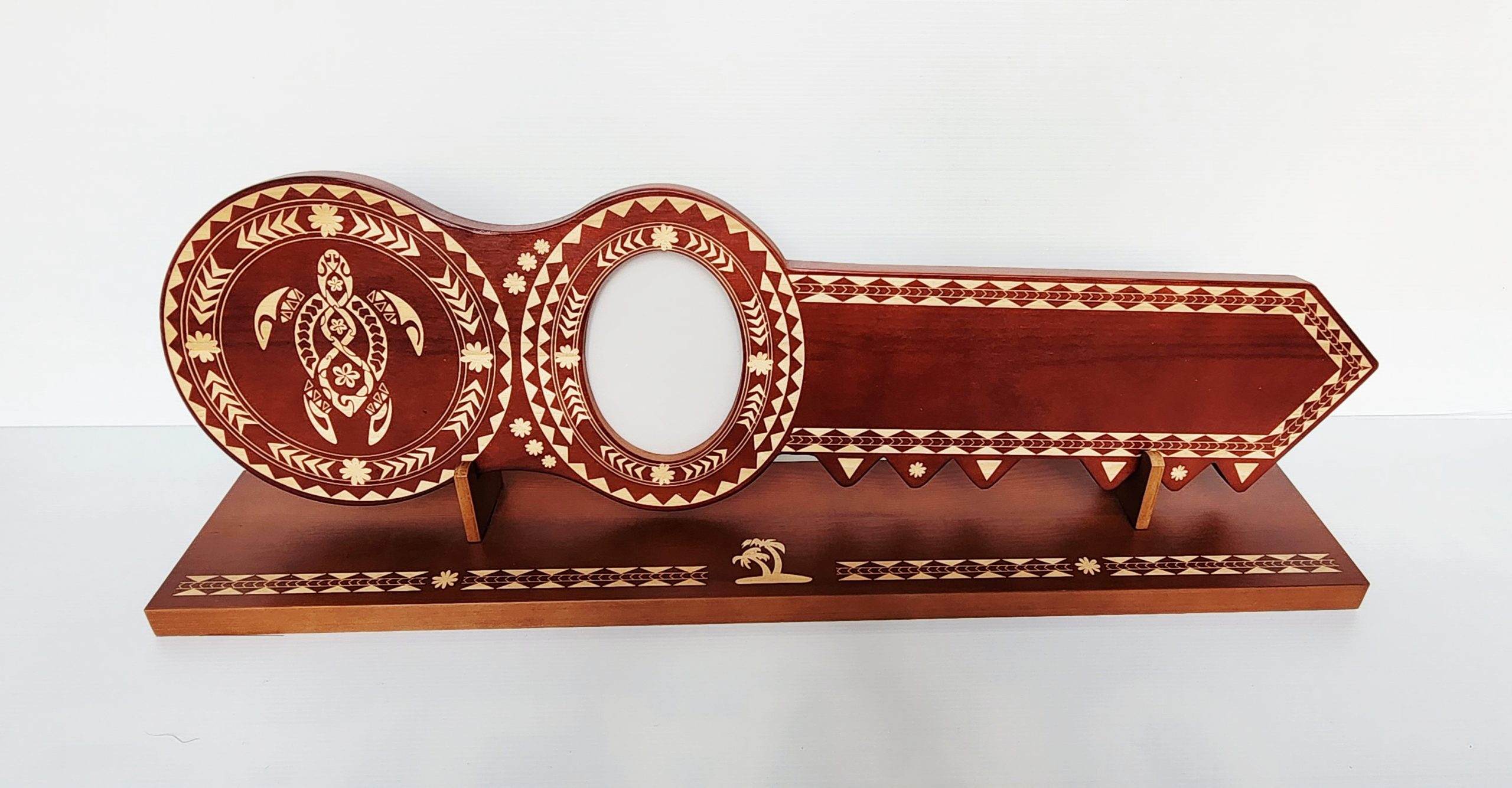 Celebrate a milestone in true island style with this beautifully crafted wooden birthday key. Made from solid timber, it features detailed laser-engraved island patterns for an authentic, tropical look. On the left side, intricate motifs surround a central turtle design symbolising longevity and strength. The key includes an oval-shaped photo cut-out measuring 90 mm x 120 mm, perfect for a cherished picture. On the right side, a 220 mm x 60 mm space allows for personalised engraving to include a name, date, or heartfelt message—making it a meaningful keepsake for birthdays or special occasions.