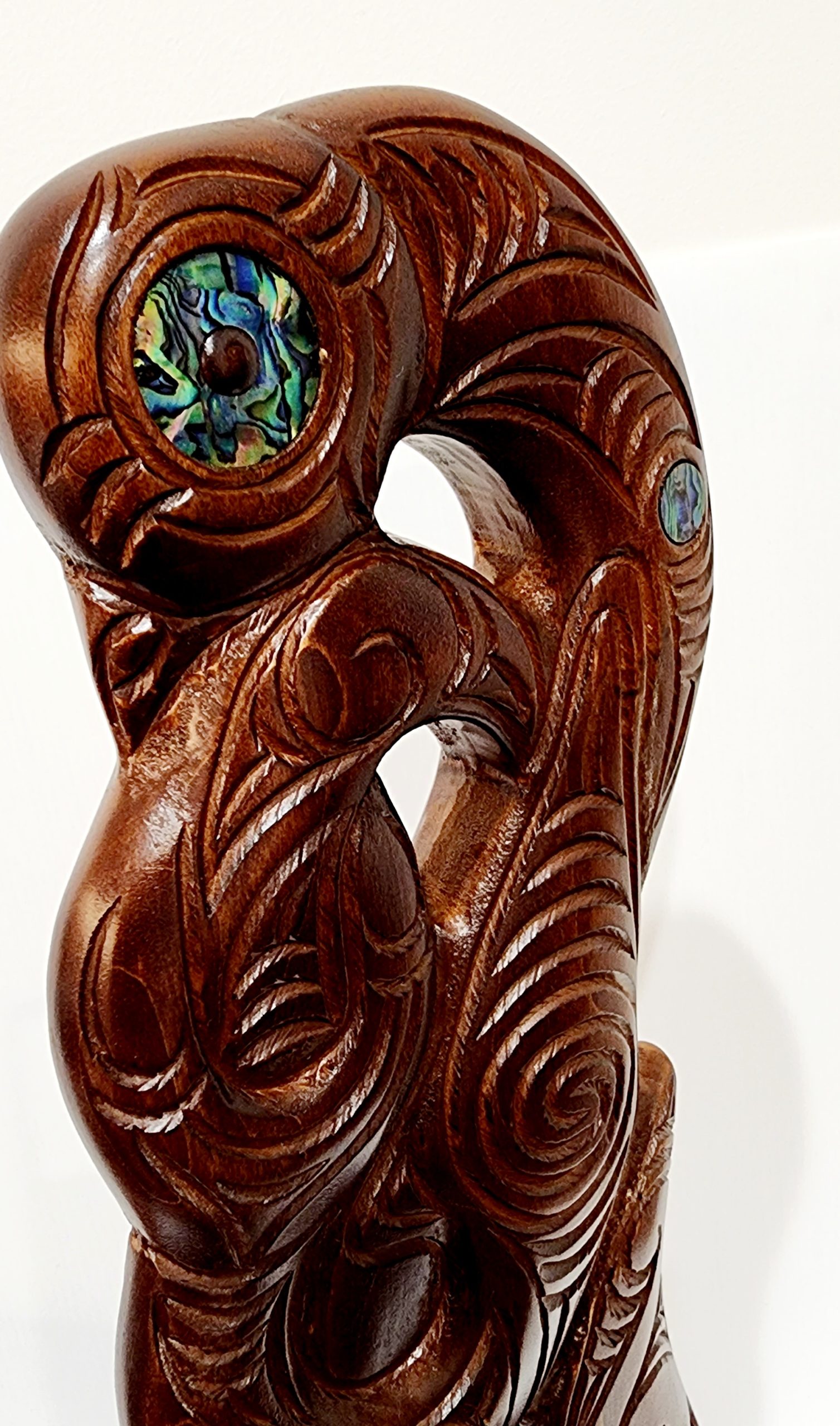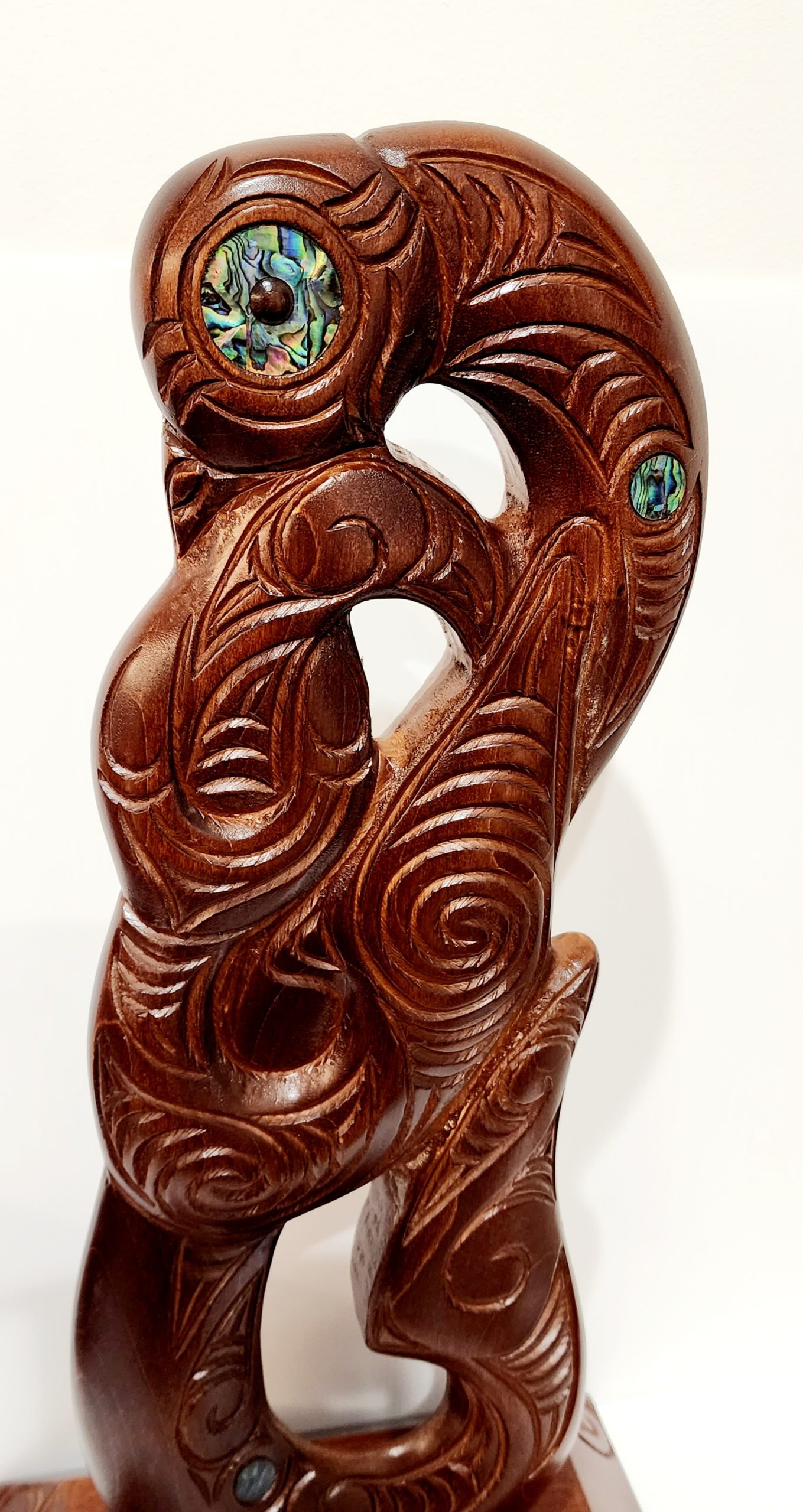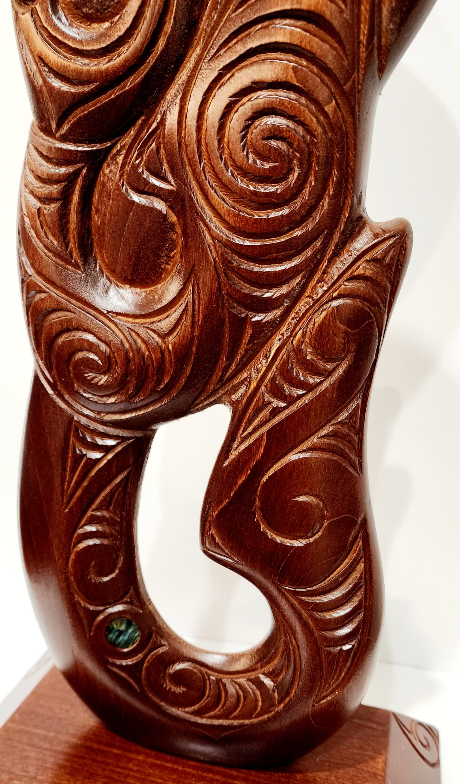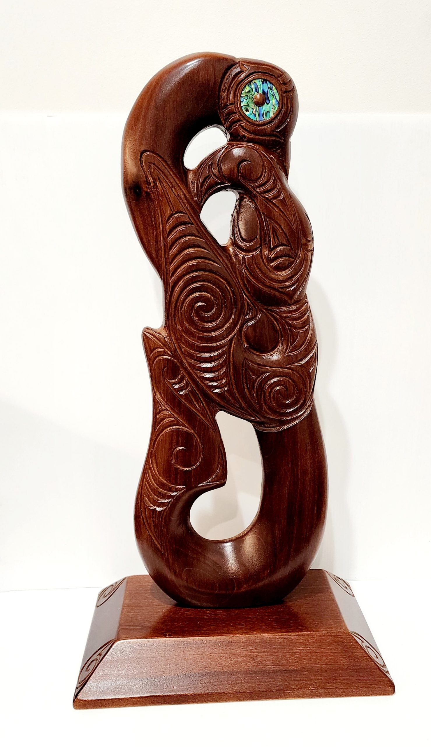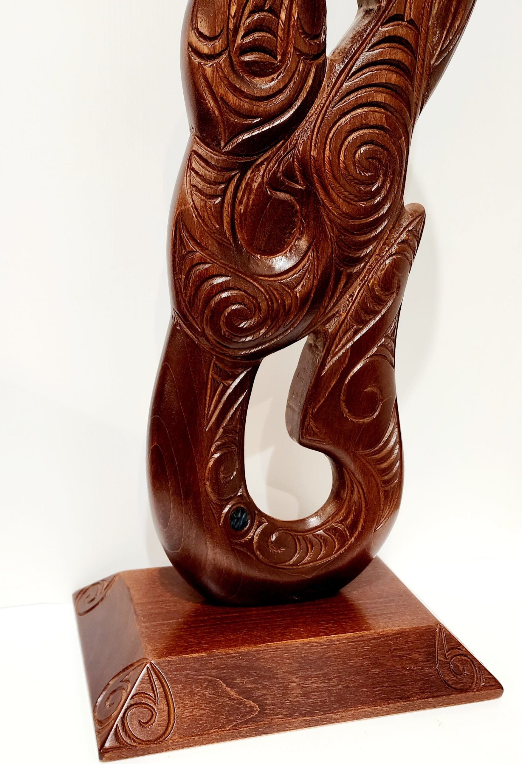 Large Carved Maori Hei Matau (Fish Hook) from Kauri Wood with Paua Shell Eyes on Stand