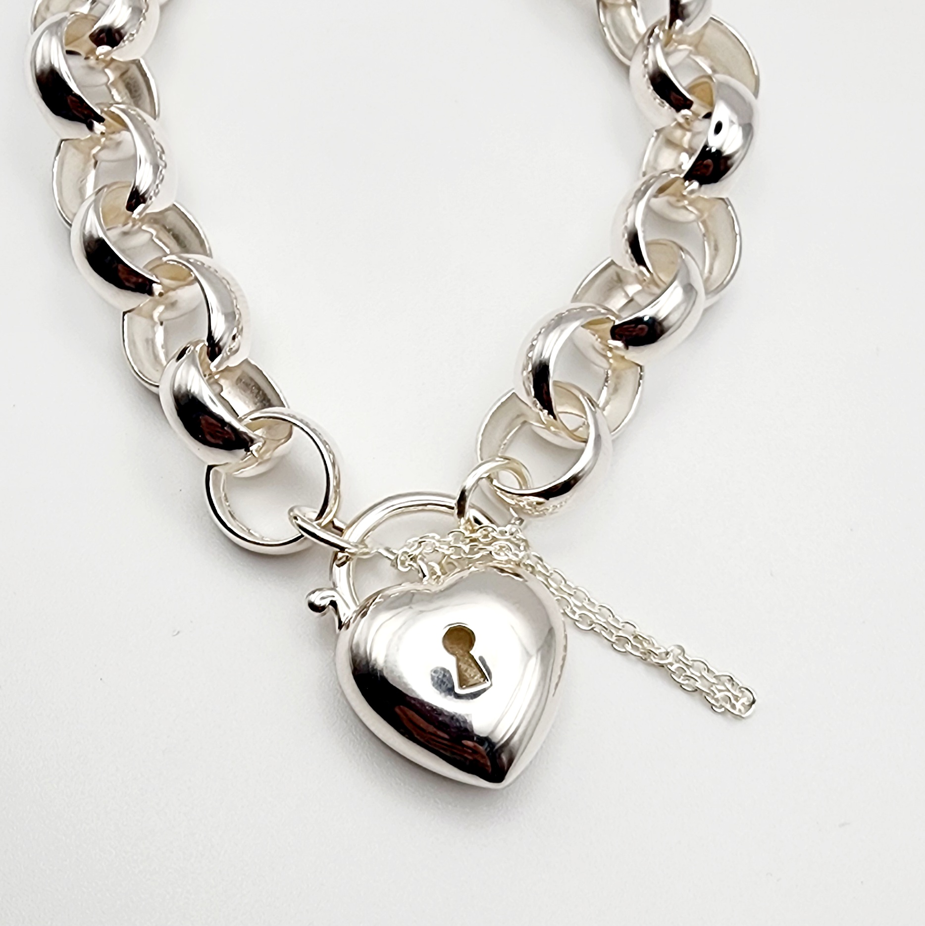 Large Sterling Silver 25cm Round Belcher Bracelet With Puff Heart Padlock