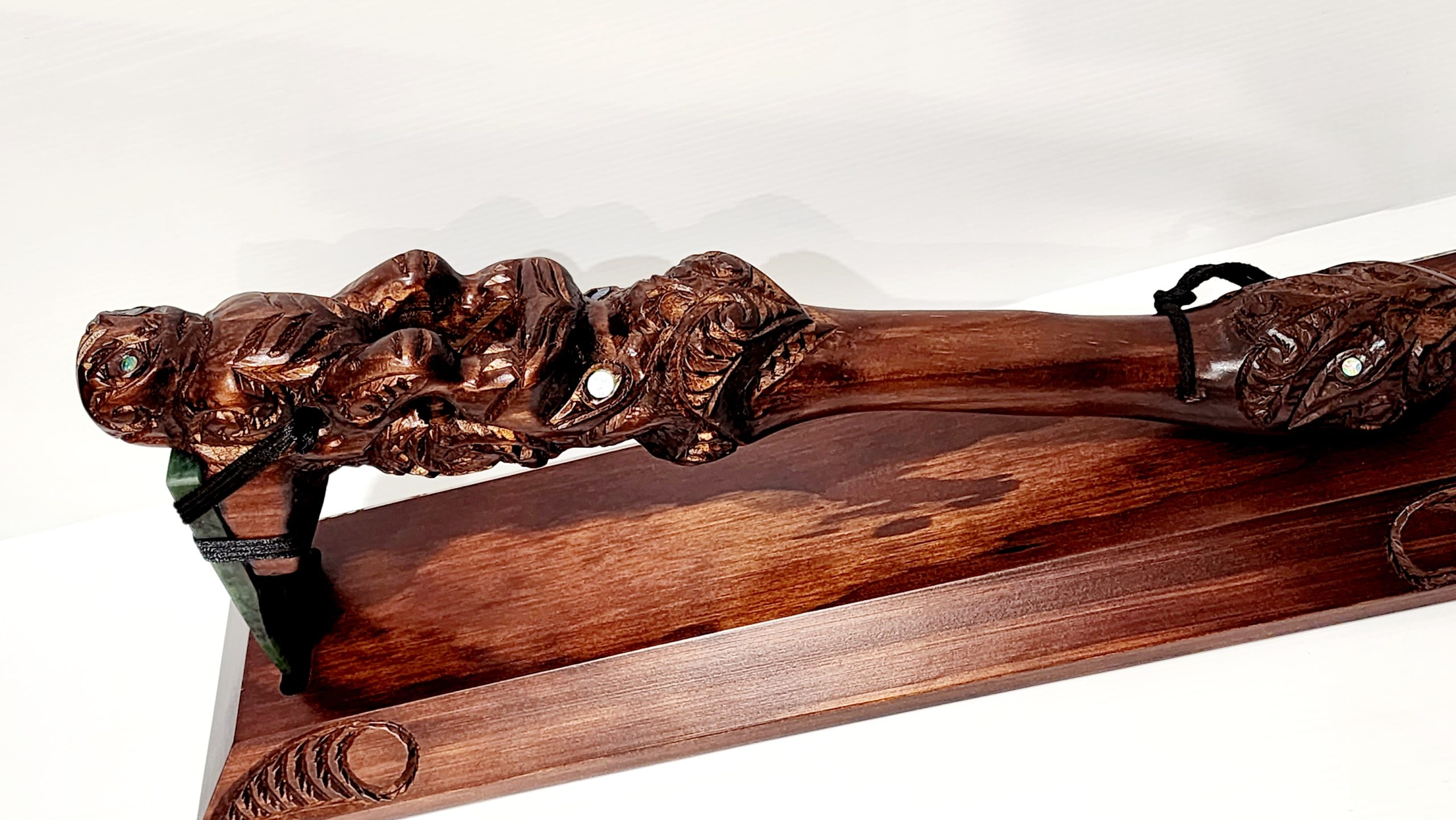 Large Wooden Carved Toki Poutangata, or Adz with New Greernstone Blade on stand