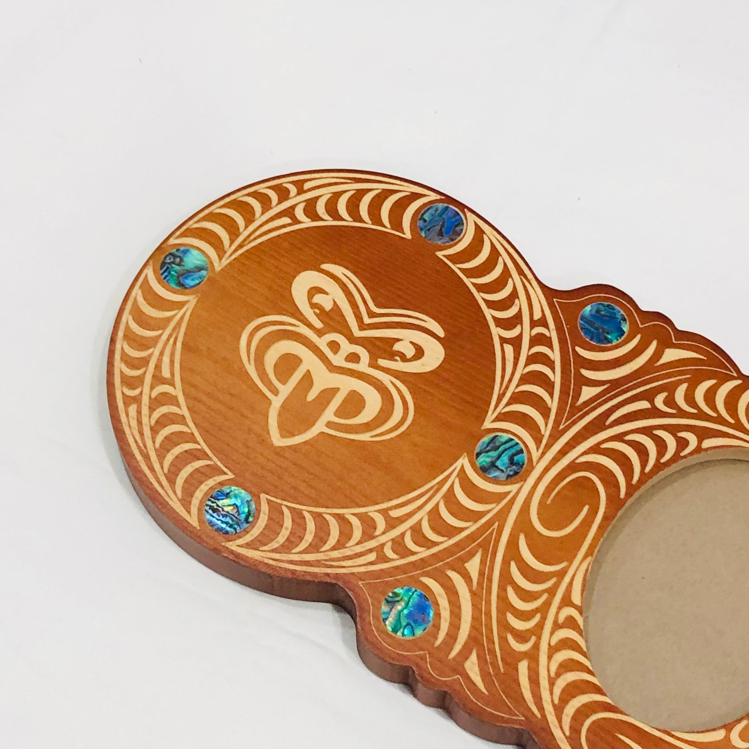 The key has got?laser engraved Tiki face?in the middle of the circle on the far left with 9x round paua shell disk inlay around the key.