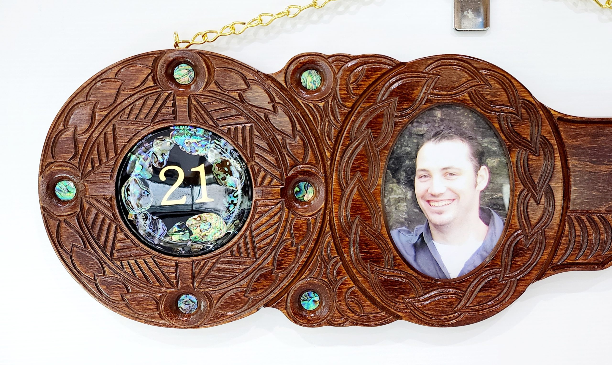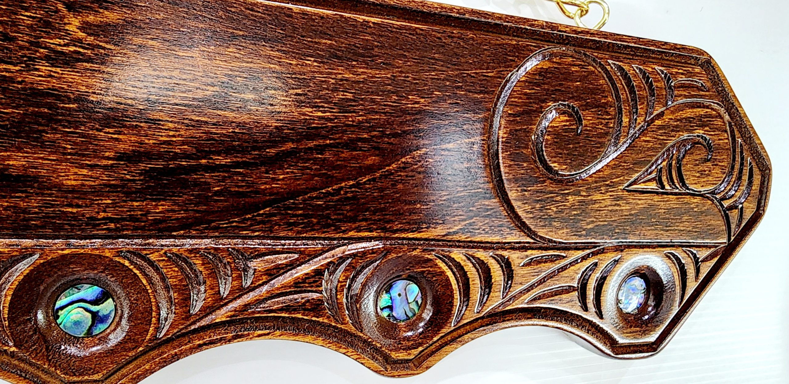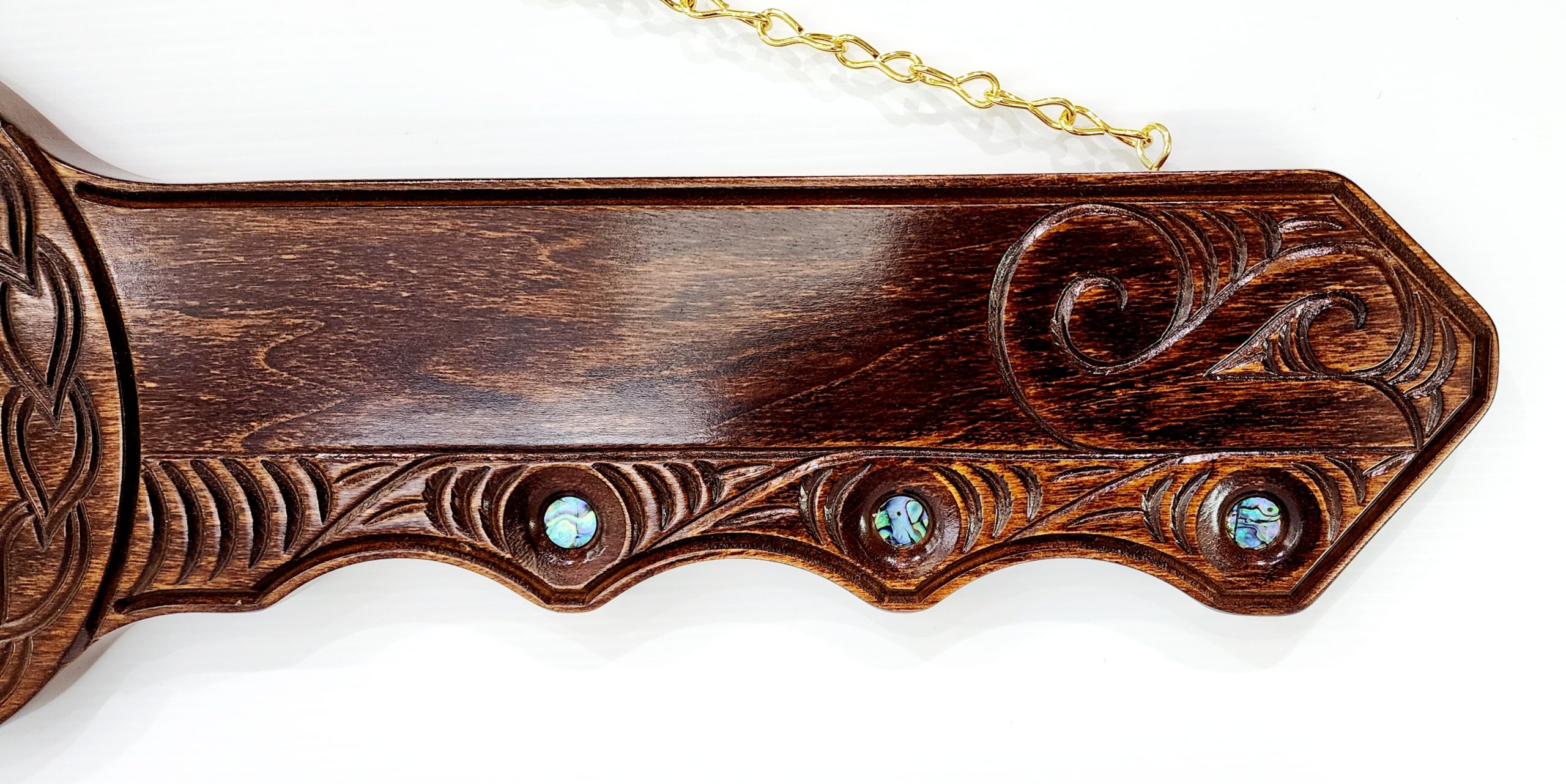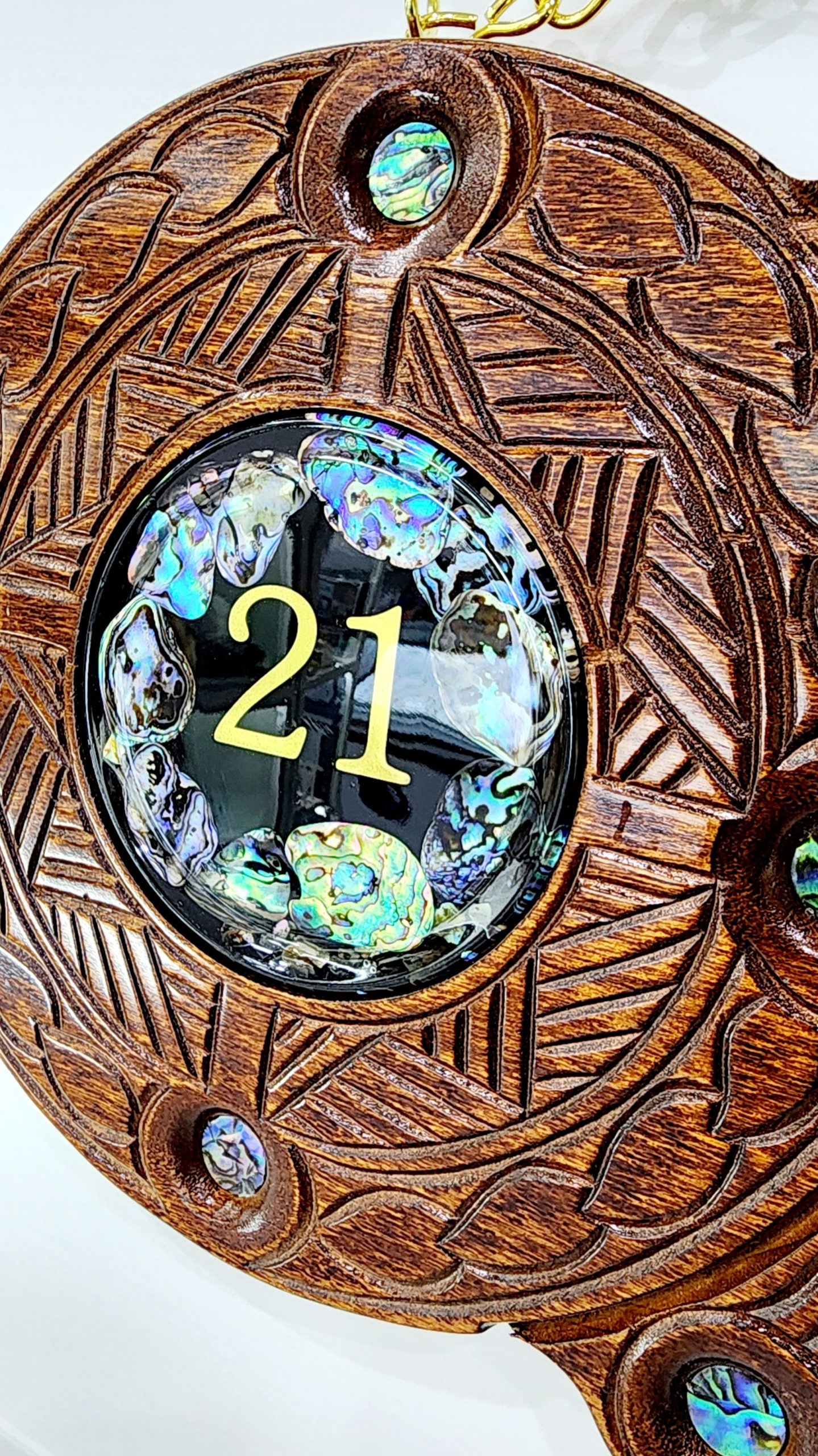Maori / Island Mixed Design Hand Carved 21st Wooden Key with “21” Paua Shell Disk Insert